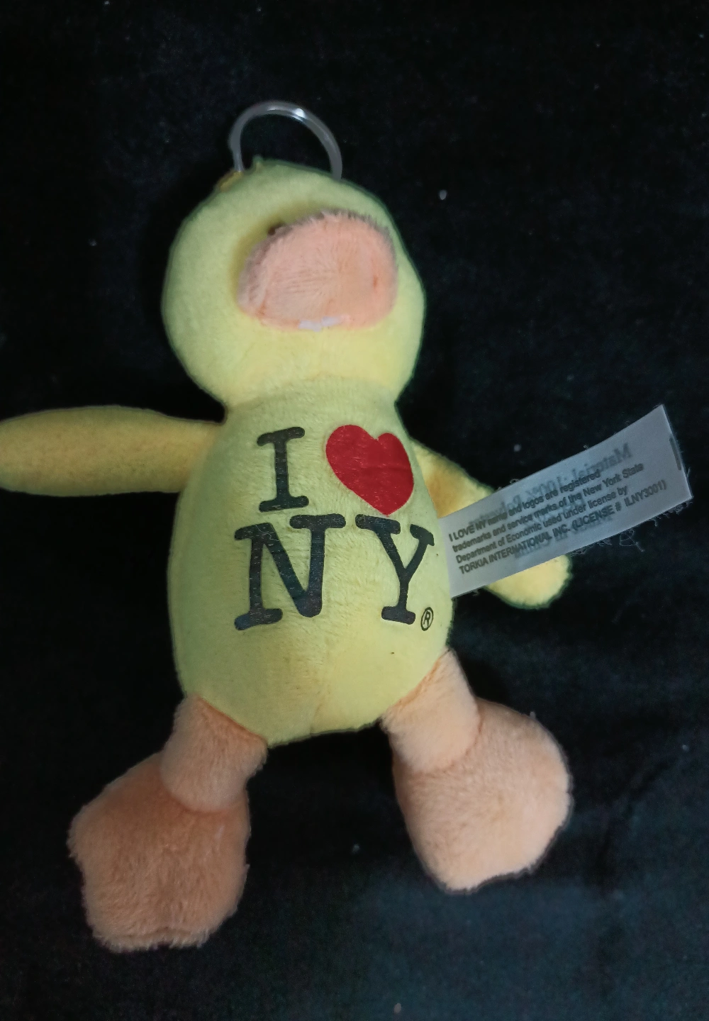 Adorable yellow plush duck keychain. Features "I love NY" design. Small, collectible item.
