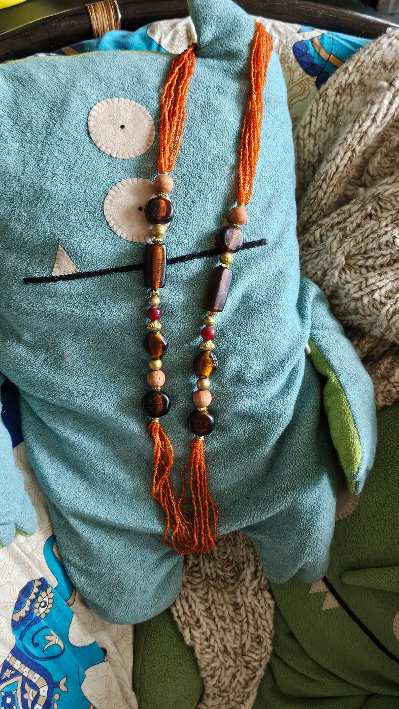 Vintage orange beaded necklace with various coloured stones and wooden accents. From the '70s. Lobster clasp closure. Long length.