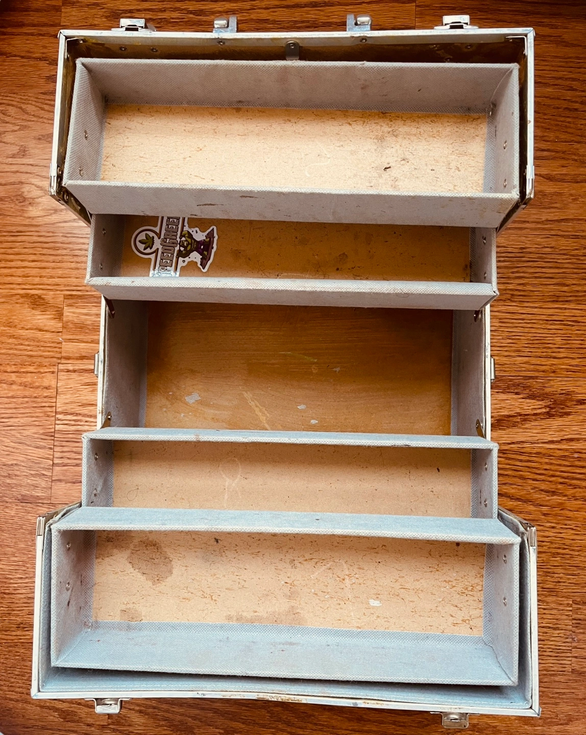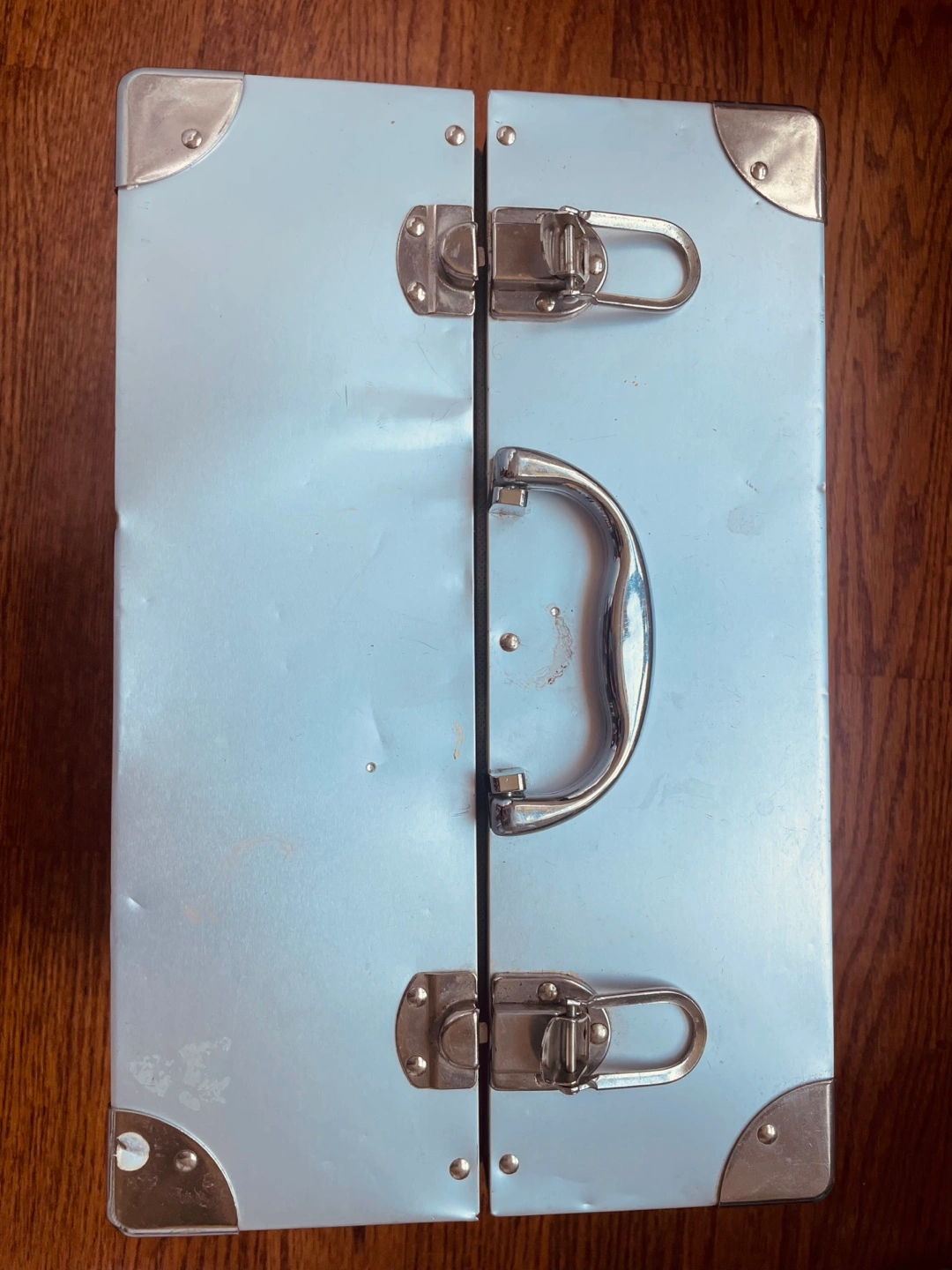 Silver metal cosmetic carrying case. Multiple internal compartments. Features a metal handle and clasps. Shows some wear but can definitely be revived.