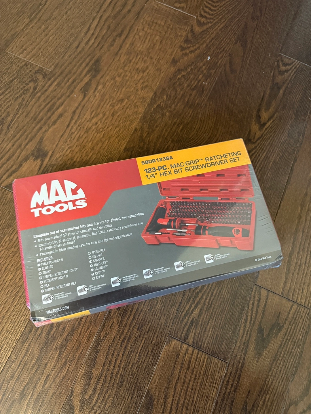 97Brand new sealed Mac tools 123 pieces Mac-Grip ratcheting 1/4 HEX bit screwdriver set, part number SBDR123SA. Great quality and hard to find. Pickup in Vaughan or Woodbridge.