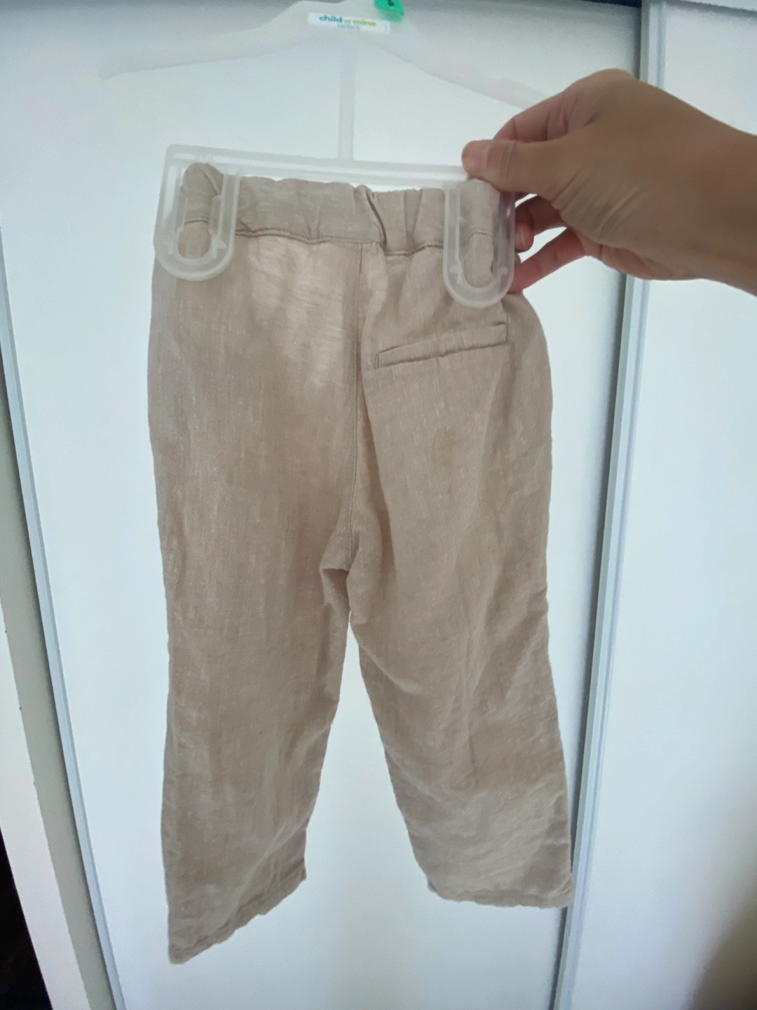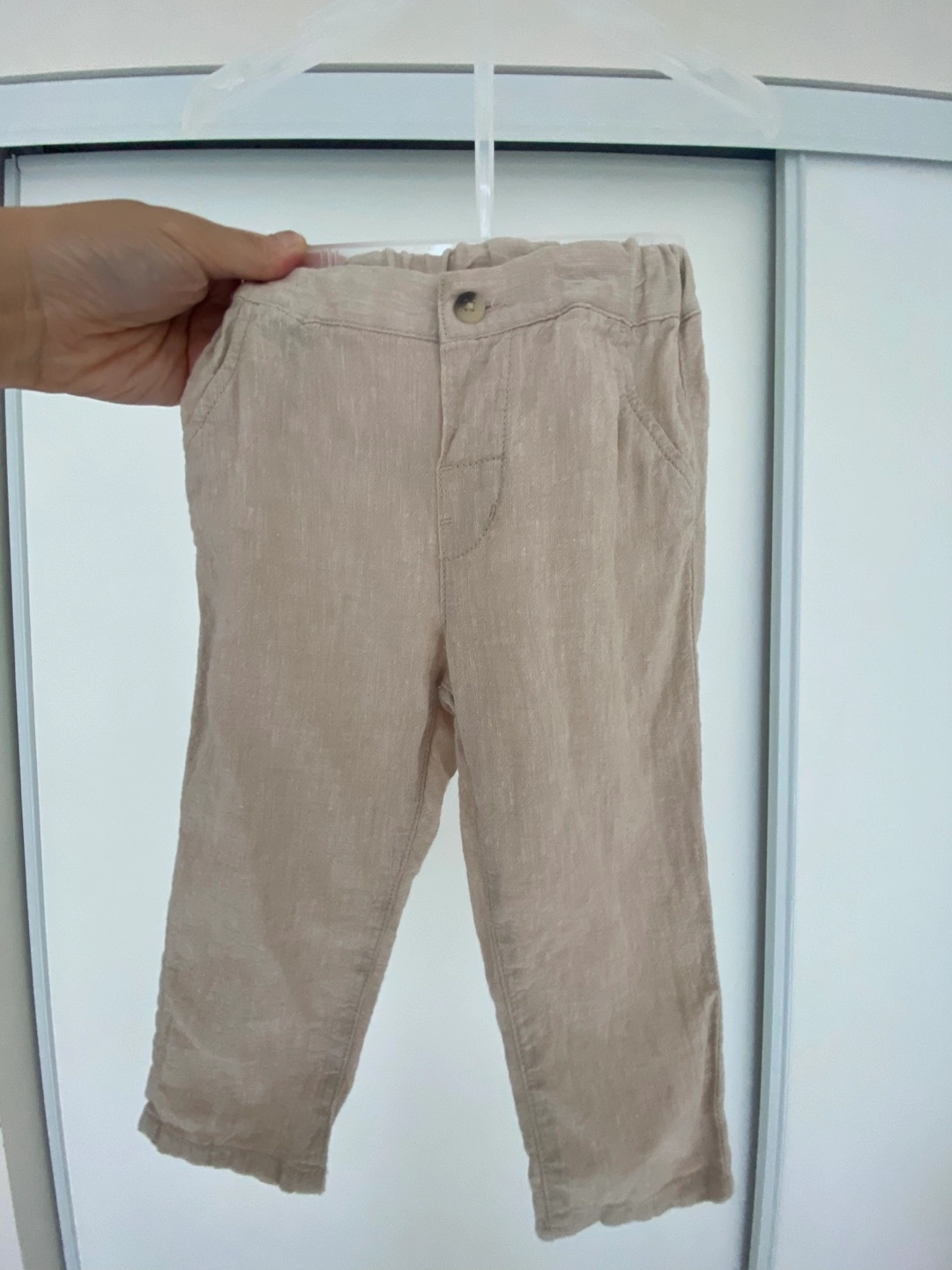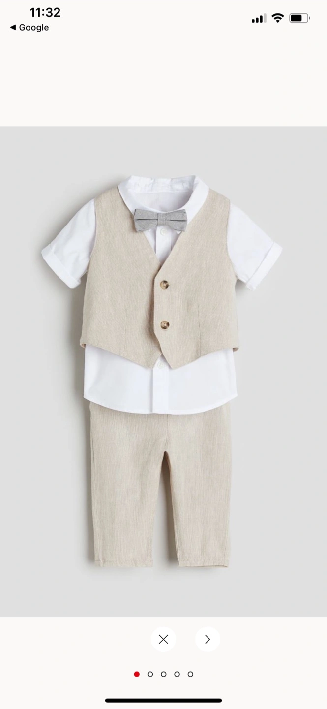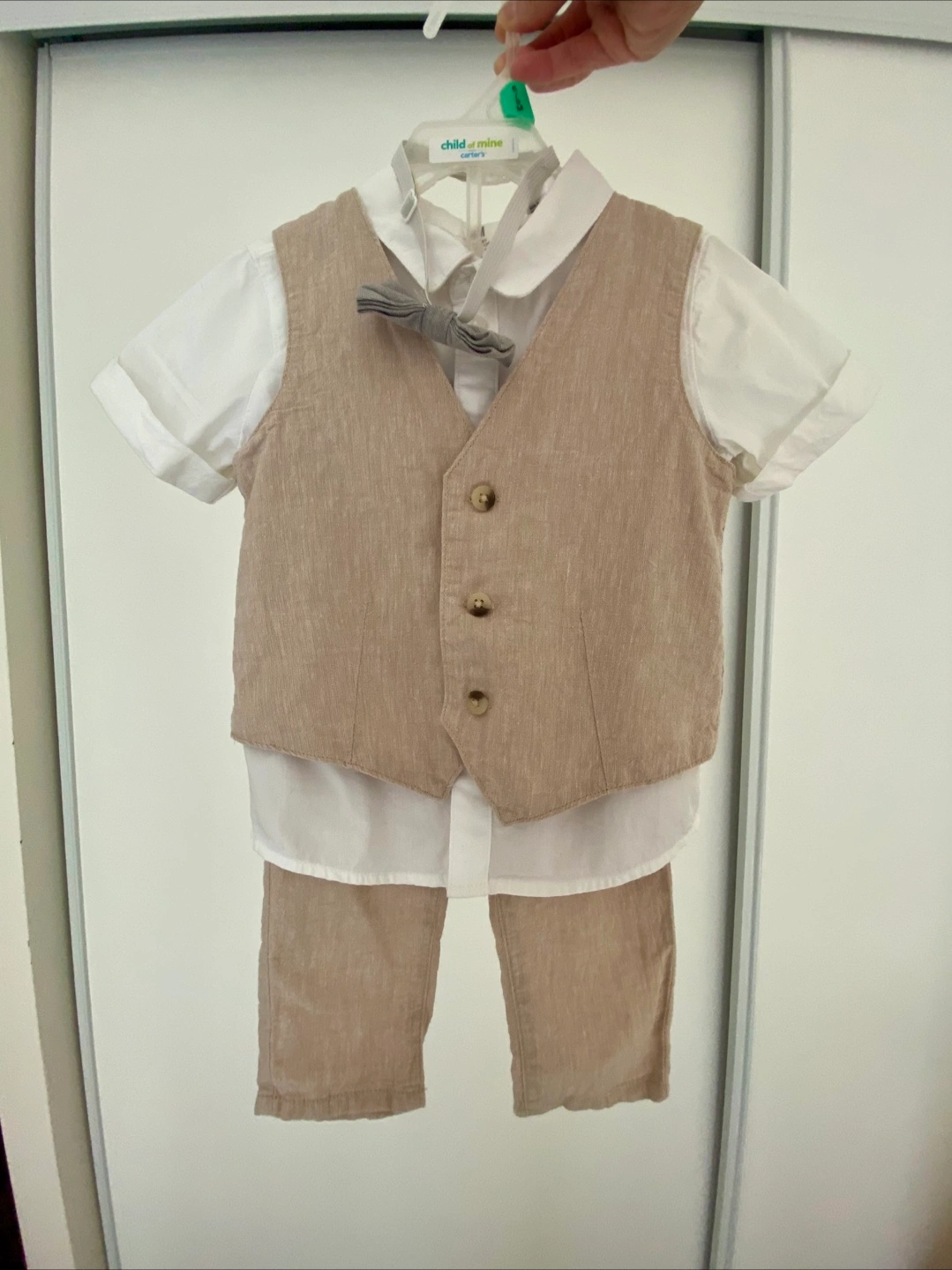 Adorable baby boy outfit. Dressy set with vest and pants in woven linen + cotton blend, short sleeved shirt in cotton poplin and grey bow tie. Pants have adjustable elasticized waistband, mock fly with button, mock side and back pockets. Perfect for special or semi-formal occasions.