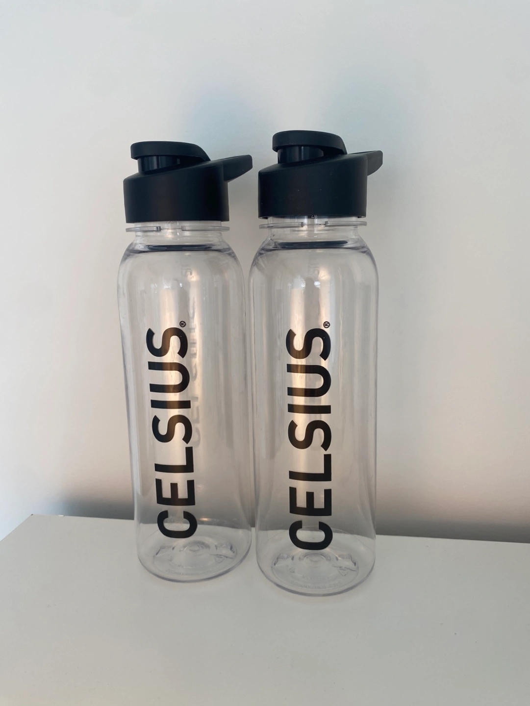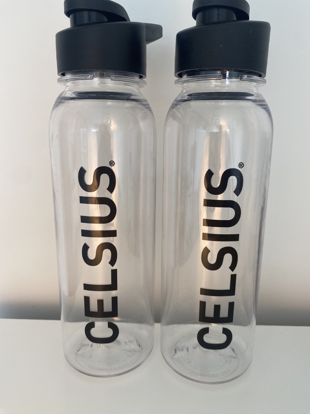 Two clear plastic water bottles. Black lids with flip-top spouts. Celsius branding on each bottle.