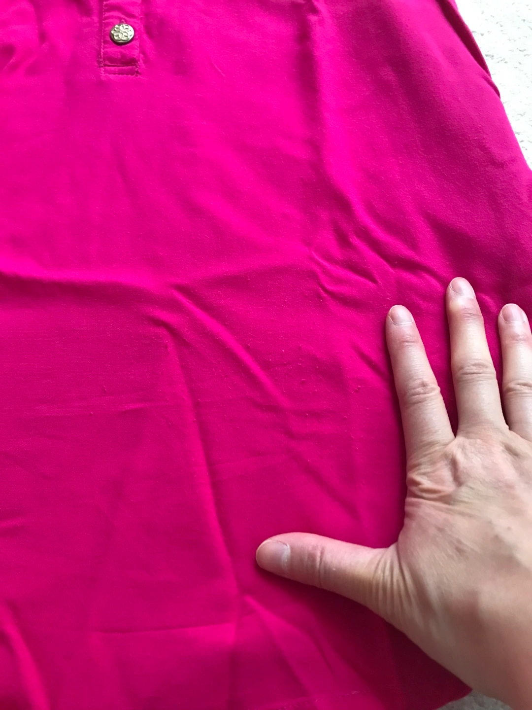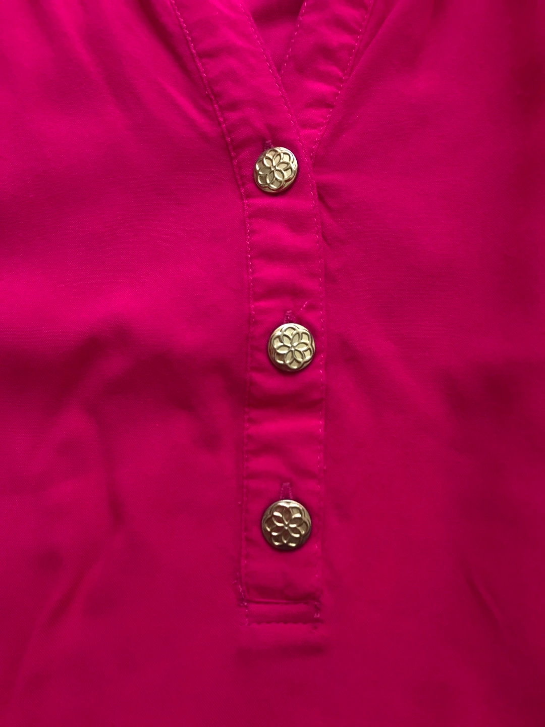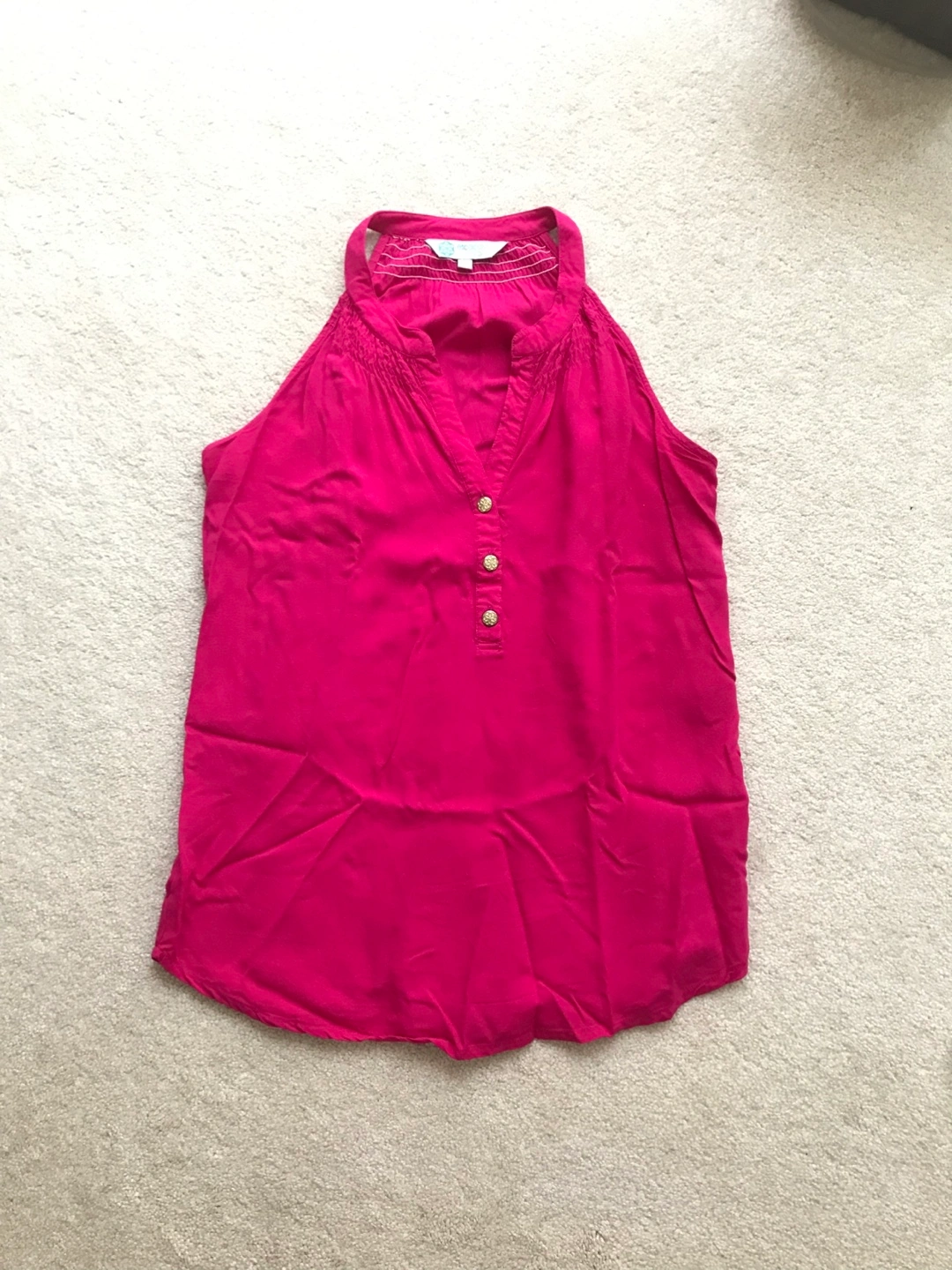 Women's sleeveless pink top. Halter neck design. Features a V-neckline and three gold buttons. Size small. 100% rayon. Slight pilling on front as per last photo