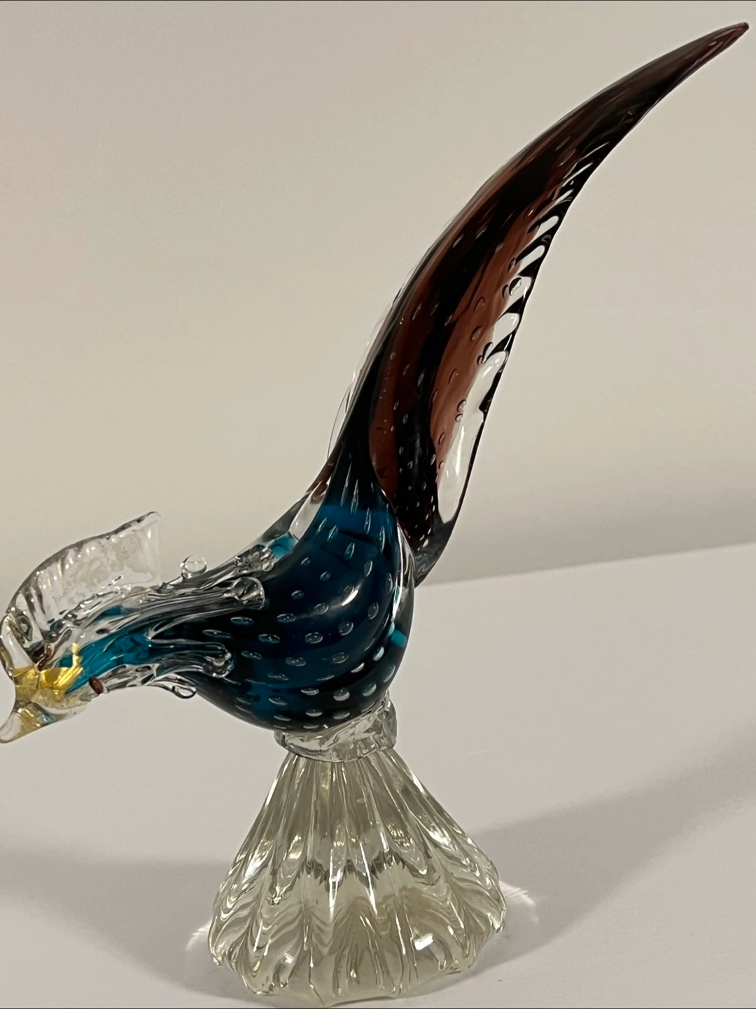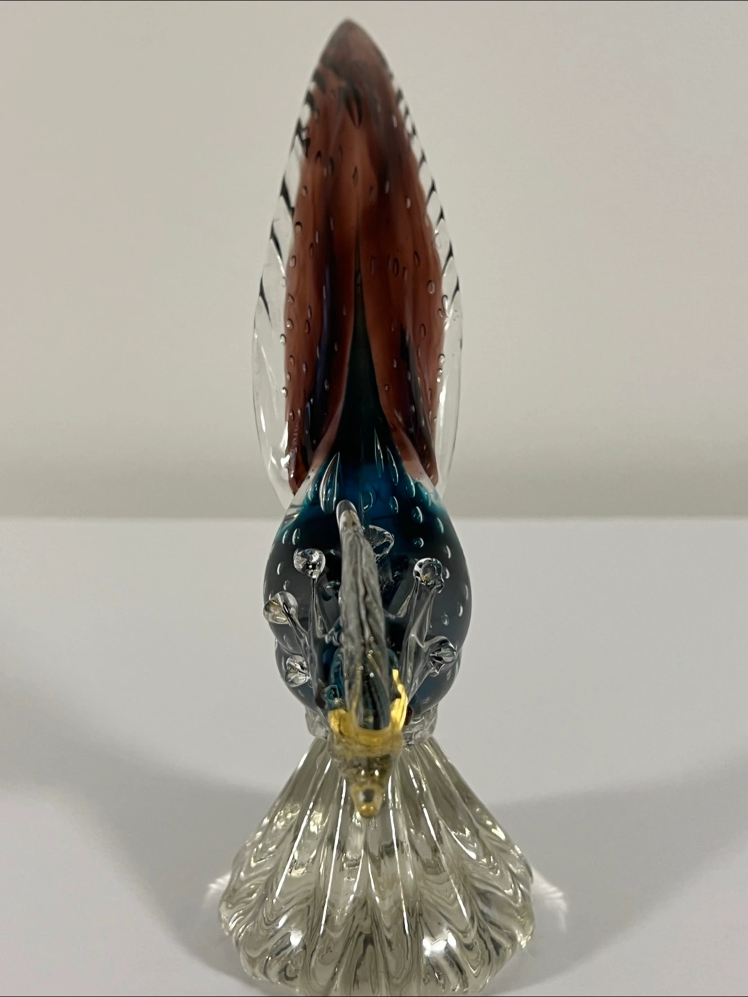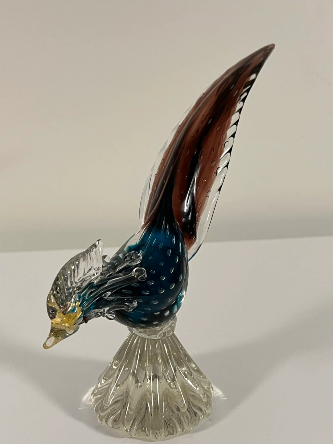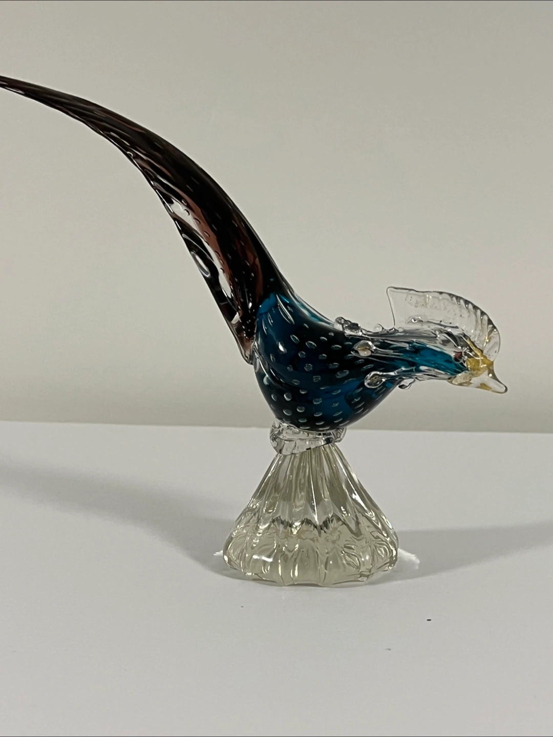Beautiful hand blown glass pheasant. Teal and brown colours. Clear glass base. Unique collectible piece. Stickered Measures approximately 6 inches tall.