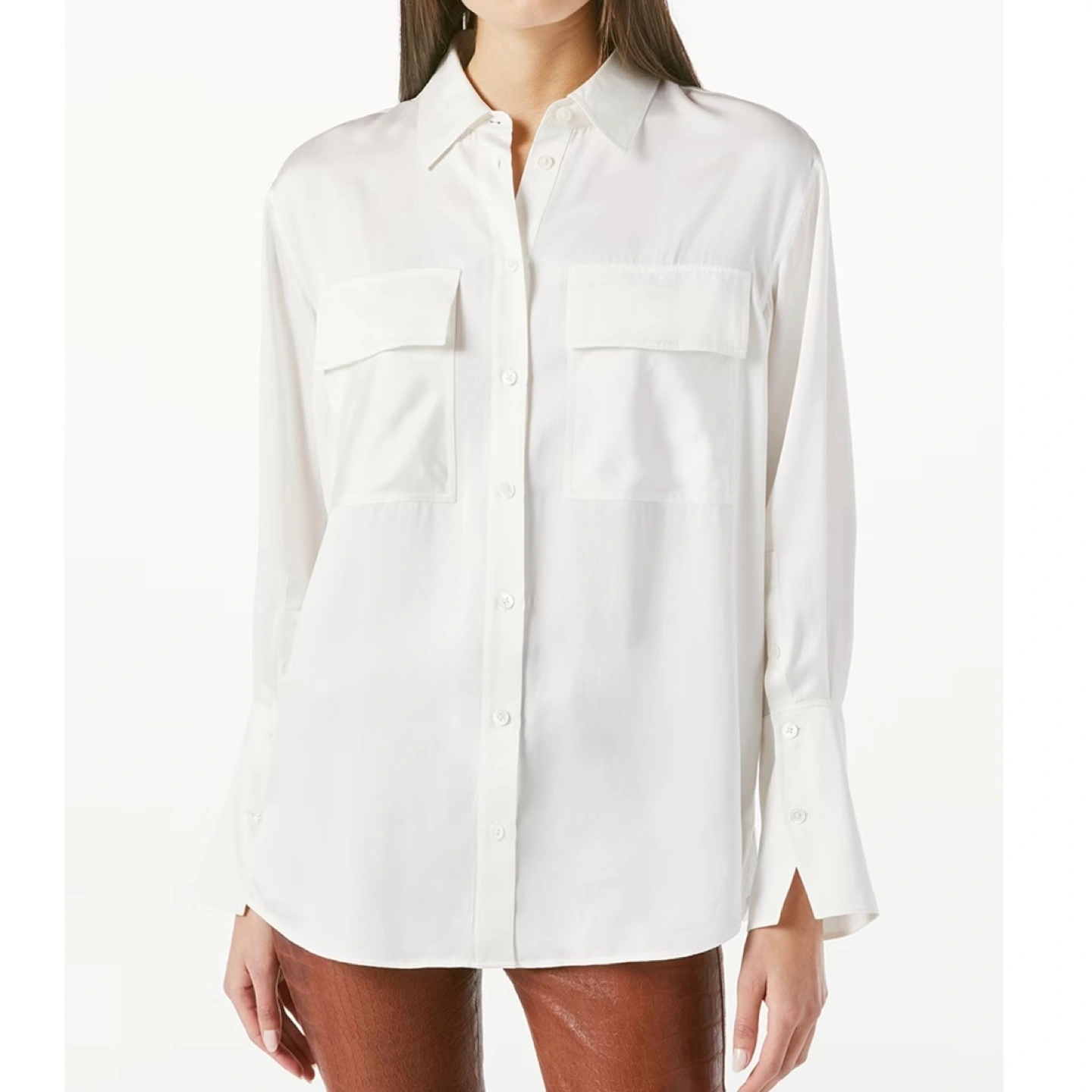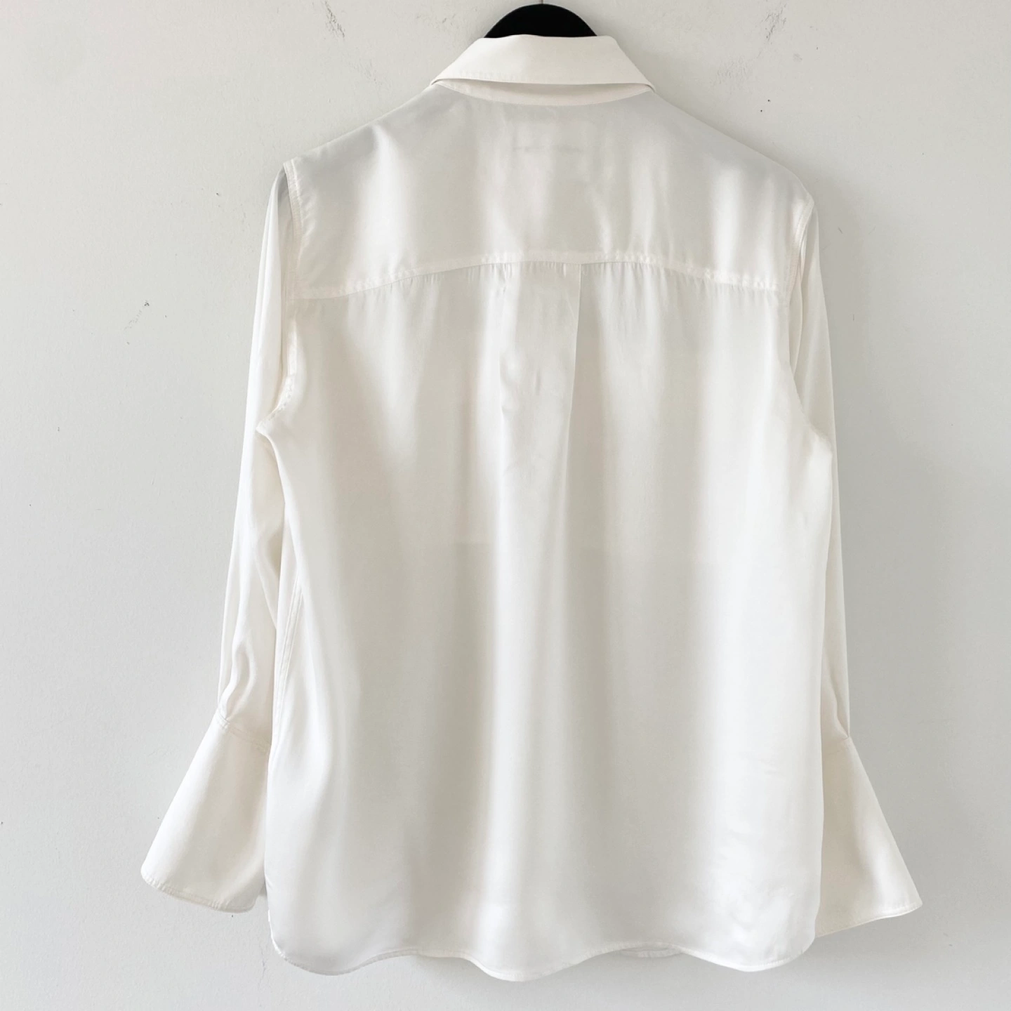 Frame boyfriend button-up shirt. Feature chest pockets and exaggerated cuffs with an oversized fit. Made of lightweight 100% silk in a off-white colour. It's incredibly soft, airly, luxe and drapes like a dream! Well made - inside seams are finished with french seams for extra clean finish and quality. There's no staining or damage. It's clean and in excellent condition.