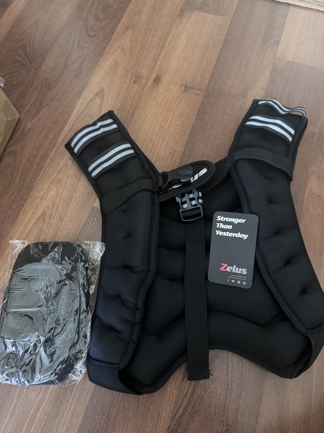 Black weighted vest, adjustable straps. Includes pouch. 10lbs