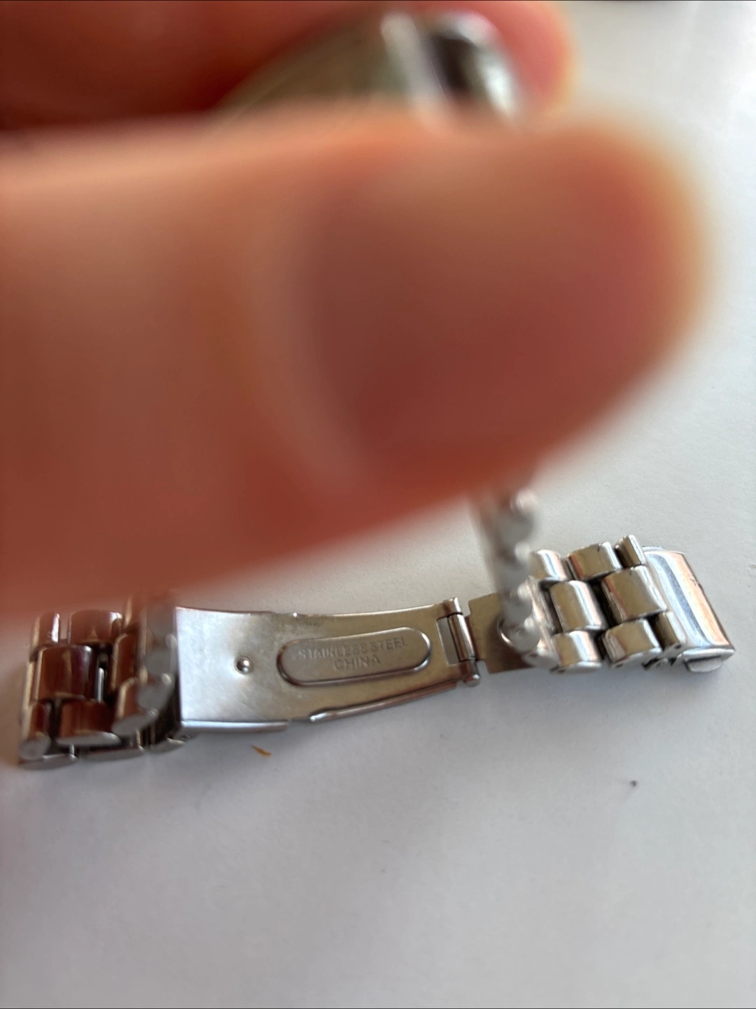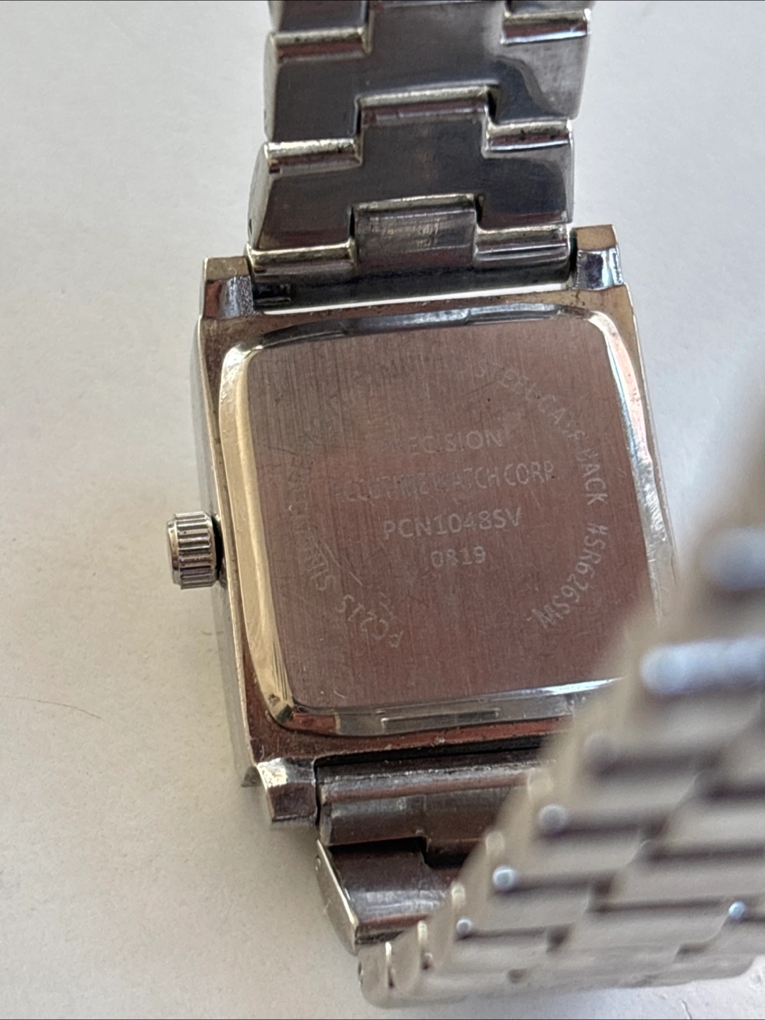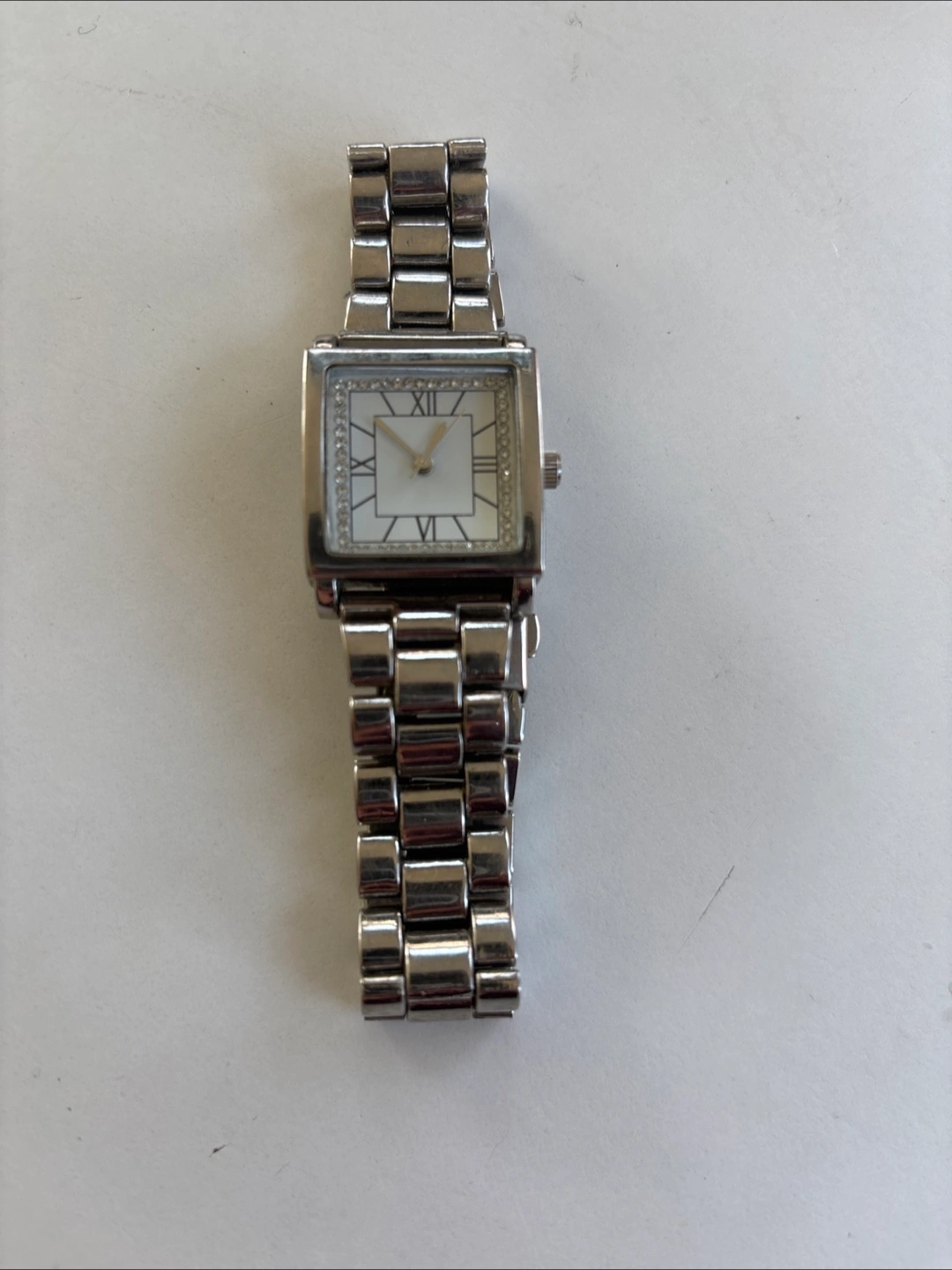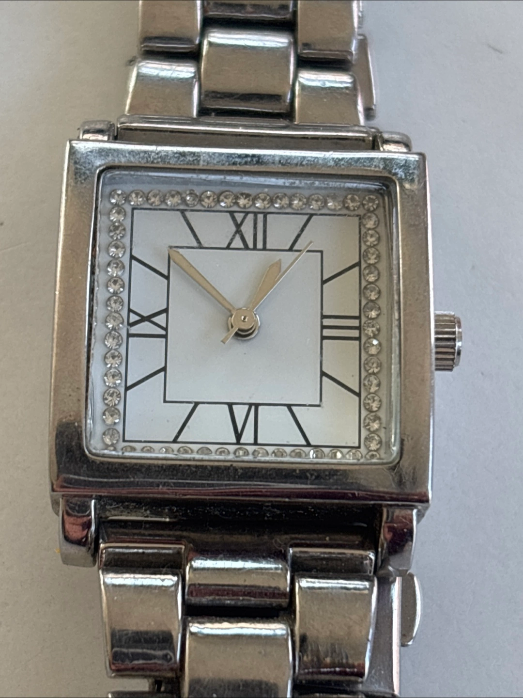 Stylish women's watch. Features a square face, silver metal band, and crystal accents. Quartz movement. Stainless steel. Made in China.