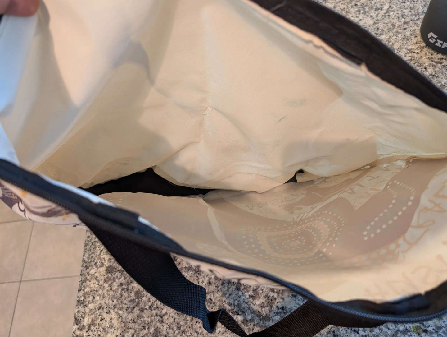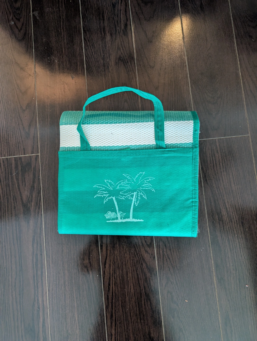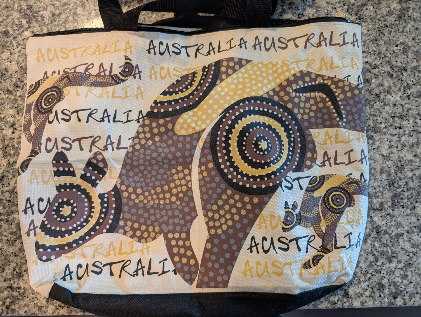 Reusable tote bag features an Aboriginal Australian design. Great for shopping or the beach. Also includes a matching striped beach mat with convenient carrying pouch. Perfect for picnics or days at the beach.