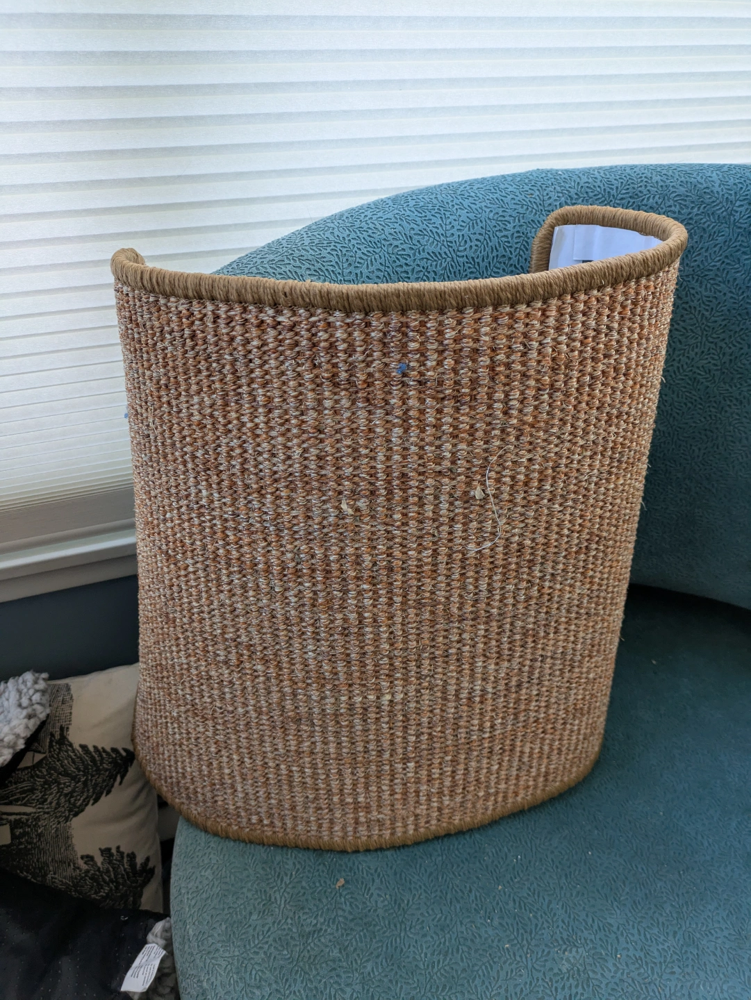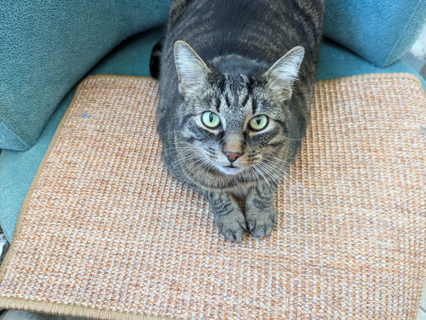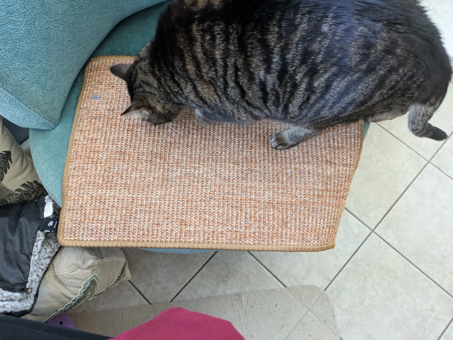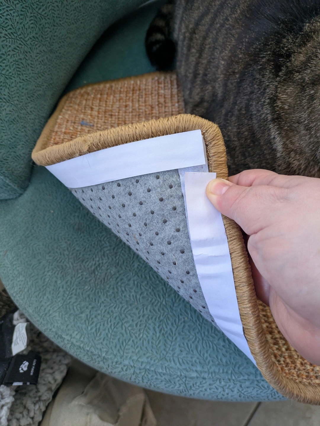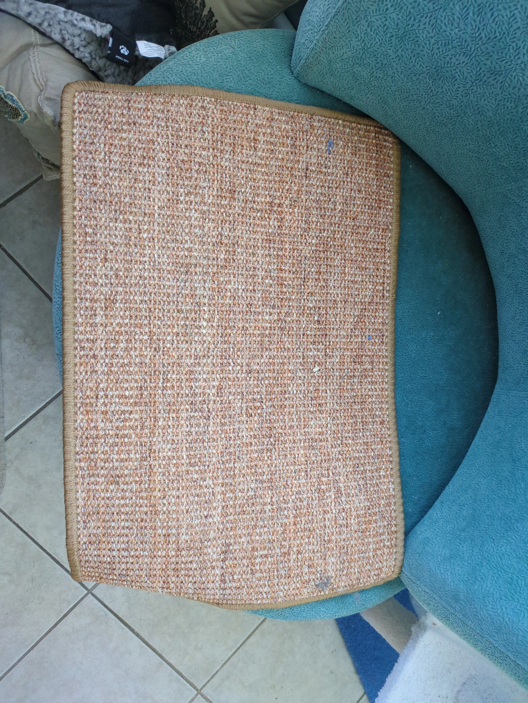Sisal cat scratching mat, investigated but never scratched. Sticky velcro strips around the bottom edges, along with a non-slip backing. We sprinkled some catnip on here but the cats just aren't interested in scratching it.