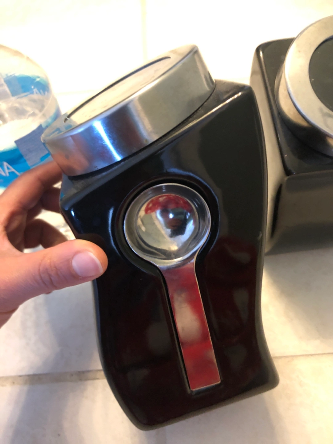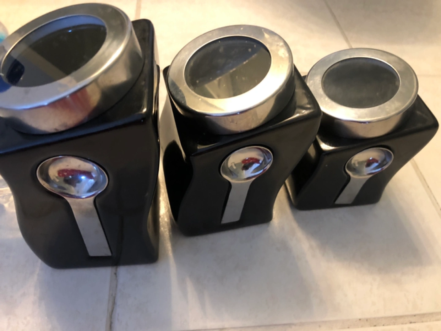 3 ceramic Kitchen canisters. Each come with magnetic spoon. Good condition. Selling as I have others. 591 mL bottle for size reference.