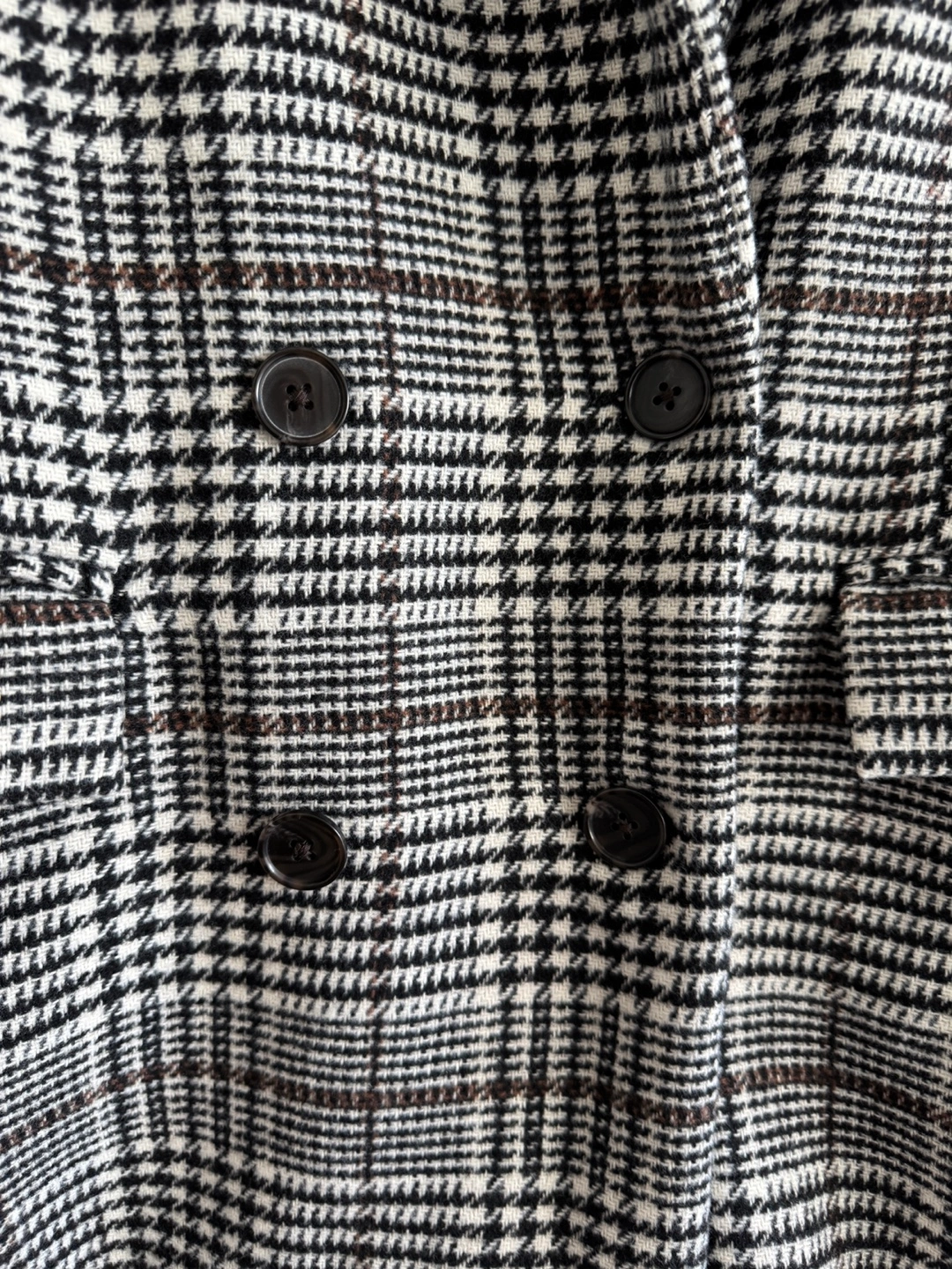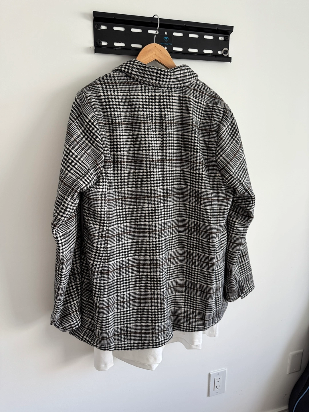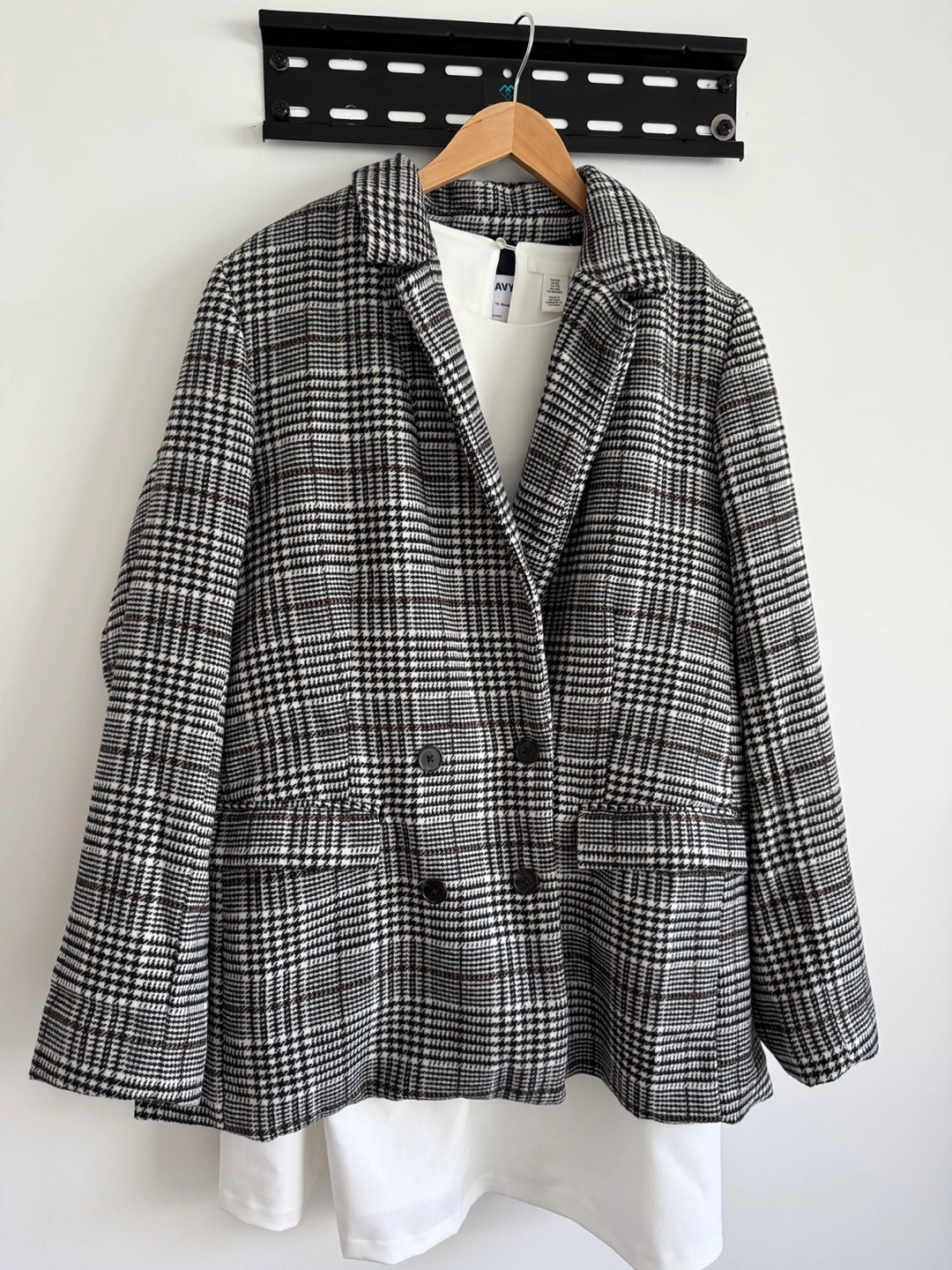 15Women's plus size double-breasted blazer. Features a glen plaid pattern in black, white, and brown. Long sleeves, button closures. Used only once, condition like new