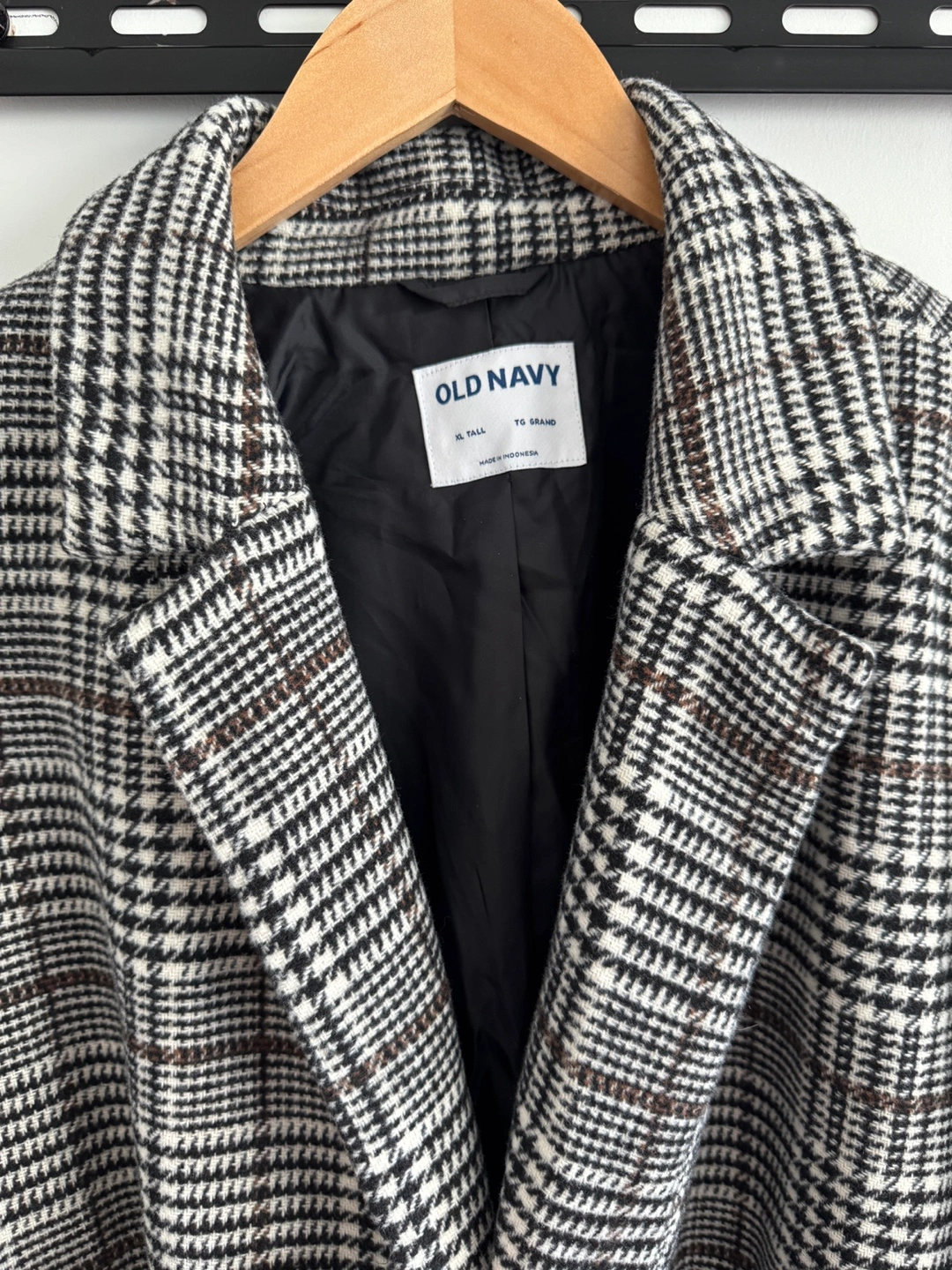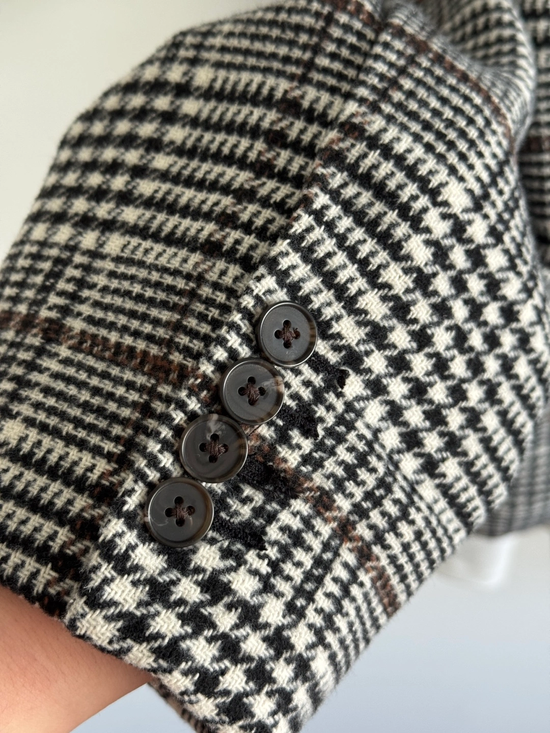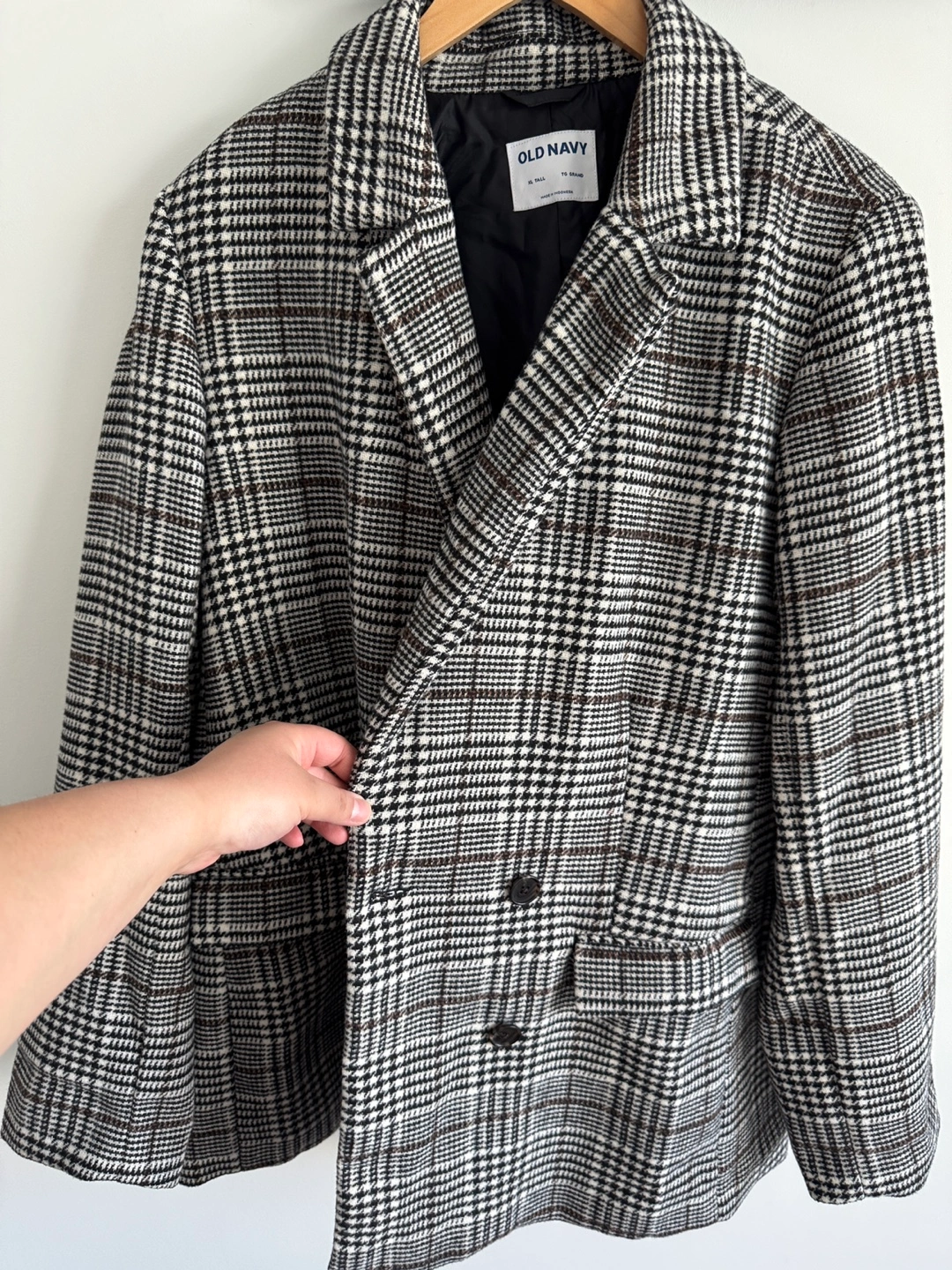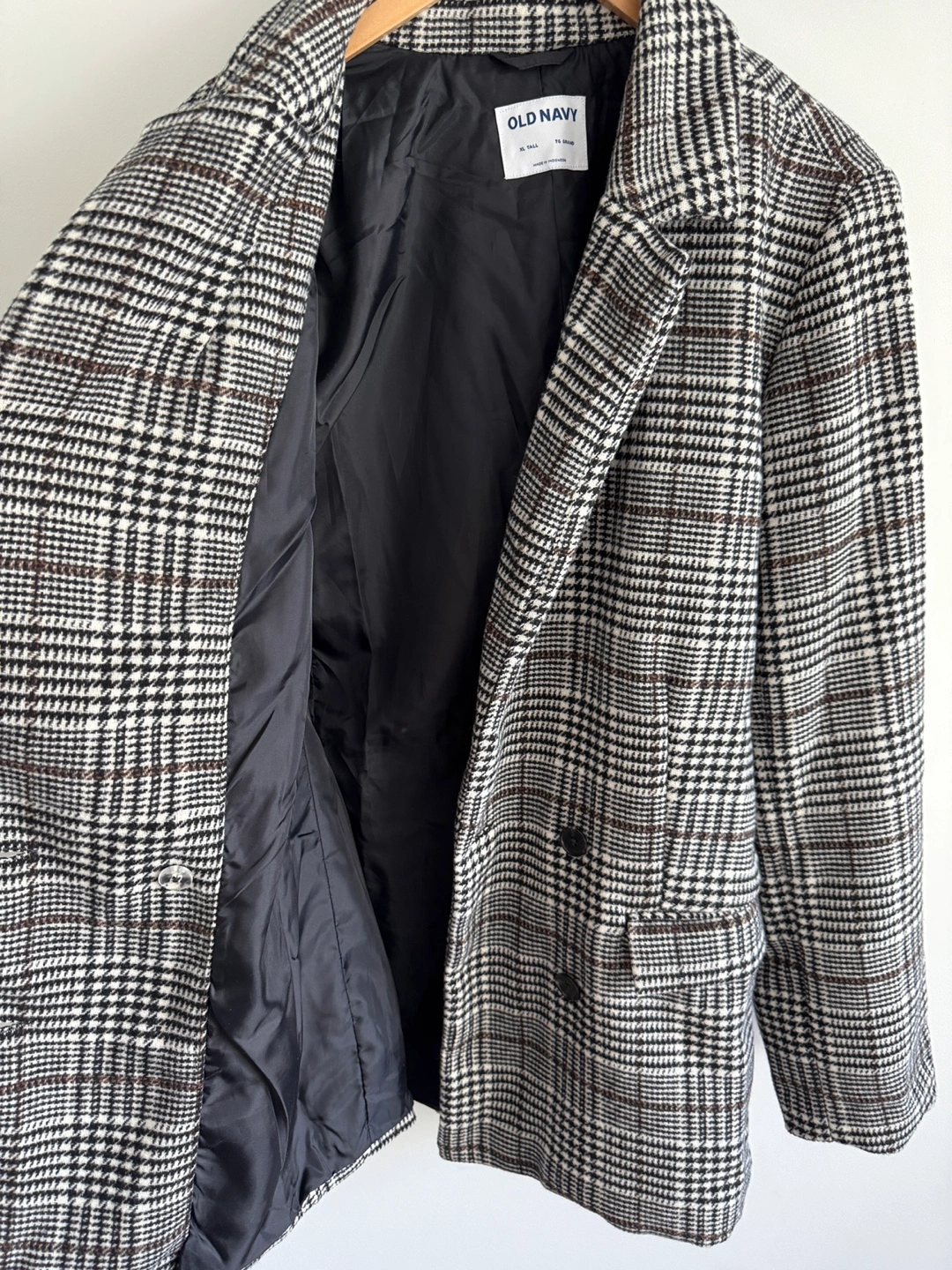 15Women's plus size double-breasted blazer. Features a glen plaid pattern in black, white, and brown. Long sleeves, button closures. Used only once, condition like new