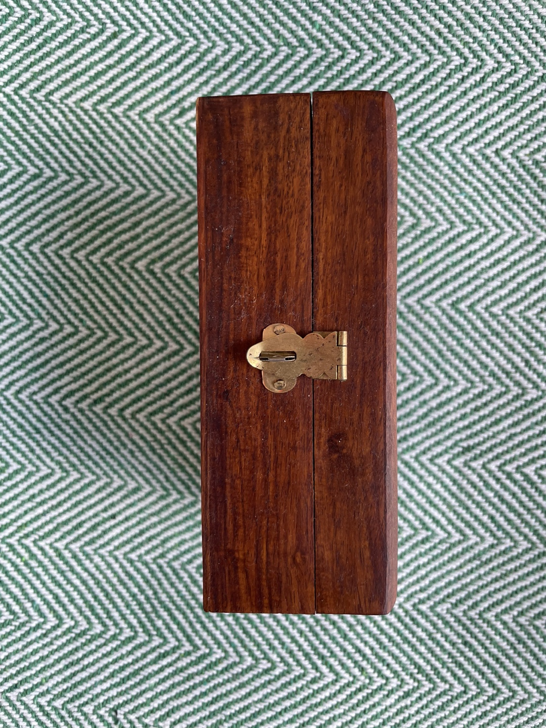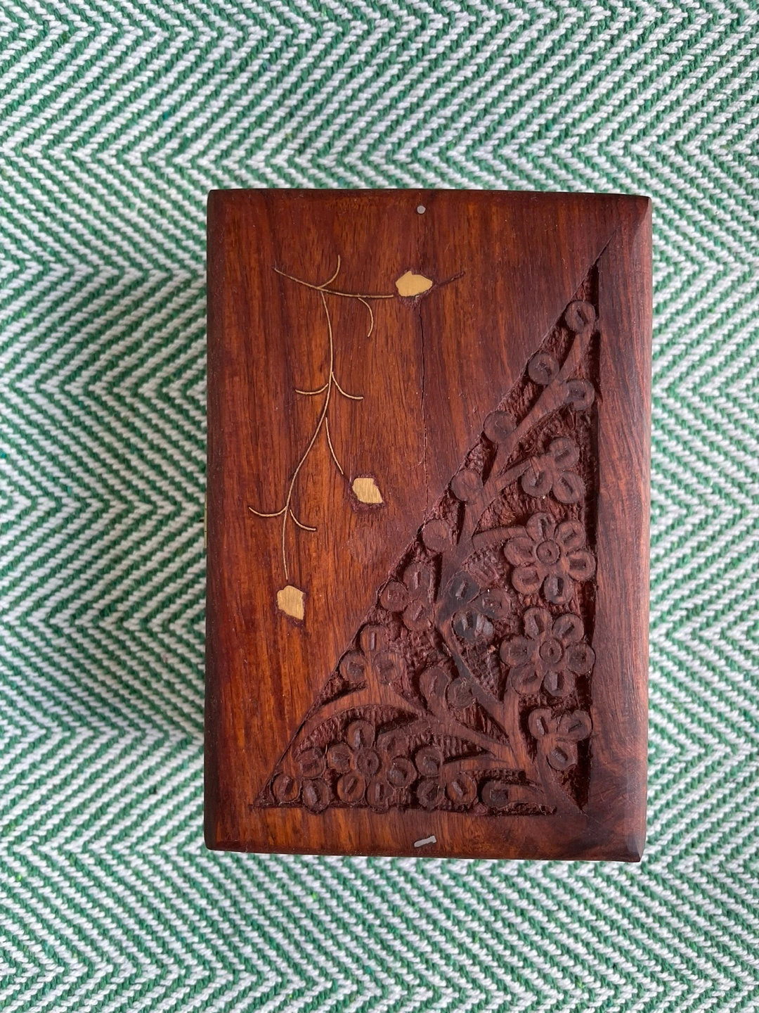Intricate hand-carved wooden box. Features floral designs and brass hinges. Small and compact. Ideal for jewellery or trinkets.