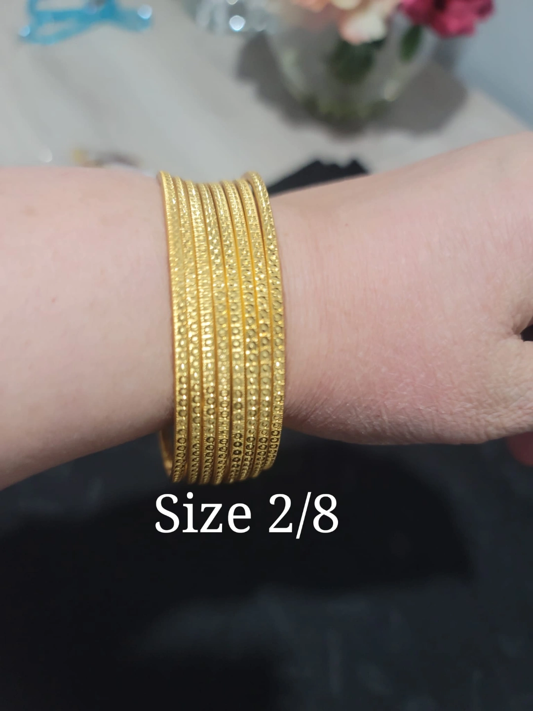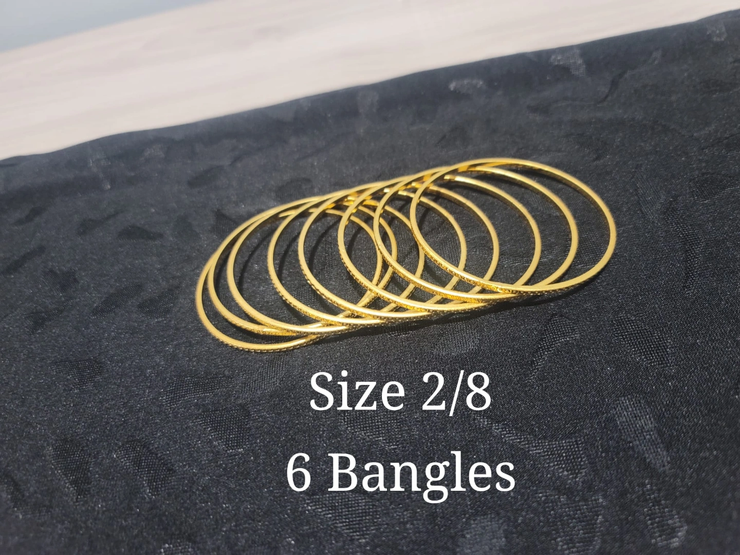111Set of six gold bangles. Size 2/8. Textured surface. Comes in a plastic container.