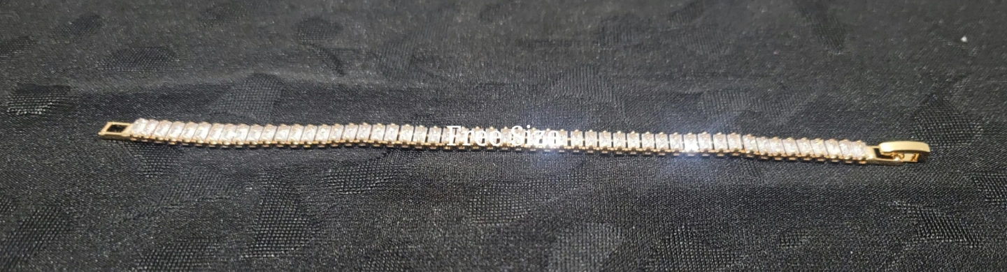 111Stunning gold-tone bracelet. Features baguette-cut cubic zirconia stones. Free size, flexible design. Elegant and sparkly.