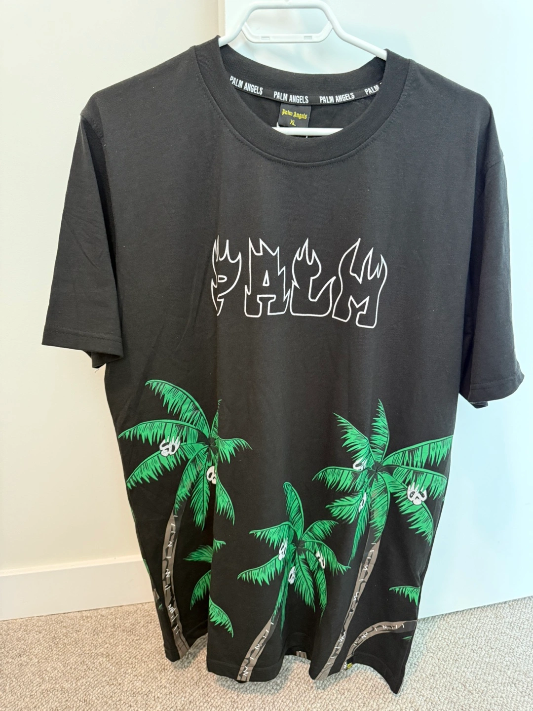 Men's Palm Angels black t-shirt. Features a graphic print of palm trees and the Palm Angels logo. Short sleeves, crew neck. Size XL.