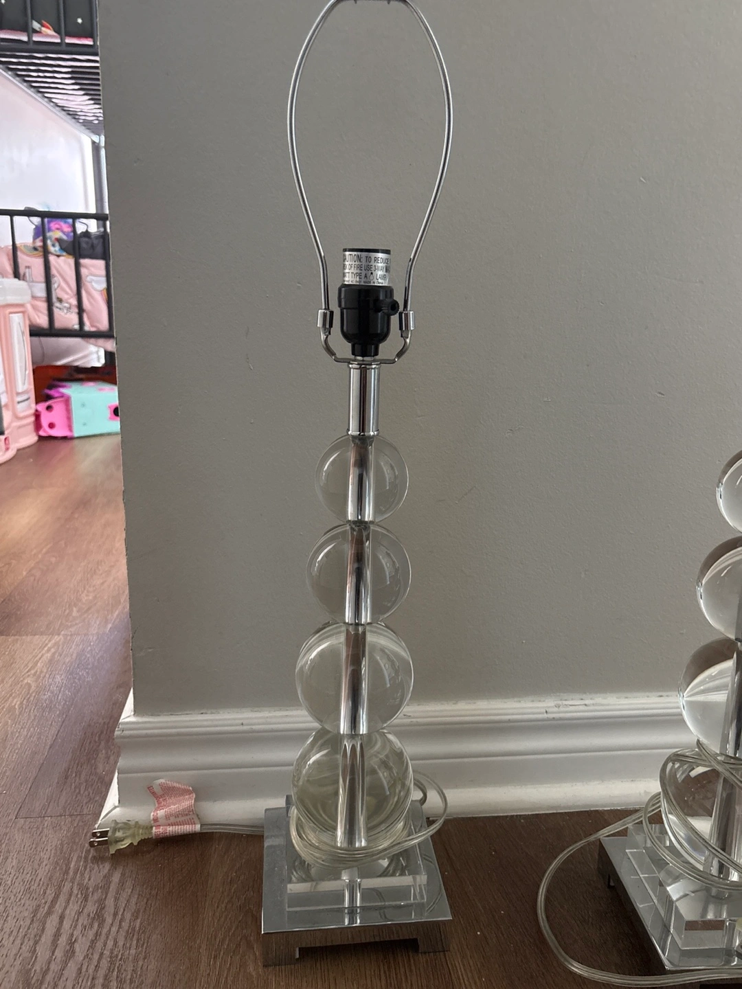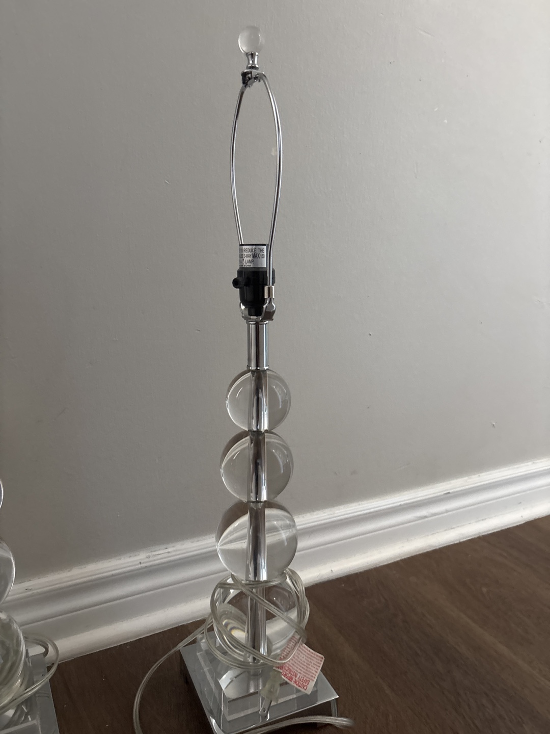 Elegant pair of table lamps. Chrome finish. Clear crystal balls. Modern design. Great for a bedroom or living room. Very heavy.