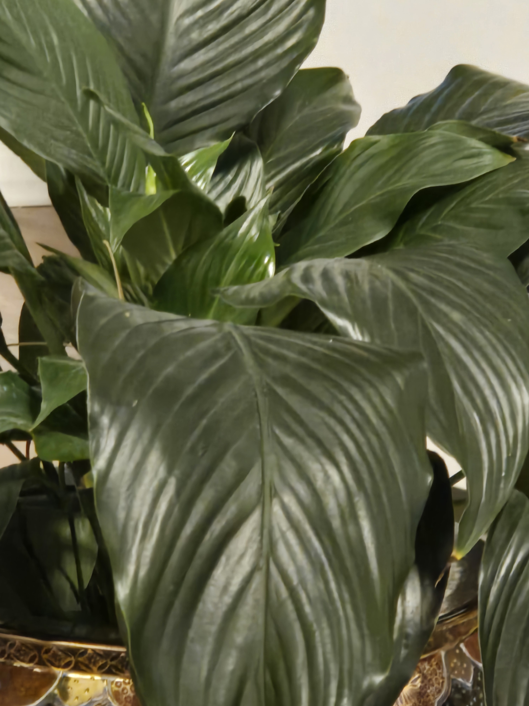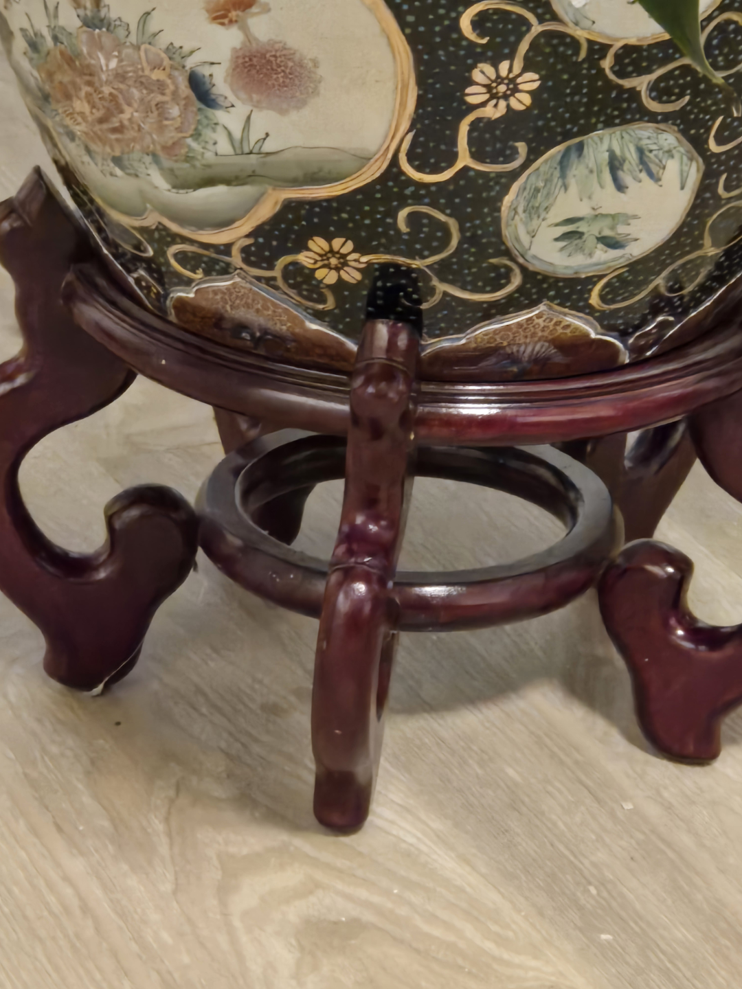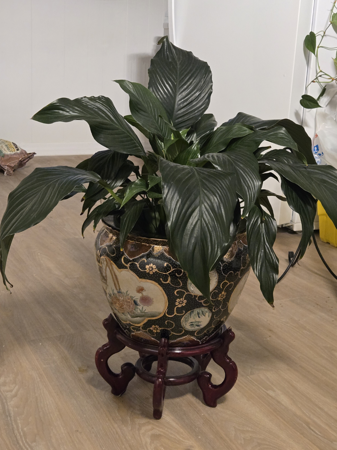 Large peace lily plant. Planter features Asian-inspired design. Dark brown wooden stand included. Pot is decorated with gold accents and floral patterns.