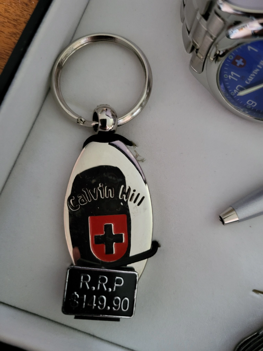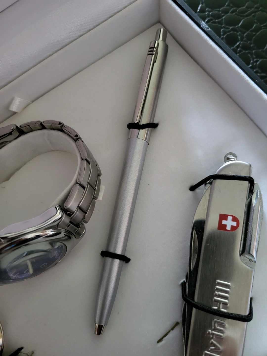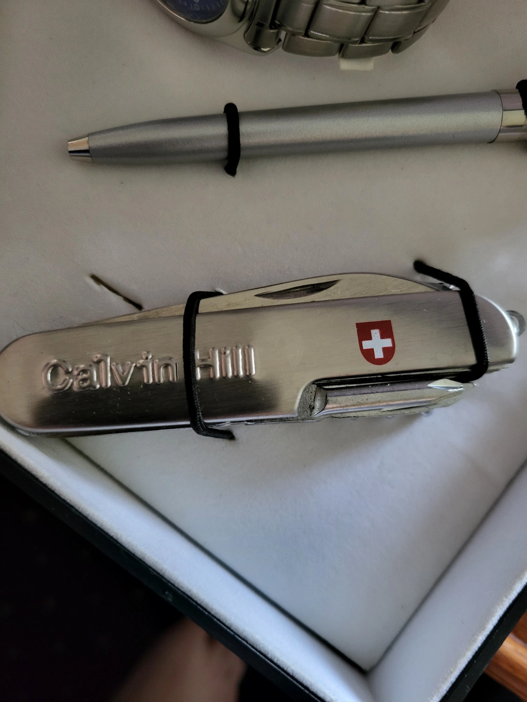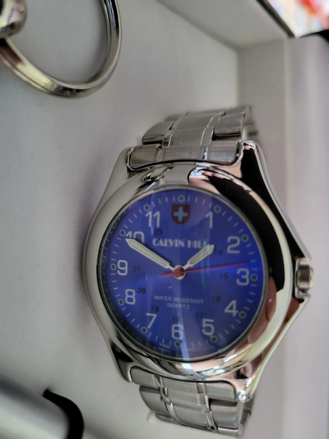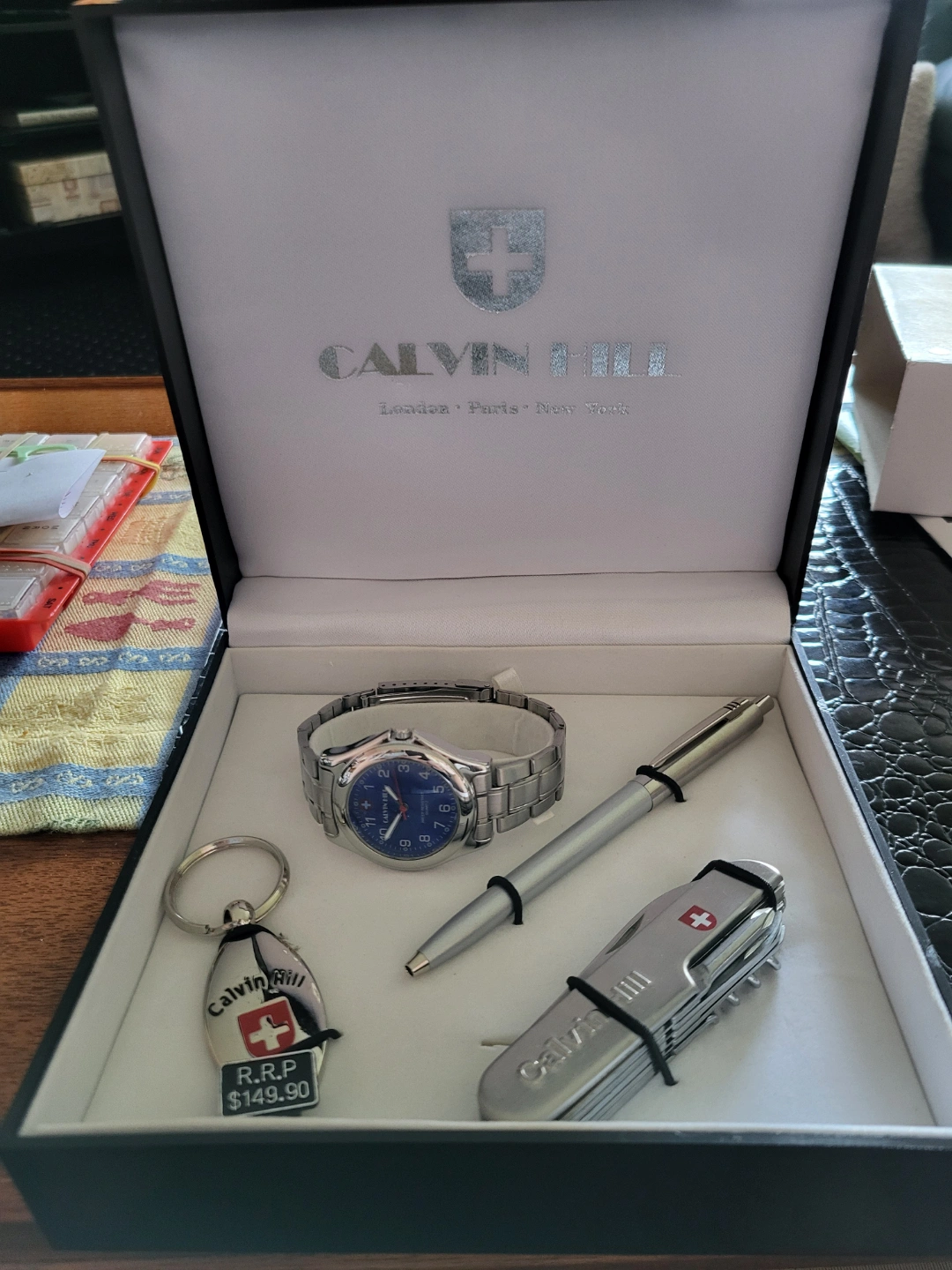 New, never used Calvin Hill men's gift set. Includes watch, pen, Swiss army knife, and keychain. All items are in original box. Retail price $149.90. Smoke free home.