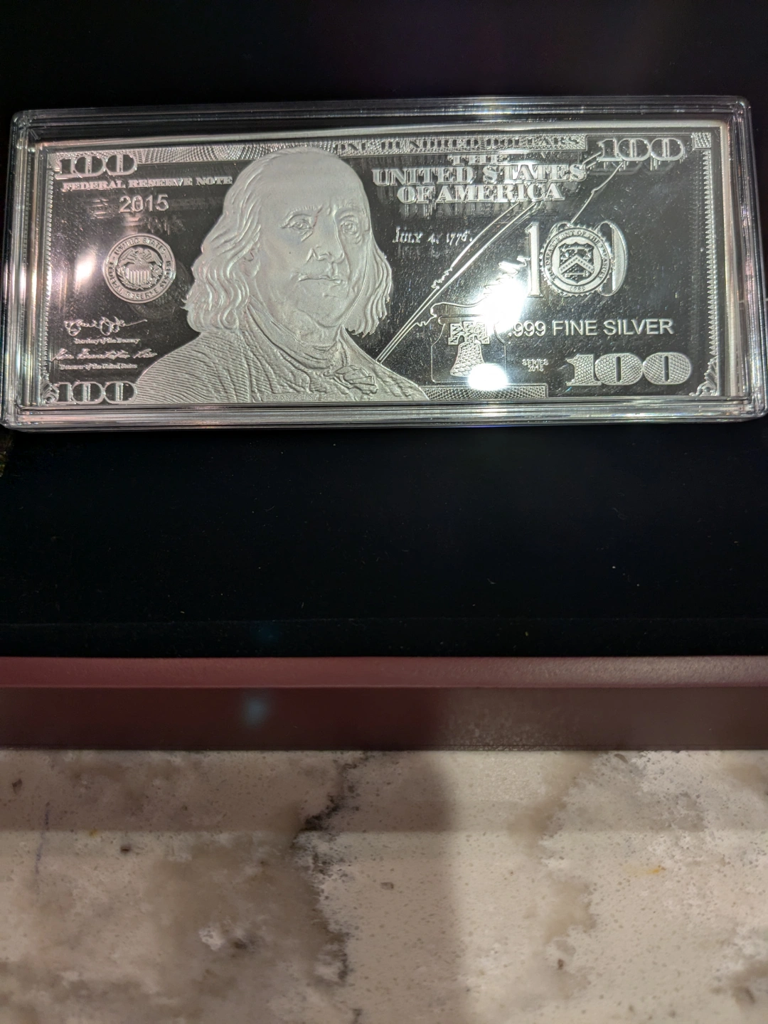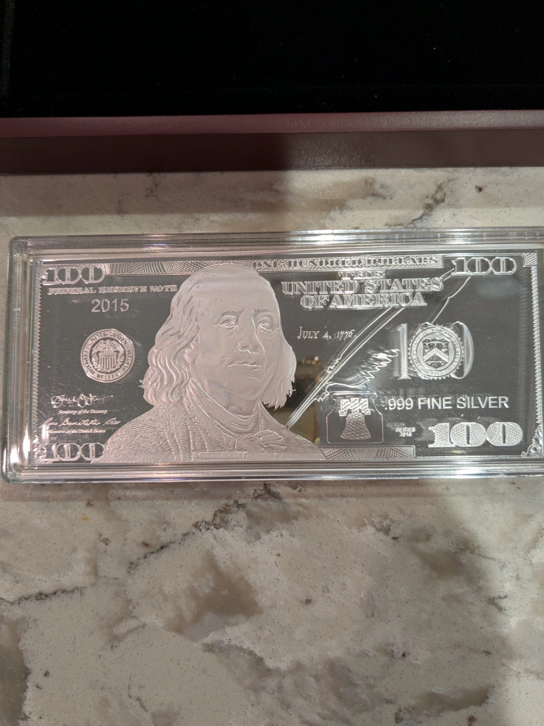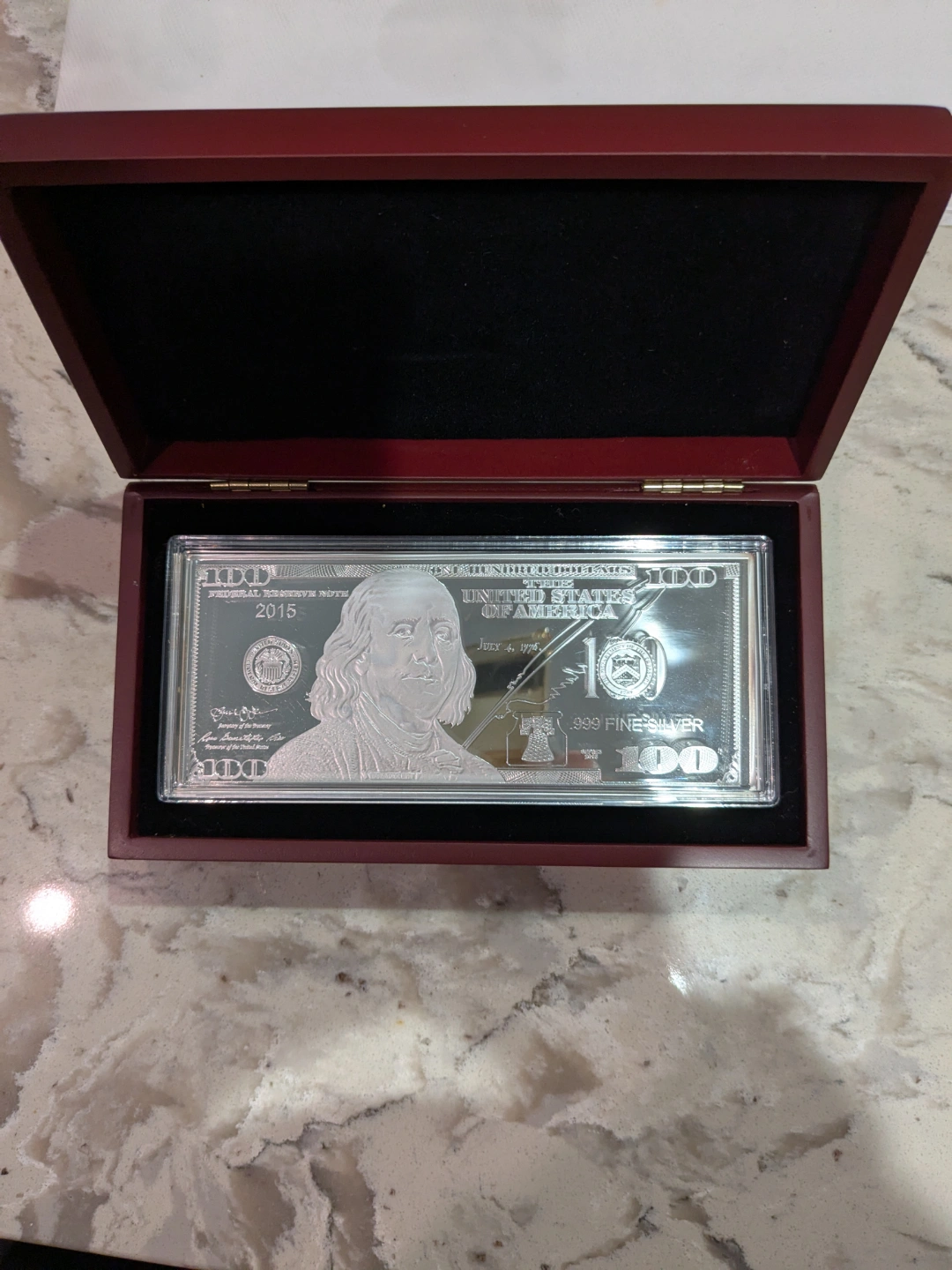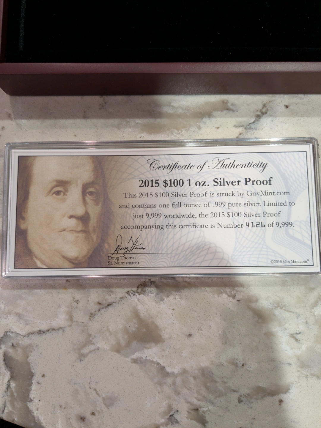 One ounce .999 pure silver. Limited edition of 9,999. Number 4,126 of 9,999. Comes in a wooden box with certificate of authenticity.