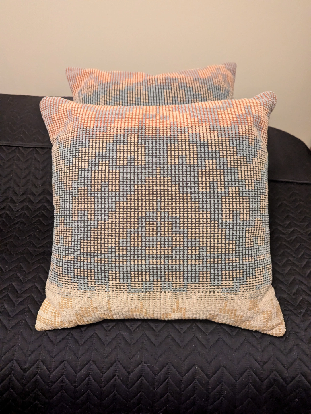 Two decorative pillows, approximately 18 inches by