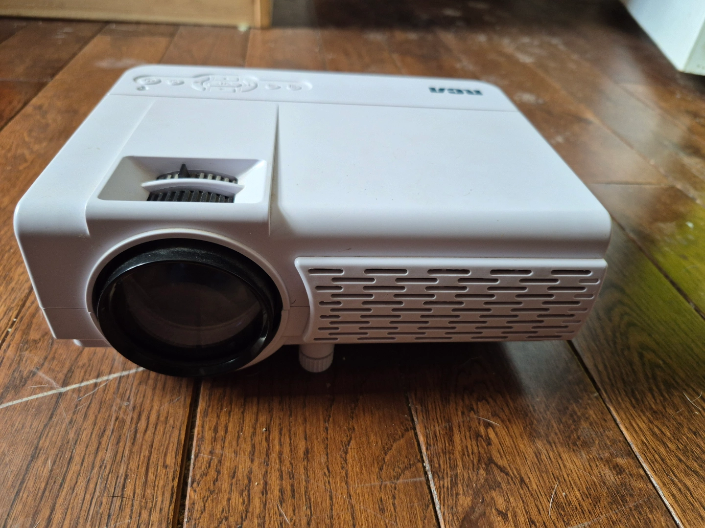 White mini projector. Features multiple buttons and a focus adjustment dial. Compact and lightweight design. Great for home entertainment.