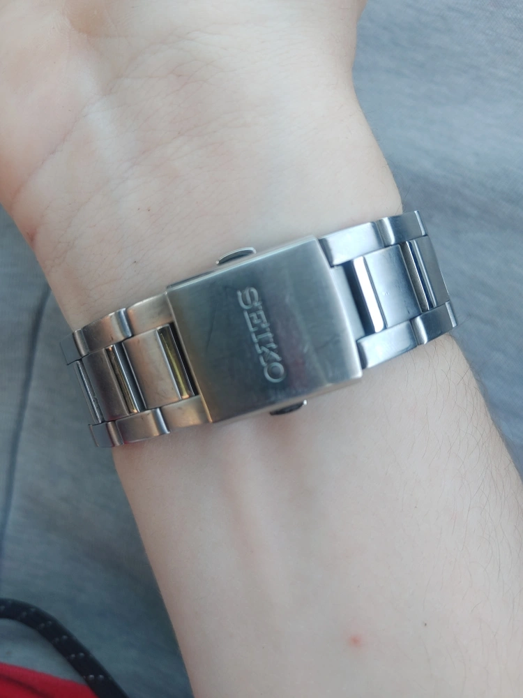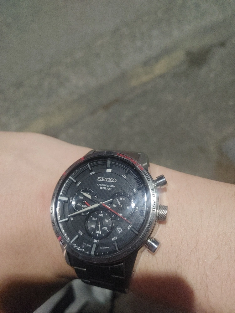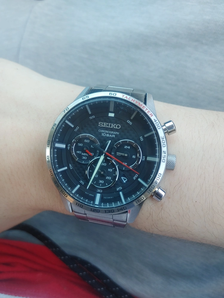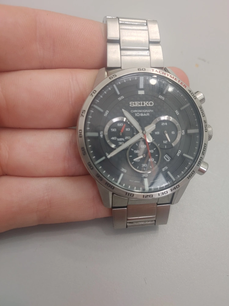 Stainless steel men's watch. Chronograph and tachymeter functions. Black face. Metal band. 10 bar water resistant.