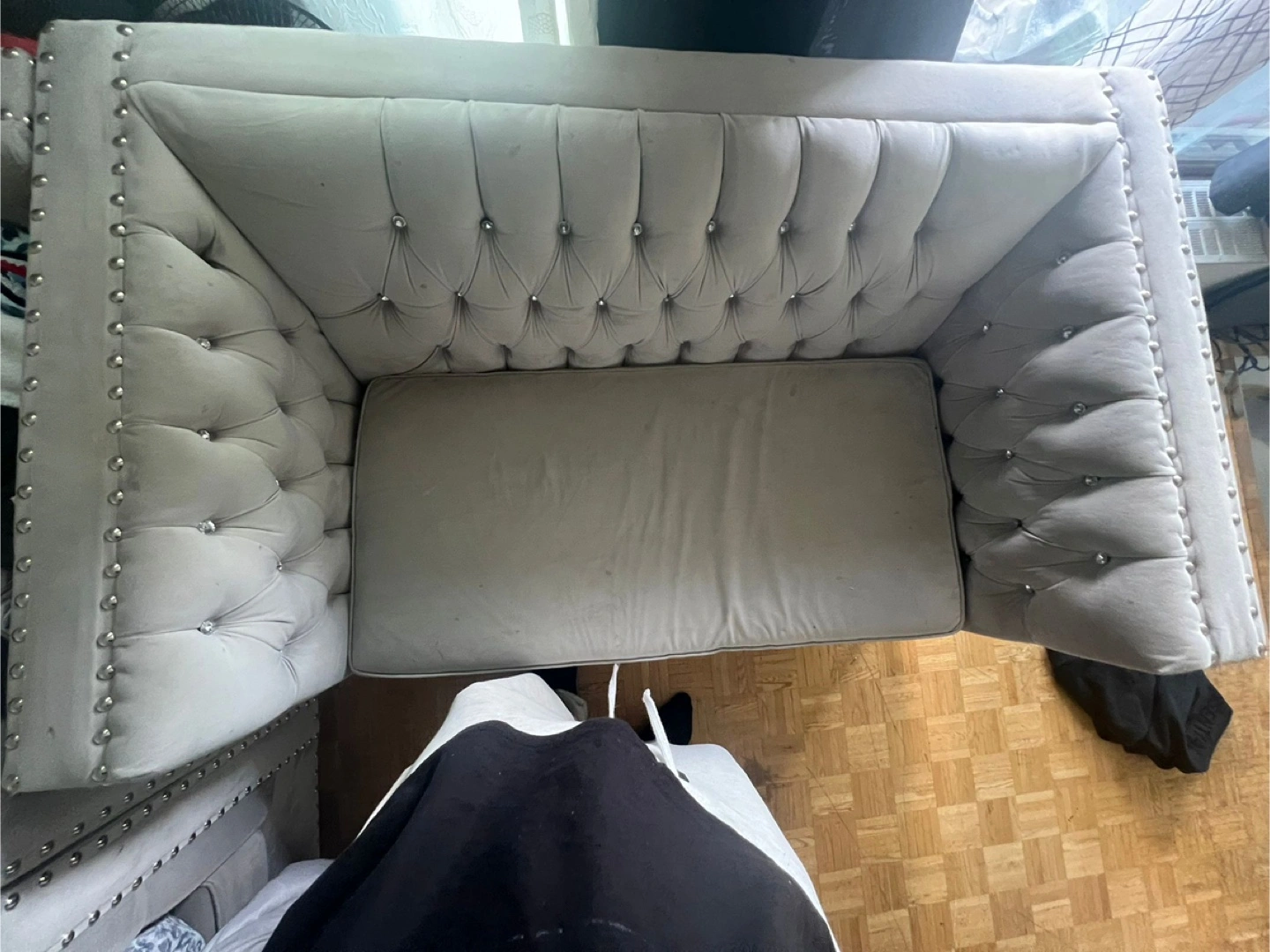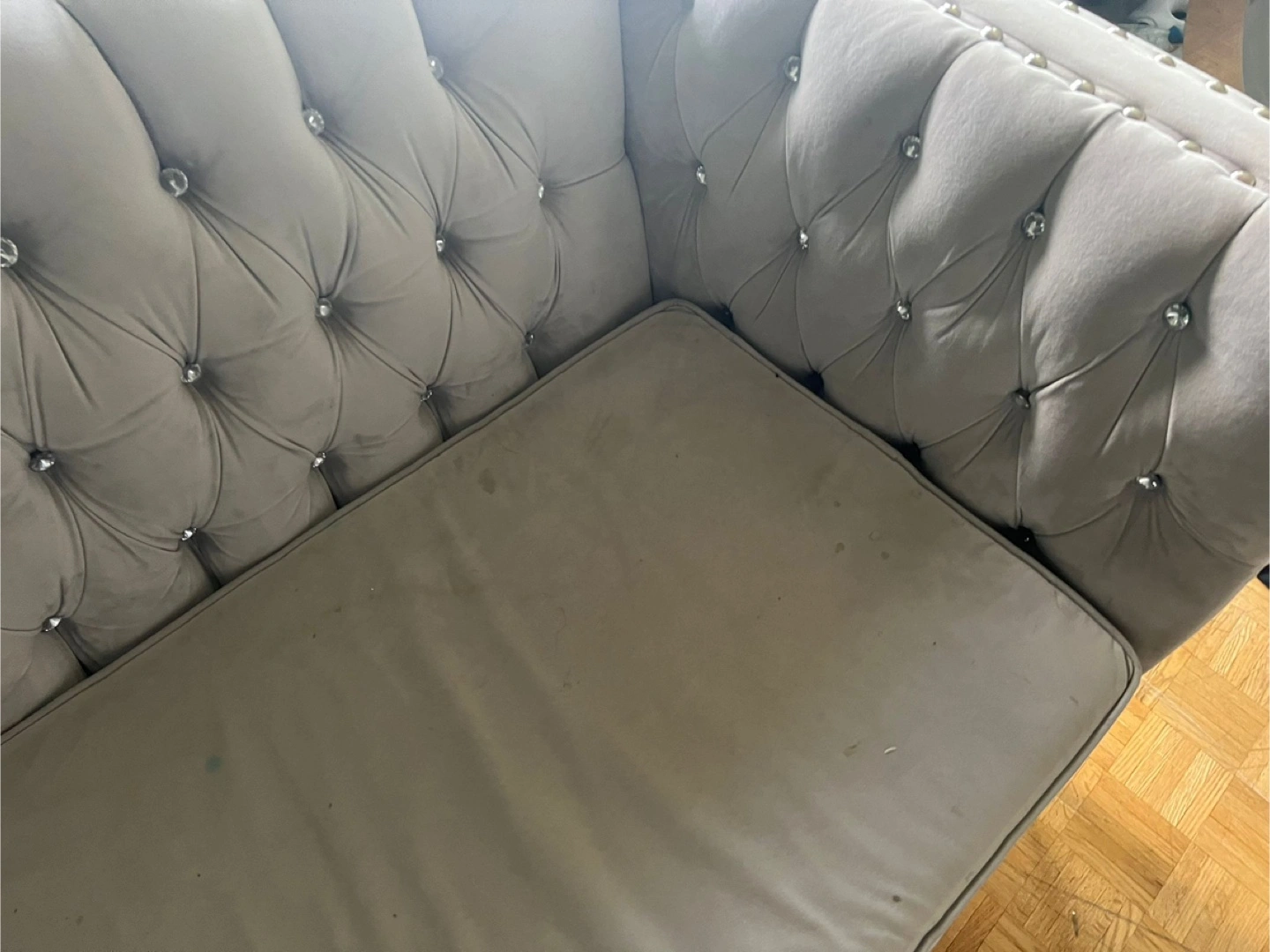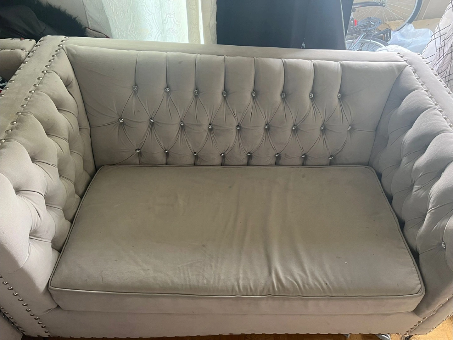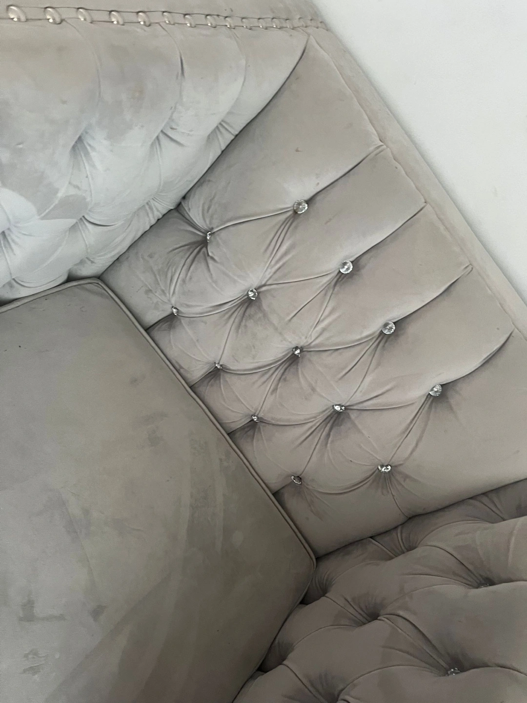 Light grey tufted velvet love seat and arm chair. Features nailhead trim along the edges. Diamond encrusted. Luxurious feel.