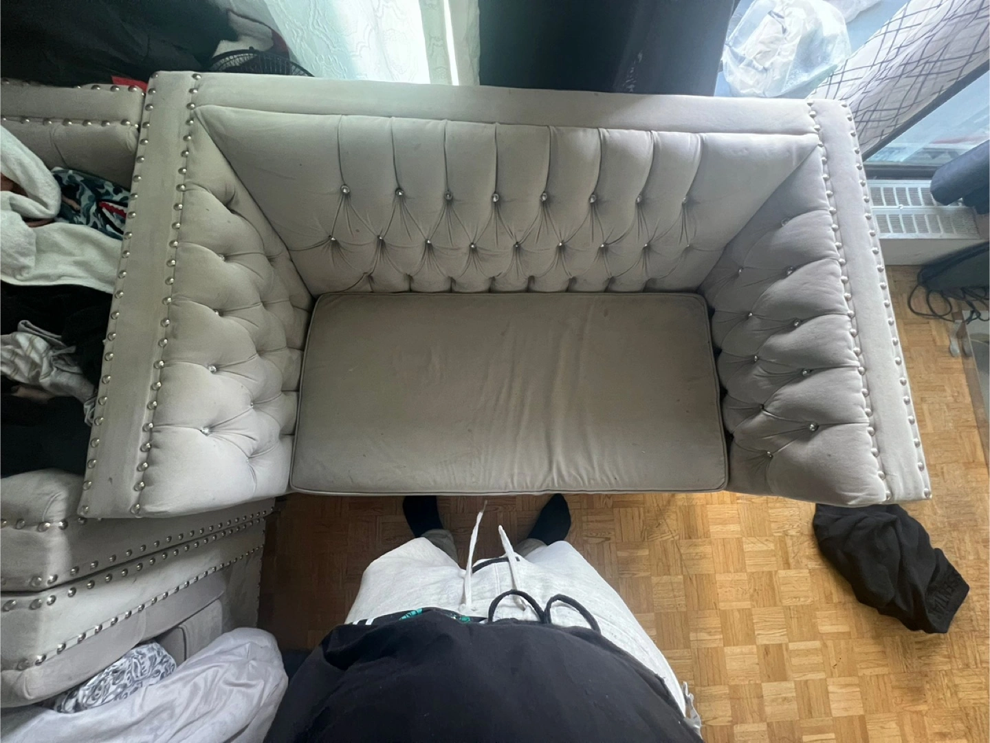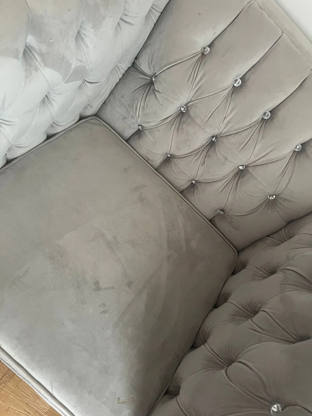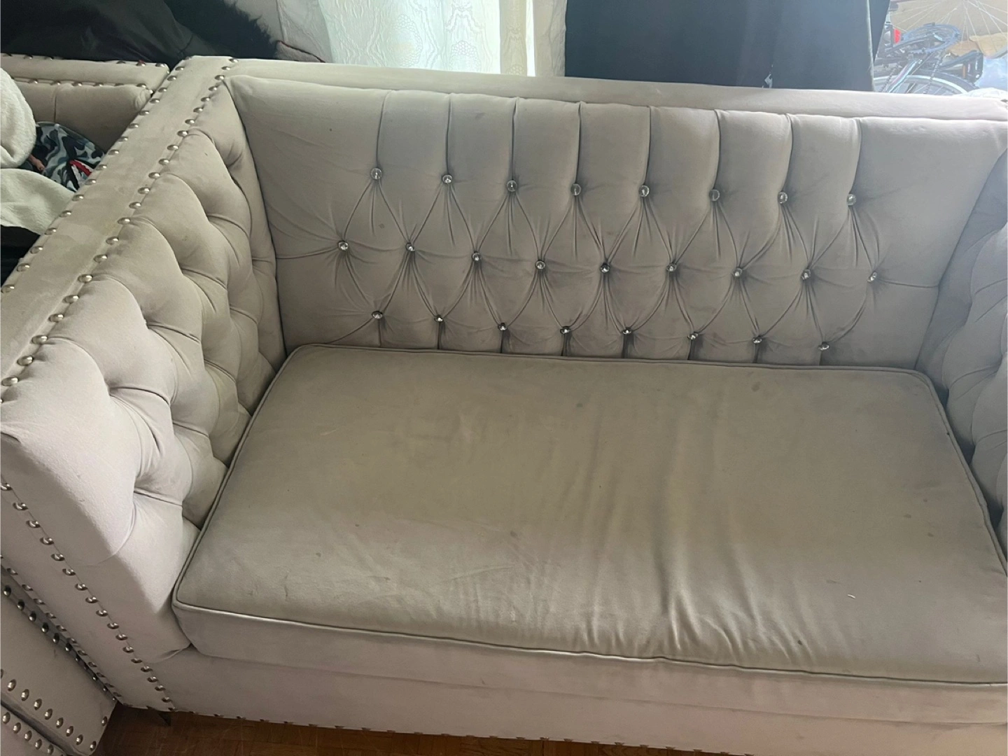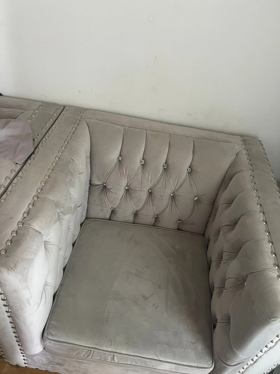 Light grey tufted velvet love seat and arm chair. Features nailhead trim along the edges. Diamond encrusted. Luxurious feel.