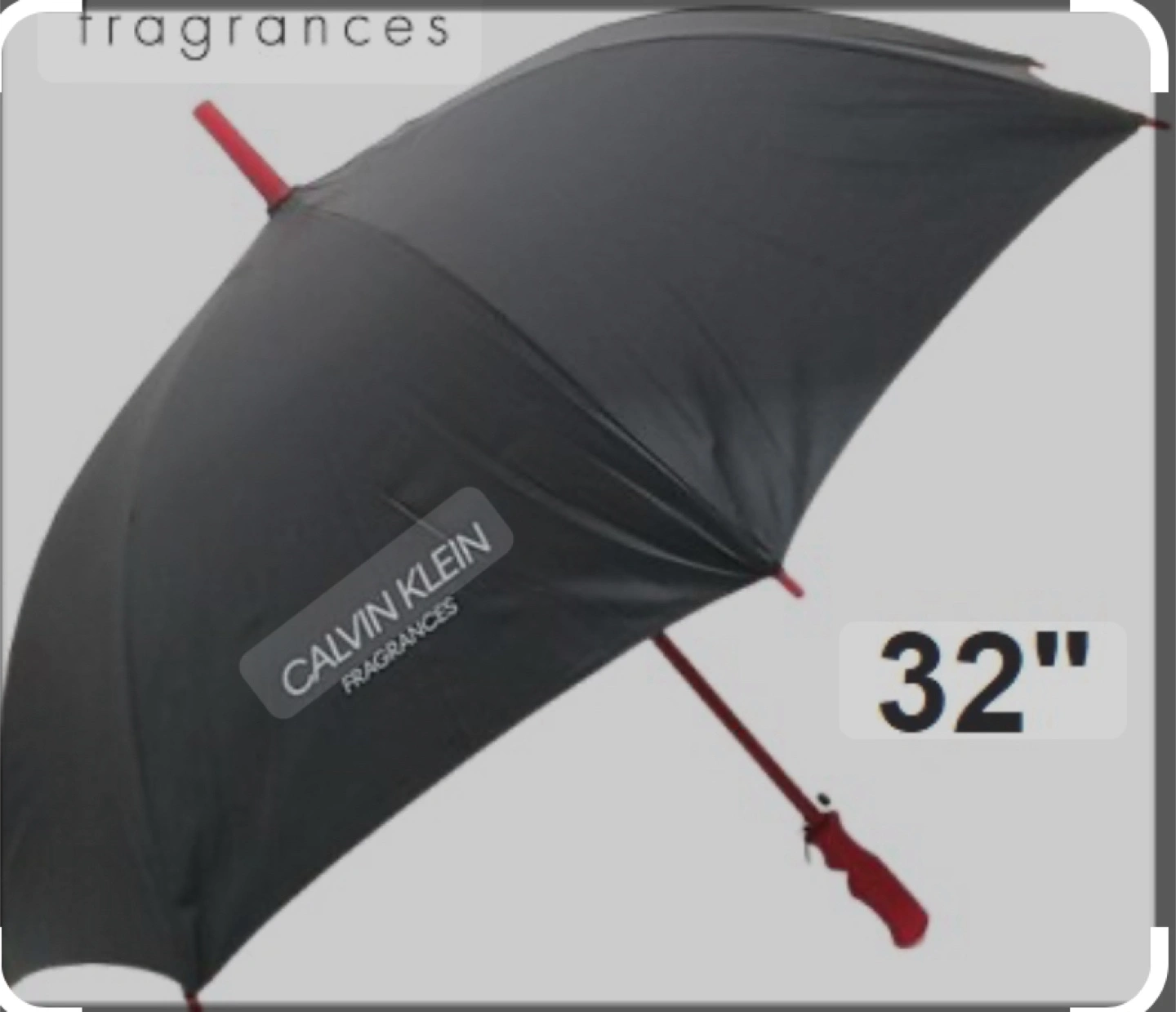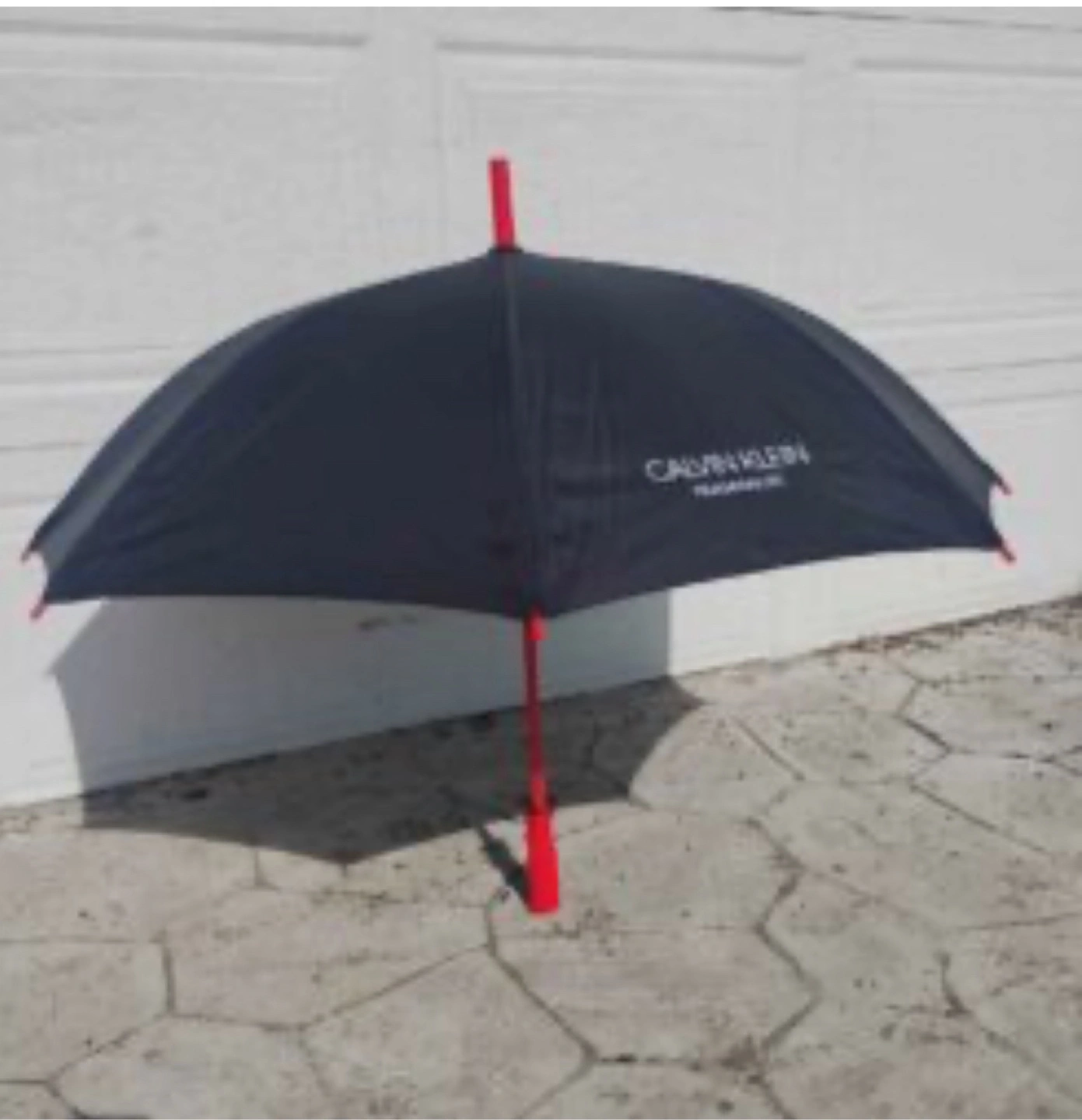 Large black umbrella With Red accents. Calvin Klein Fragrances logo. 32 inches.