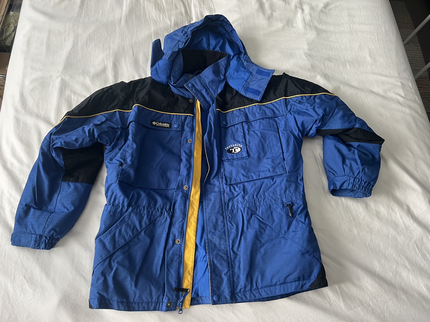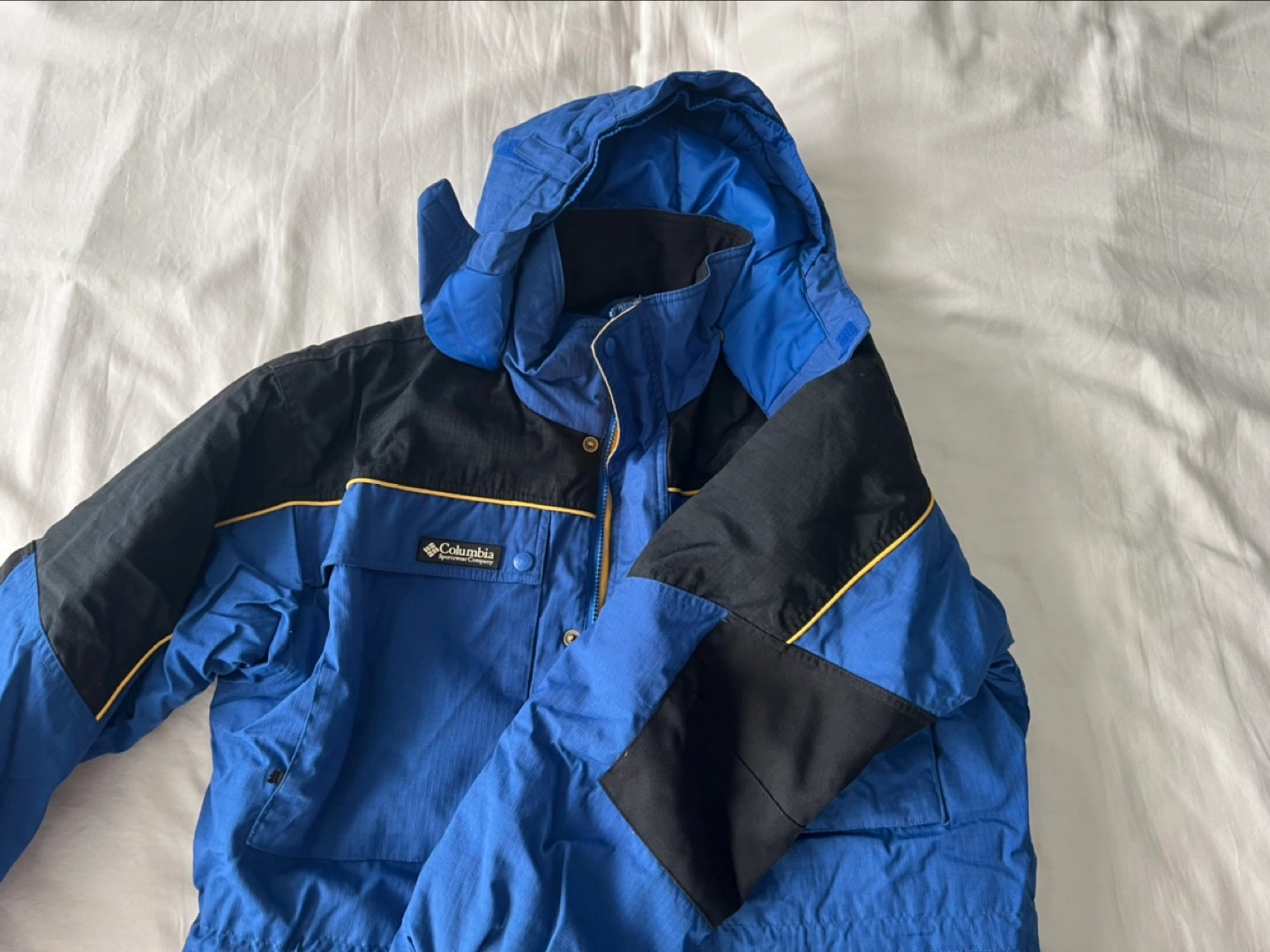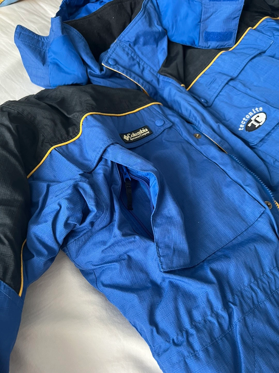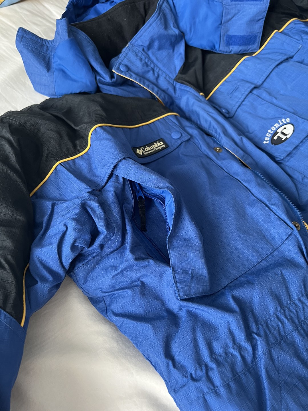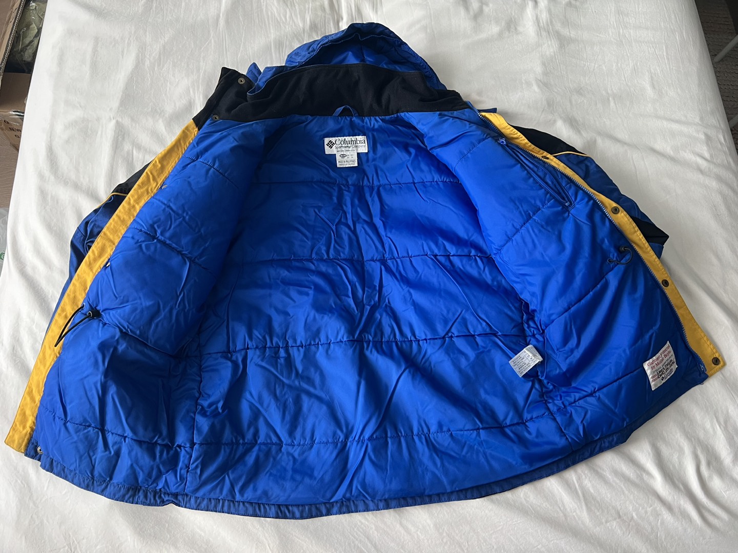Vintage 80’s Columbia winter skiing coat, meant as a lightweight with down padding and a removable hood. Water-resistant material with warm interior padding. Draw-strings to tighten at waist.
