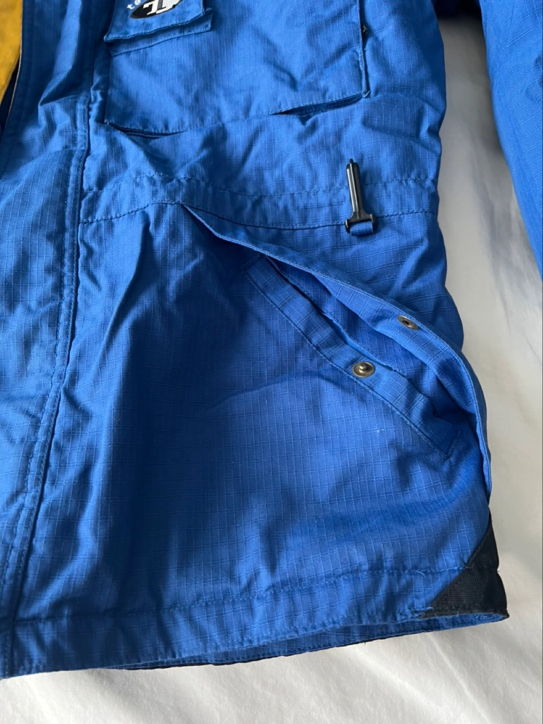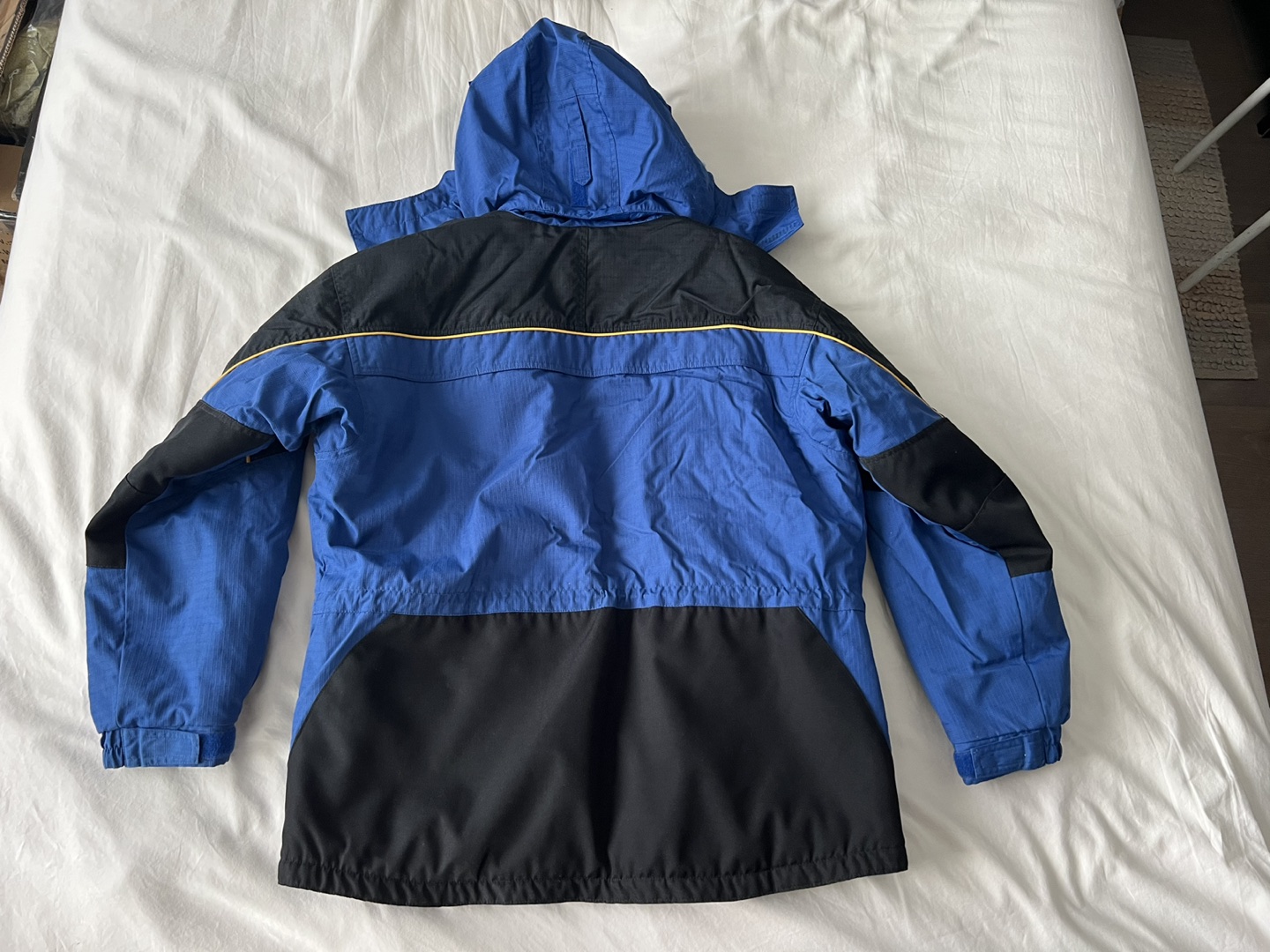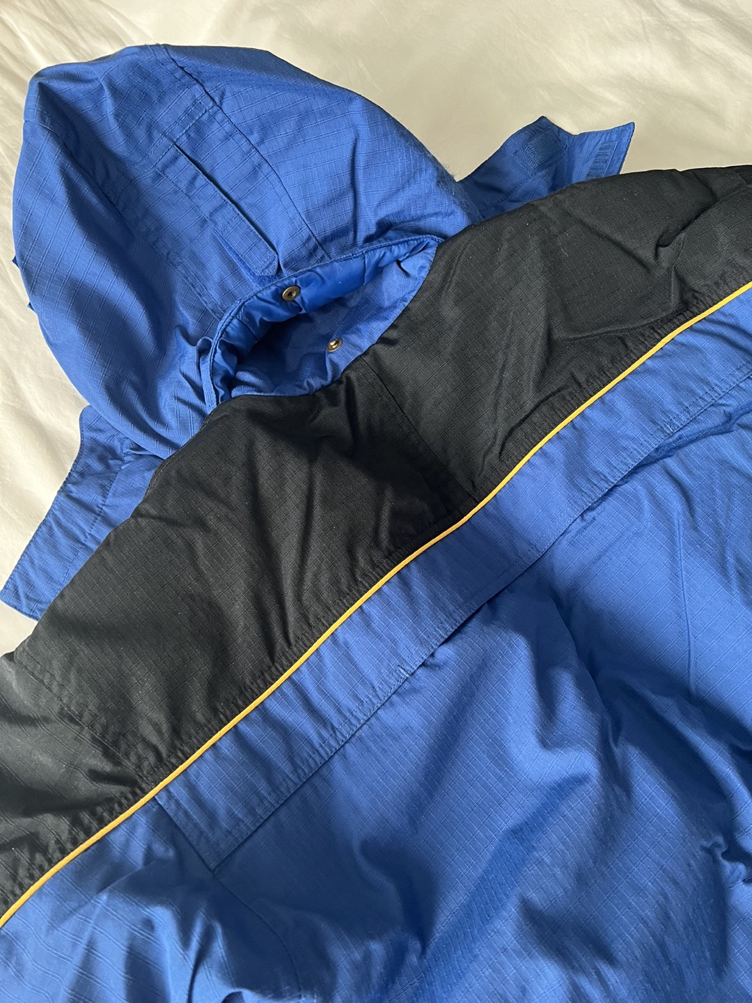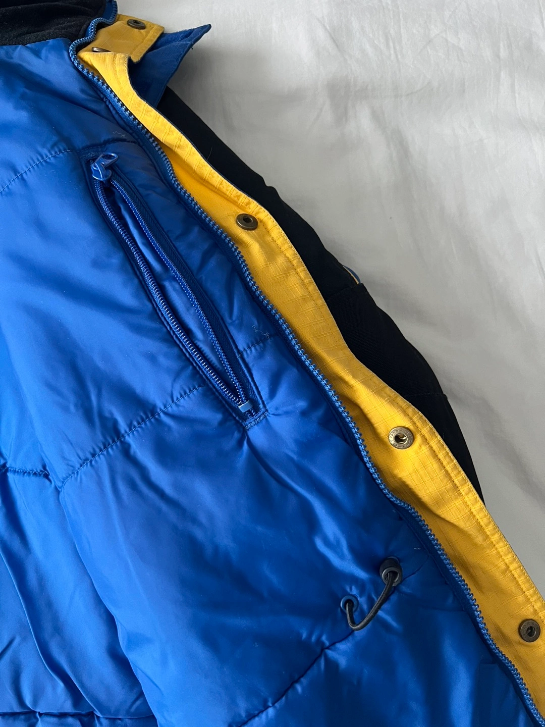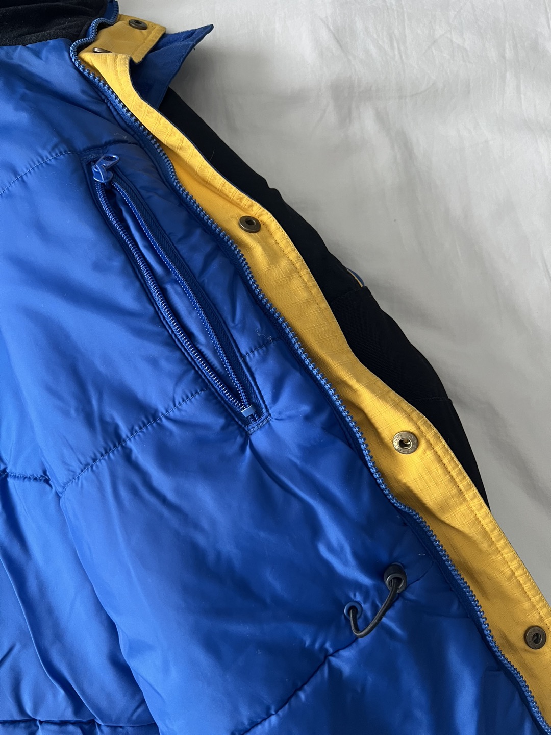Vintage 80’s Columbia winter skiing coat, meant as a lightweight with down padding and a removable hood. Water-resistant material with warm interior padding. Draw-strings to tighten at waist.