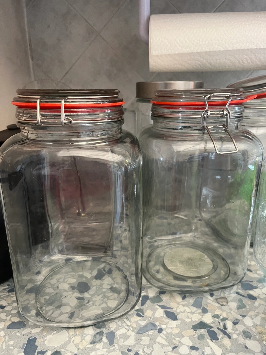 I have 3 stocks, $8 each. Large square glass storage jars. Clear glass with orange silicone seals and metal clips. Perfect for storing dry goods or pantry staples.