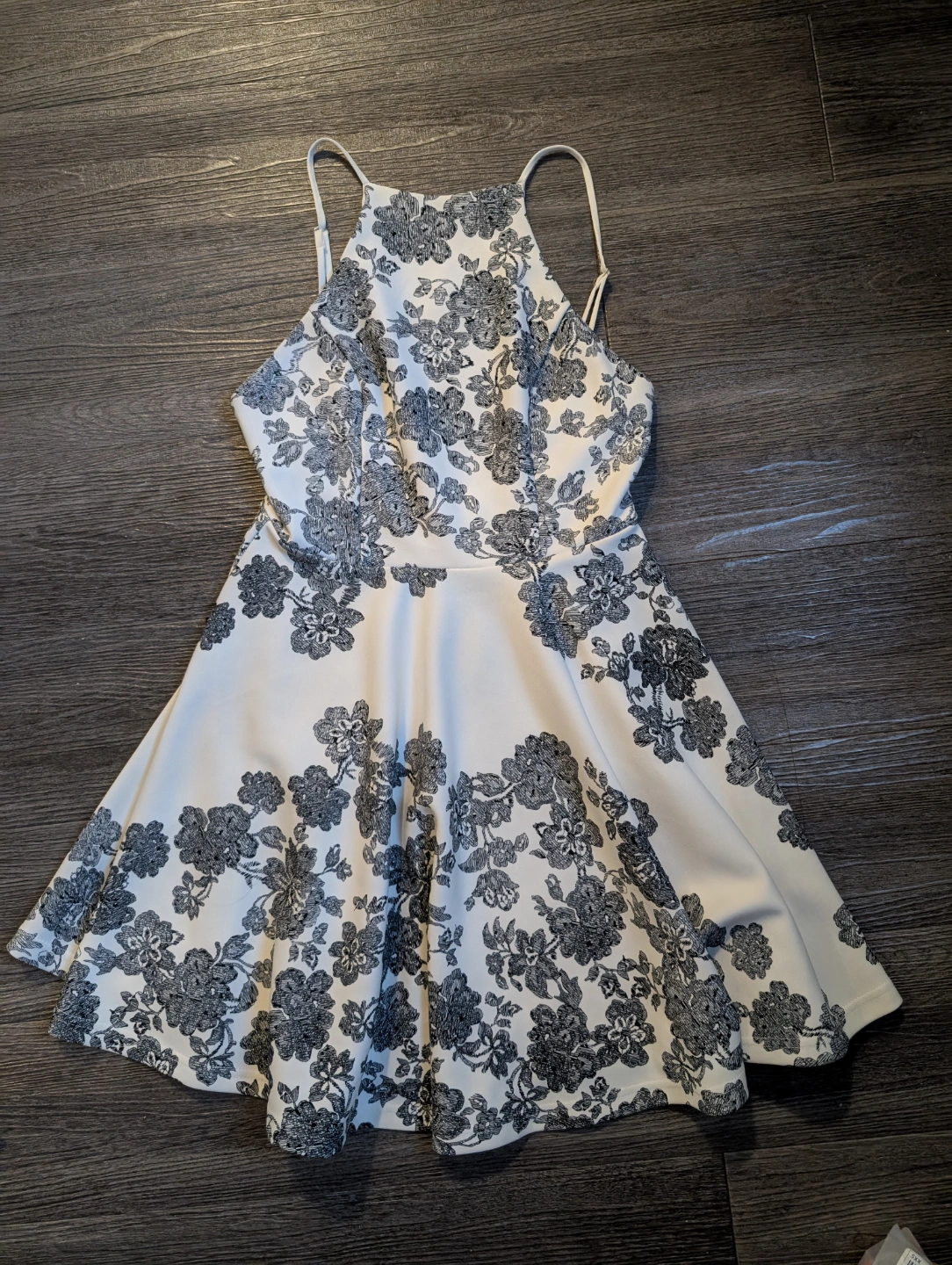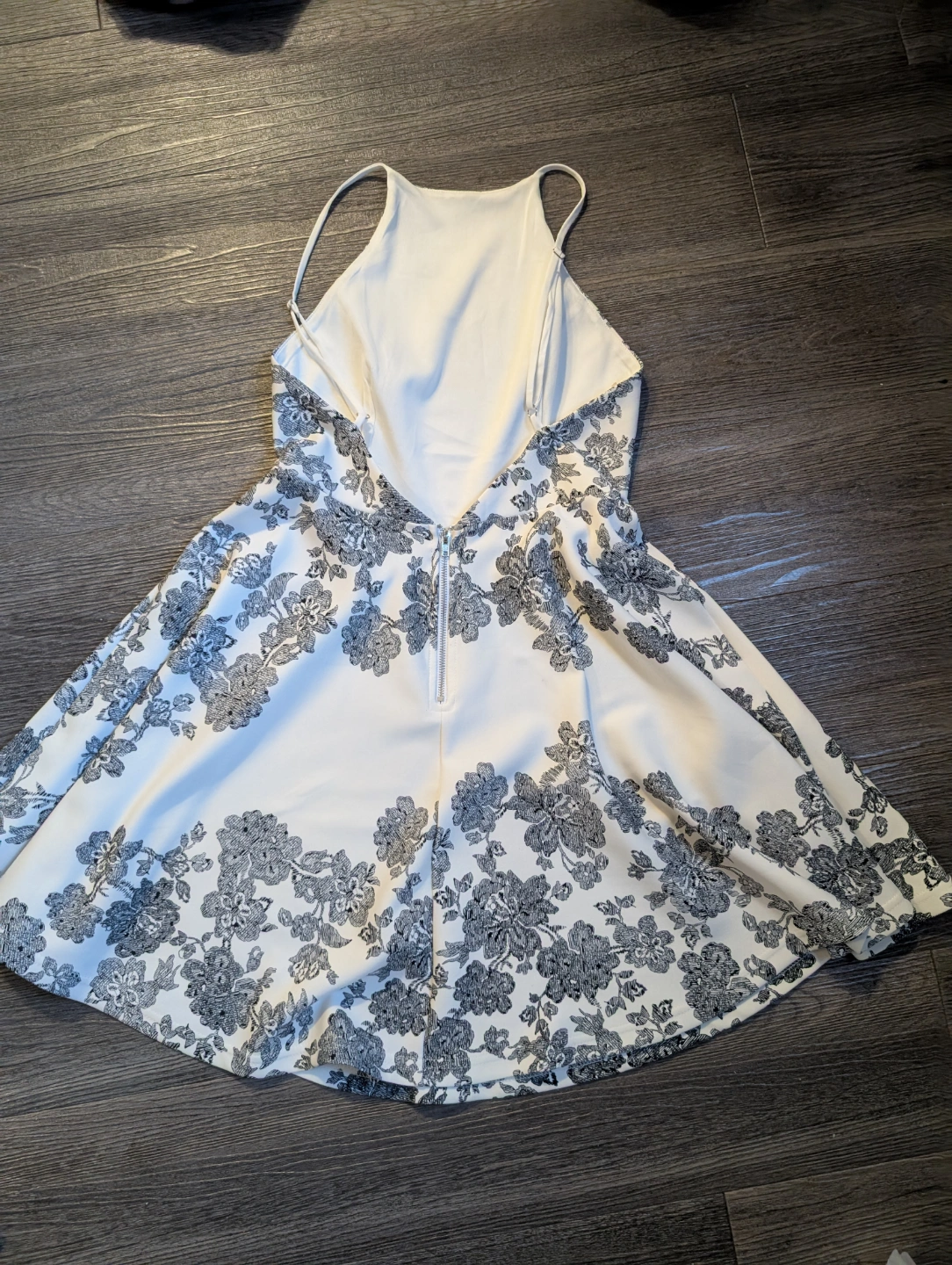 Adorable skater dress. Features a high neckline and spaghetti straps. Floral print on a cream background. Back zipper closure.