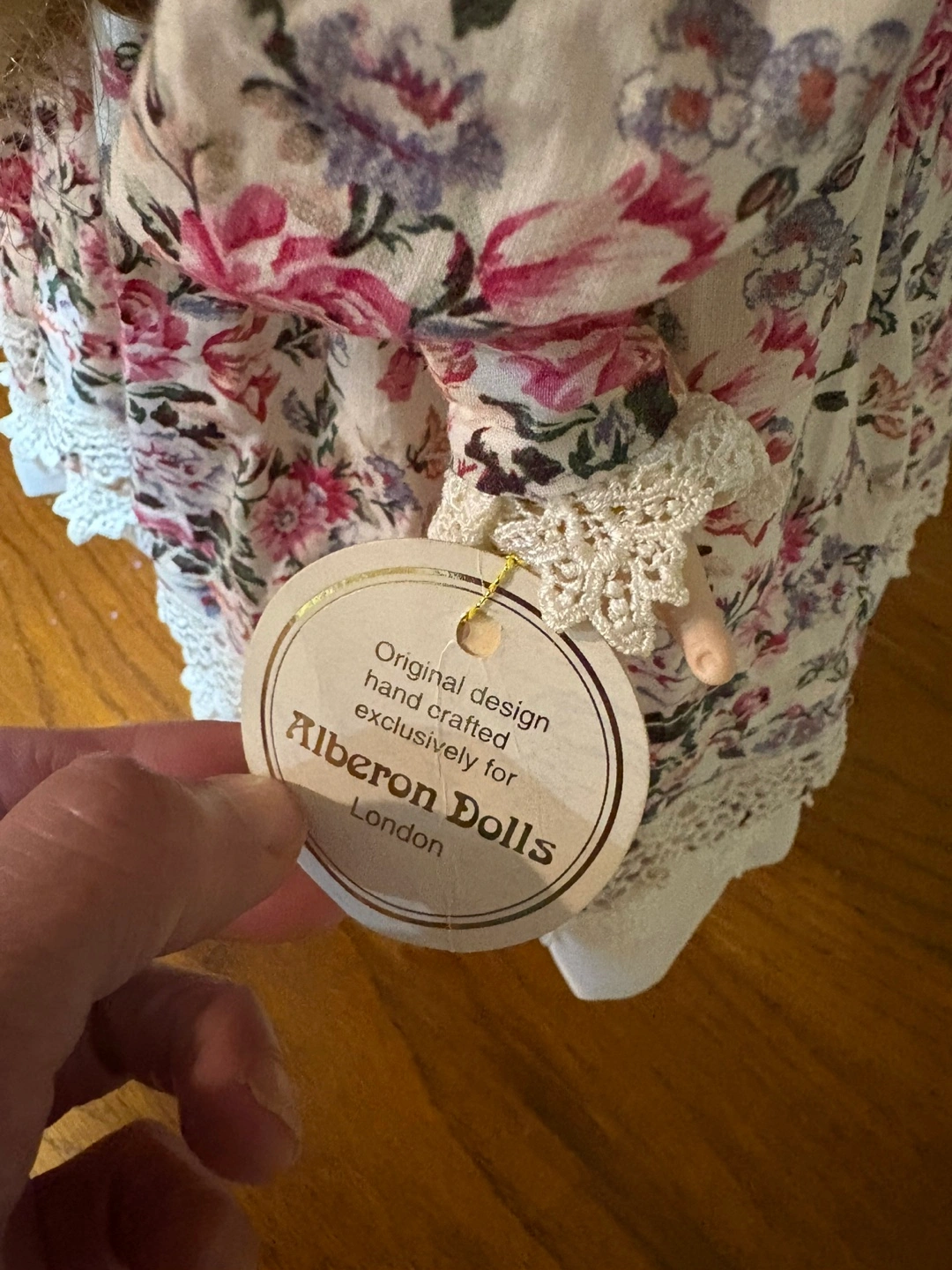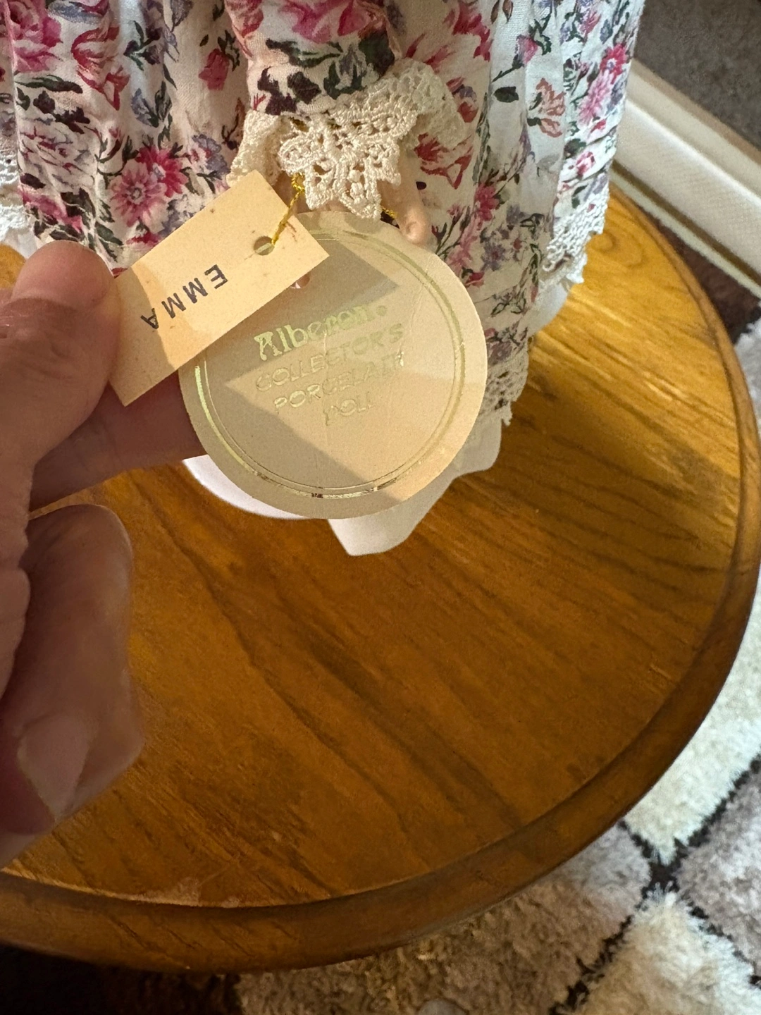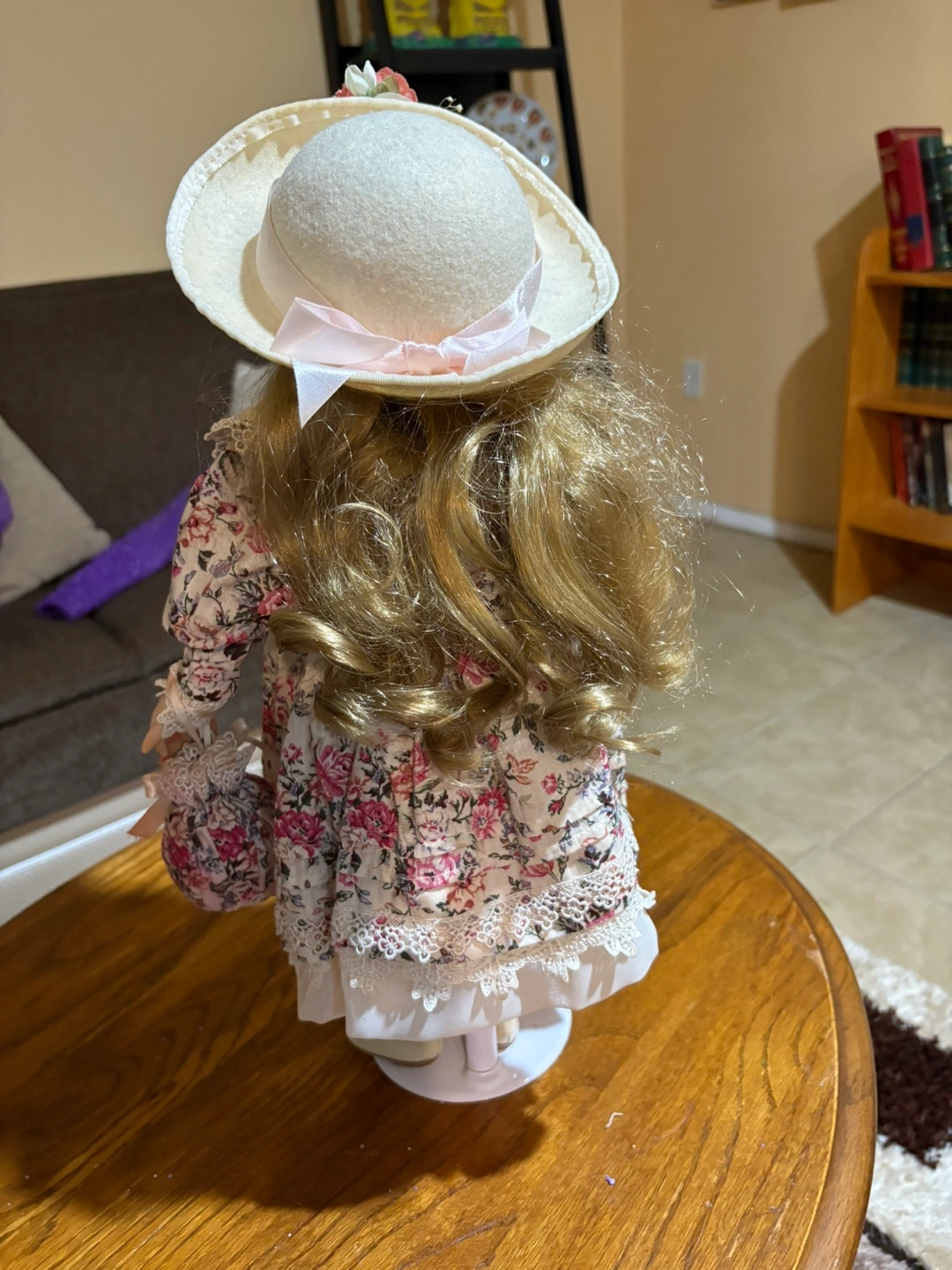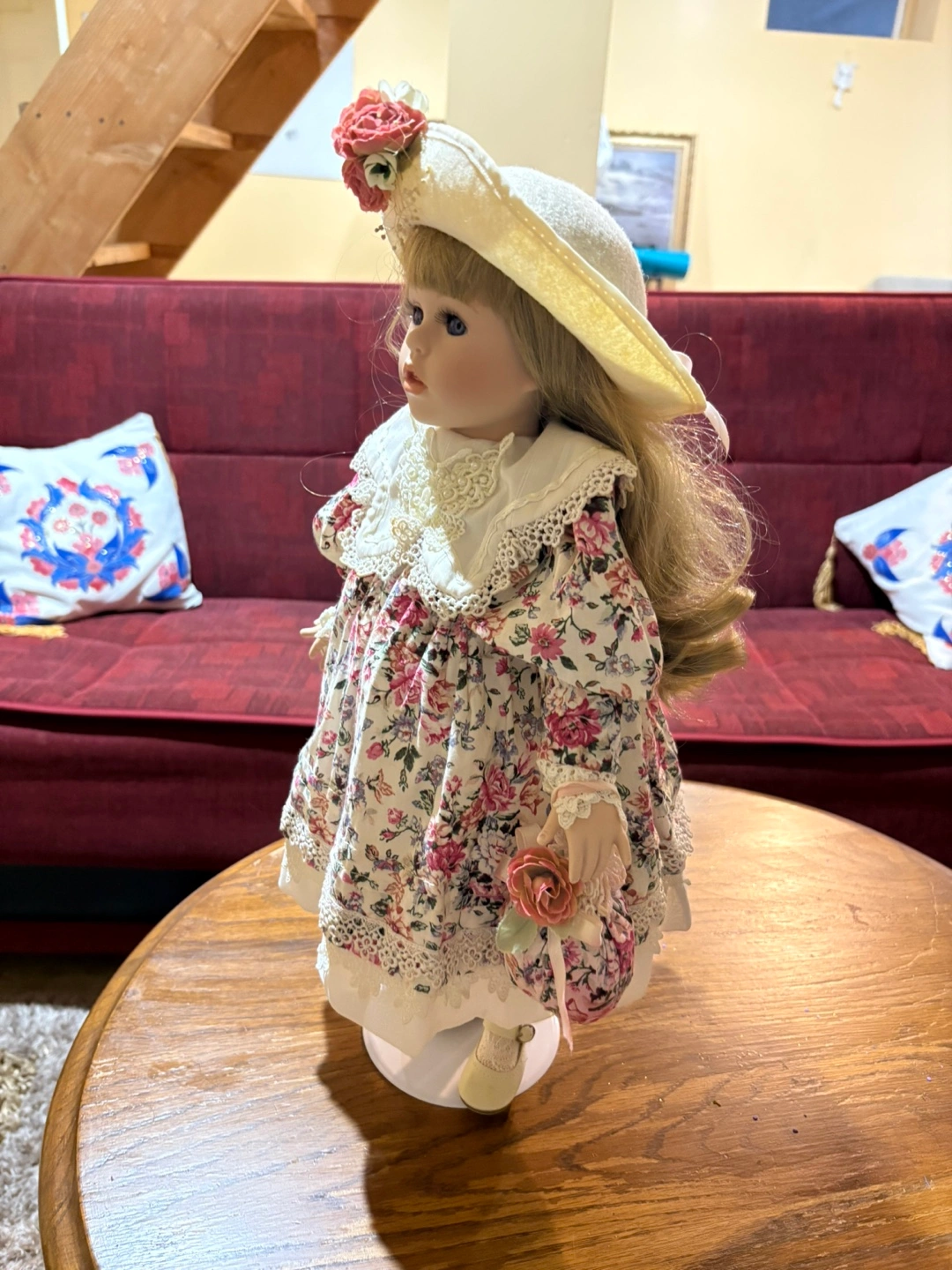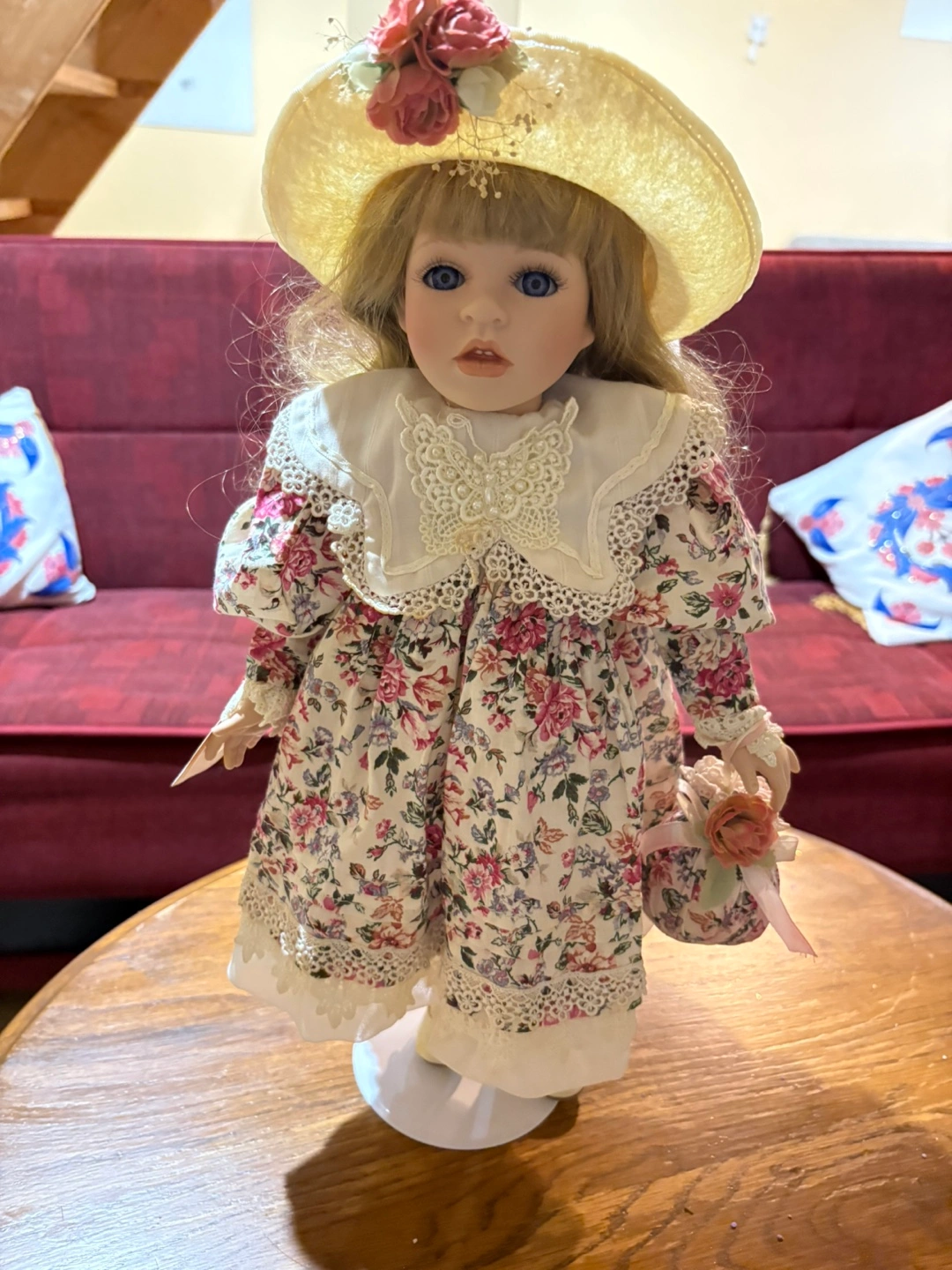 Adorable porcelain doll. Floral dress. Blonde hair. Hat. Small purse. Collectible.