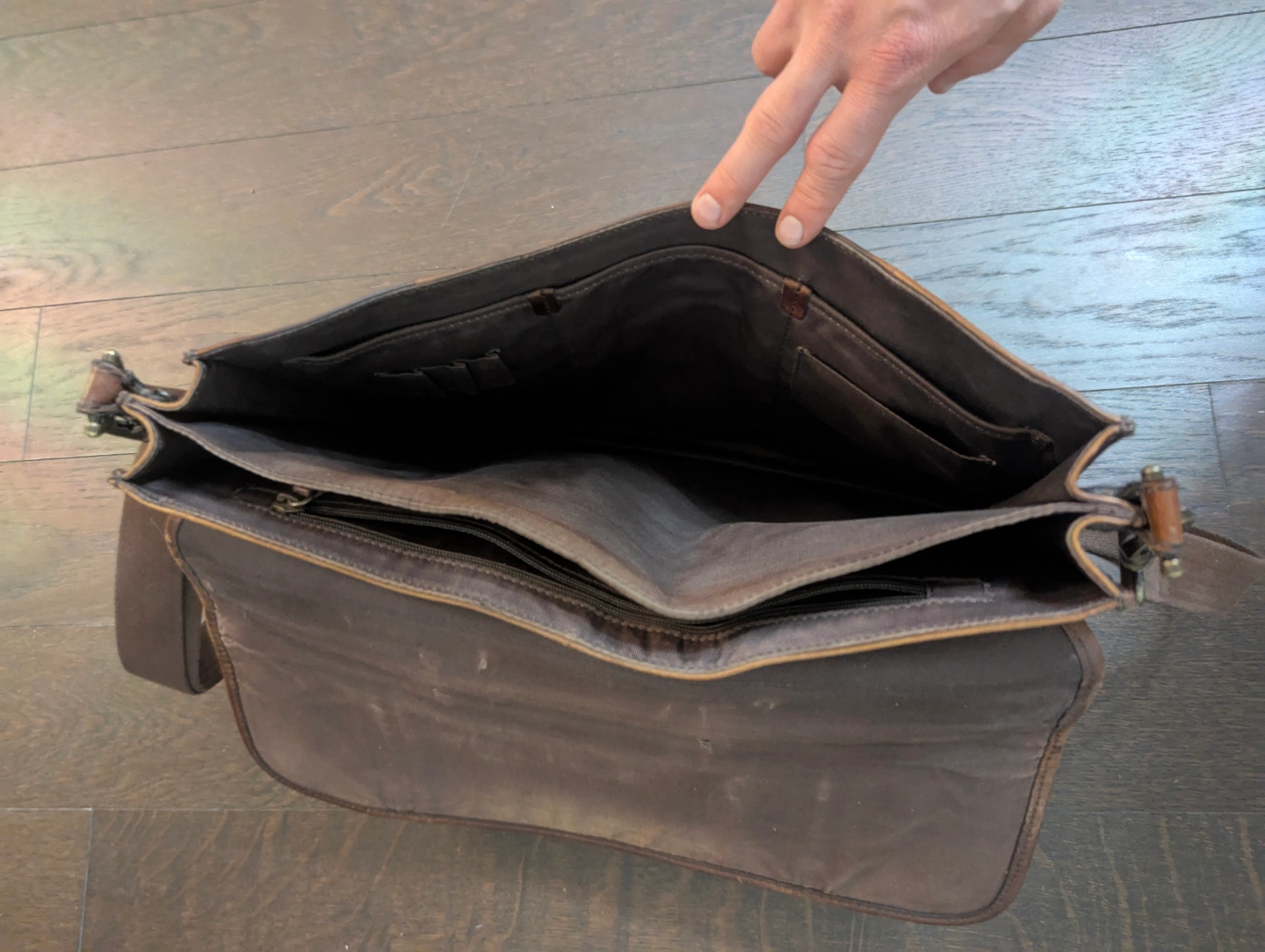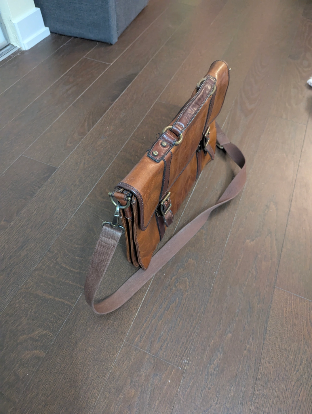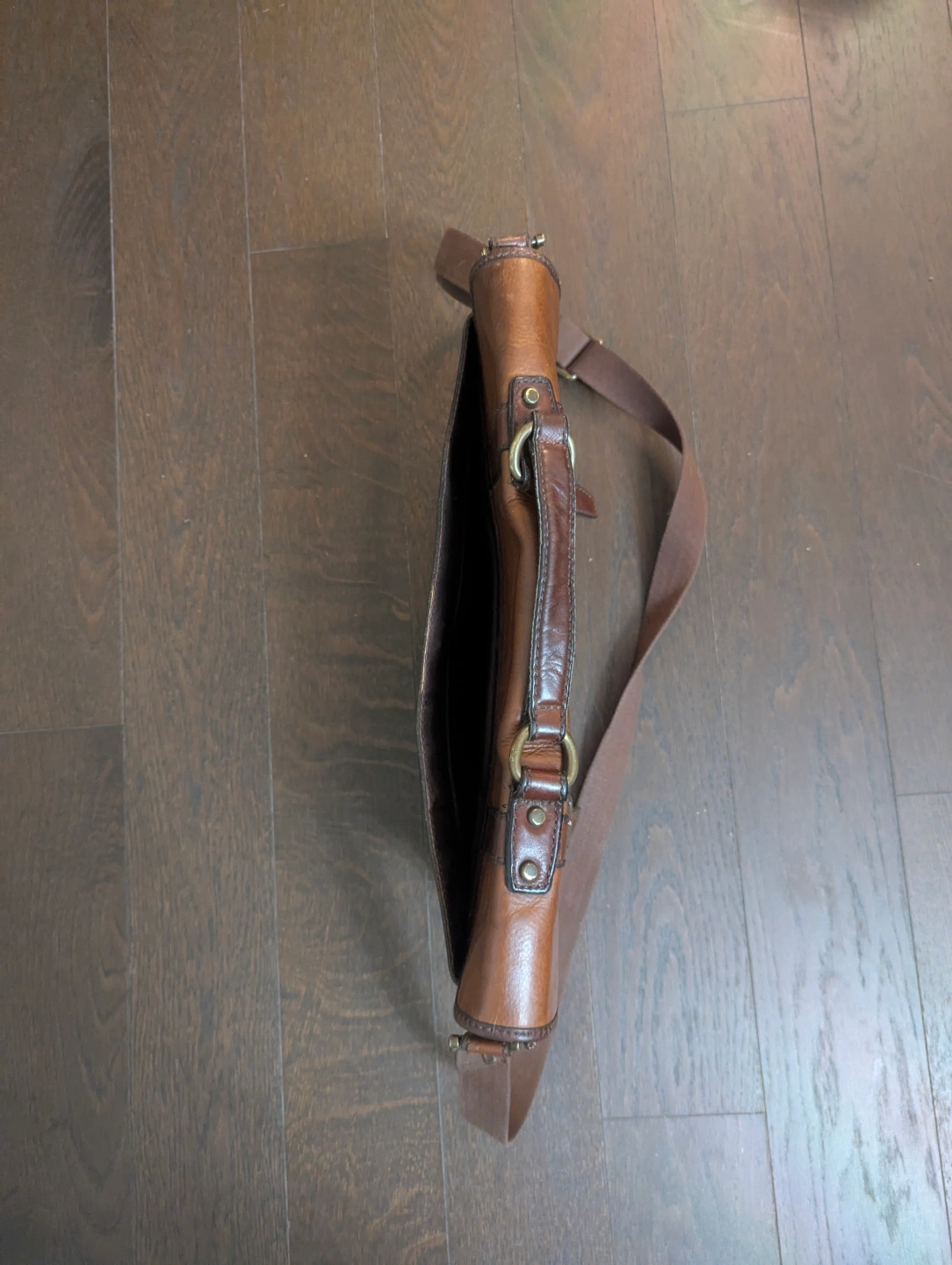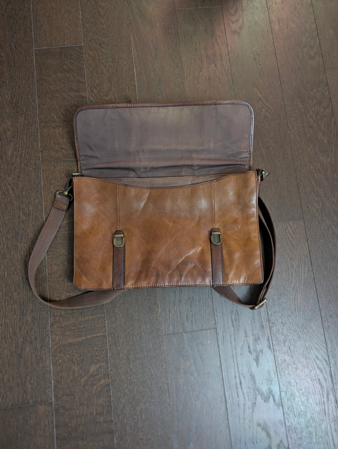 Brown leather messenger bag. Features an adjustable shoulder strap and top handle. Buckle closures. Various interior pockets/compartments.