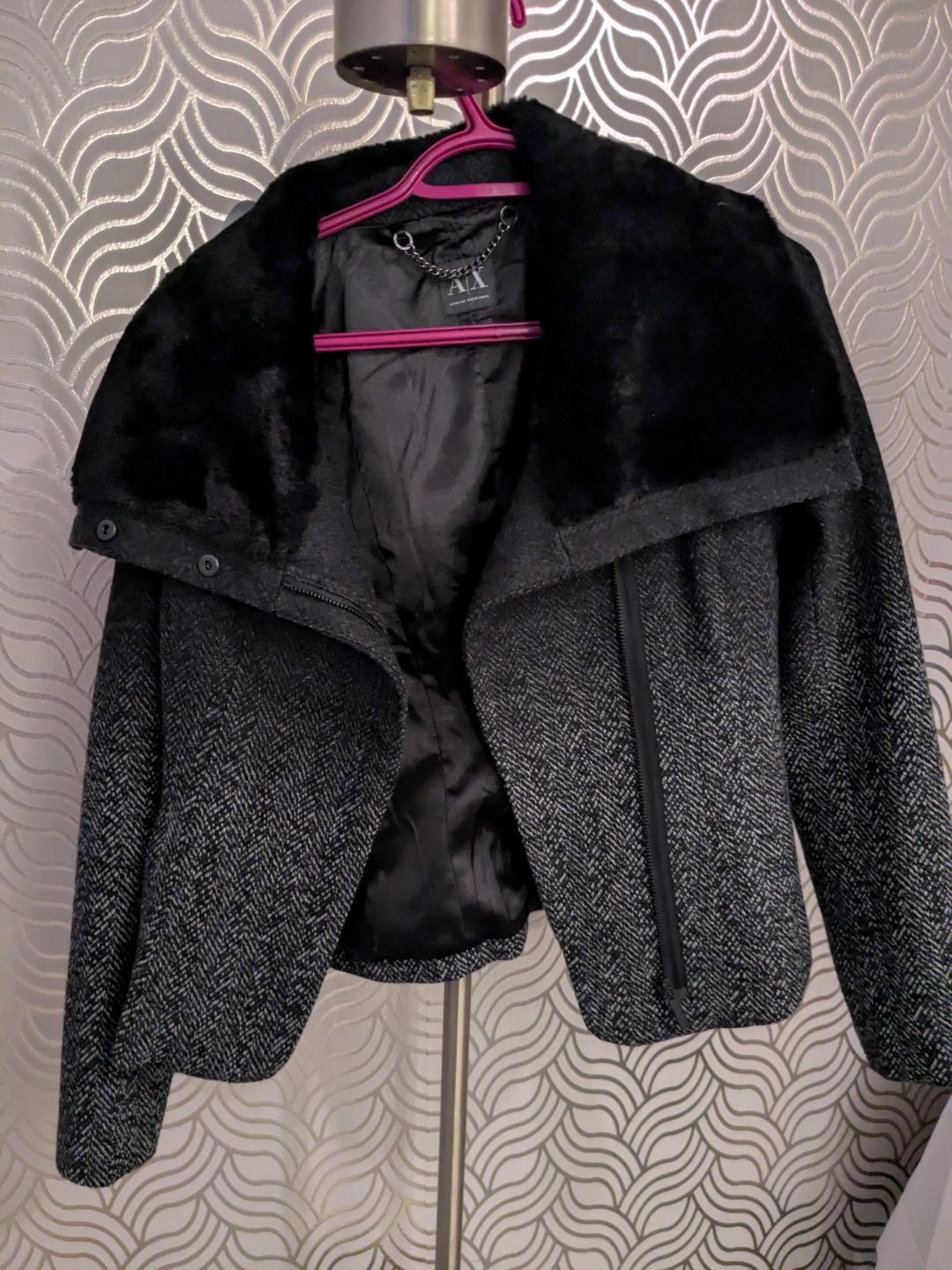 Women's cropped jacket. Black and grey tweed fabric. Features a large faux fur collar. Asymmetrical zip closure.