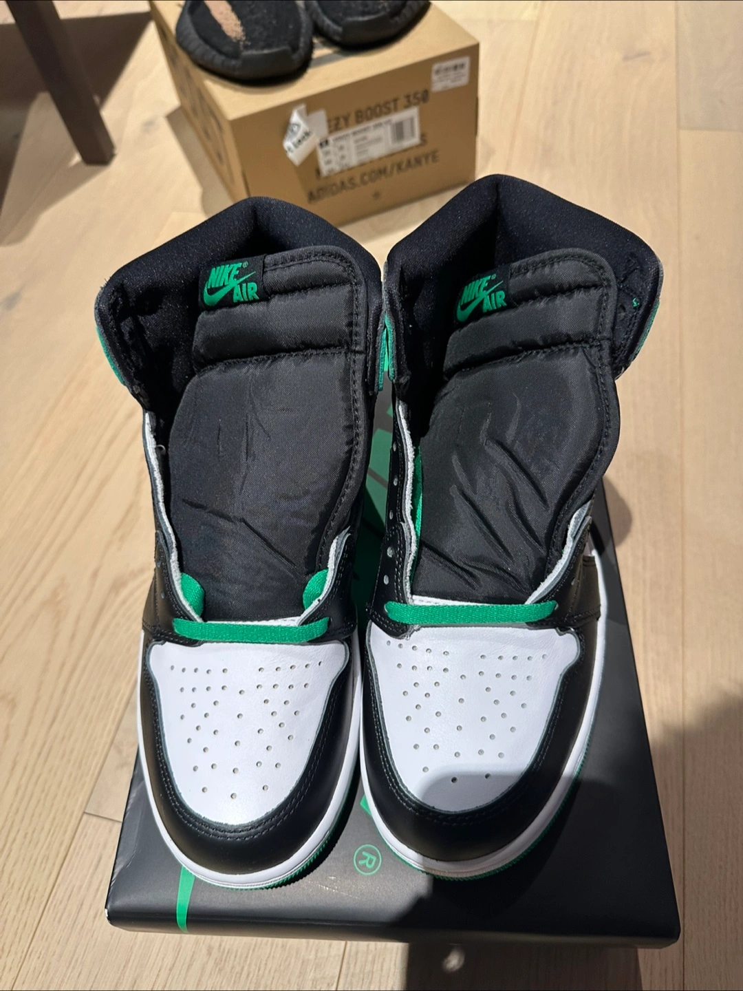 Men's size 10 Air Jordan 1 High OG sneakers. Black, white, and green colourway. New in box. Authentic with footlocker receipt Meetup in Richmond Hill Price slightly negotiable