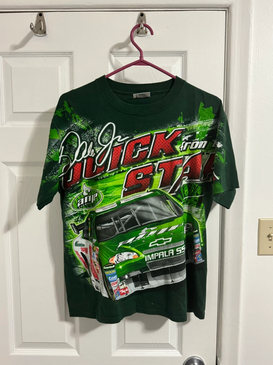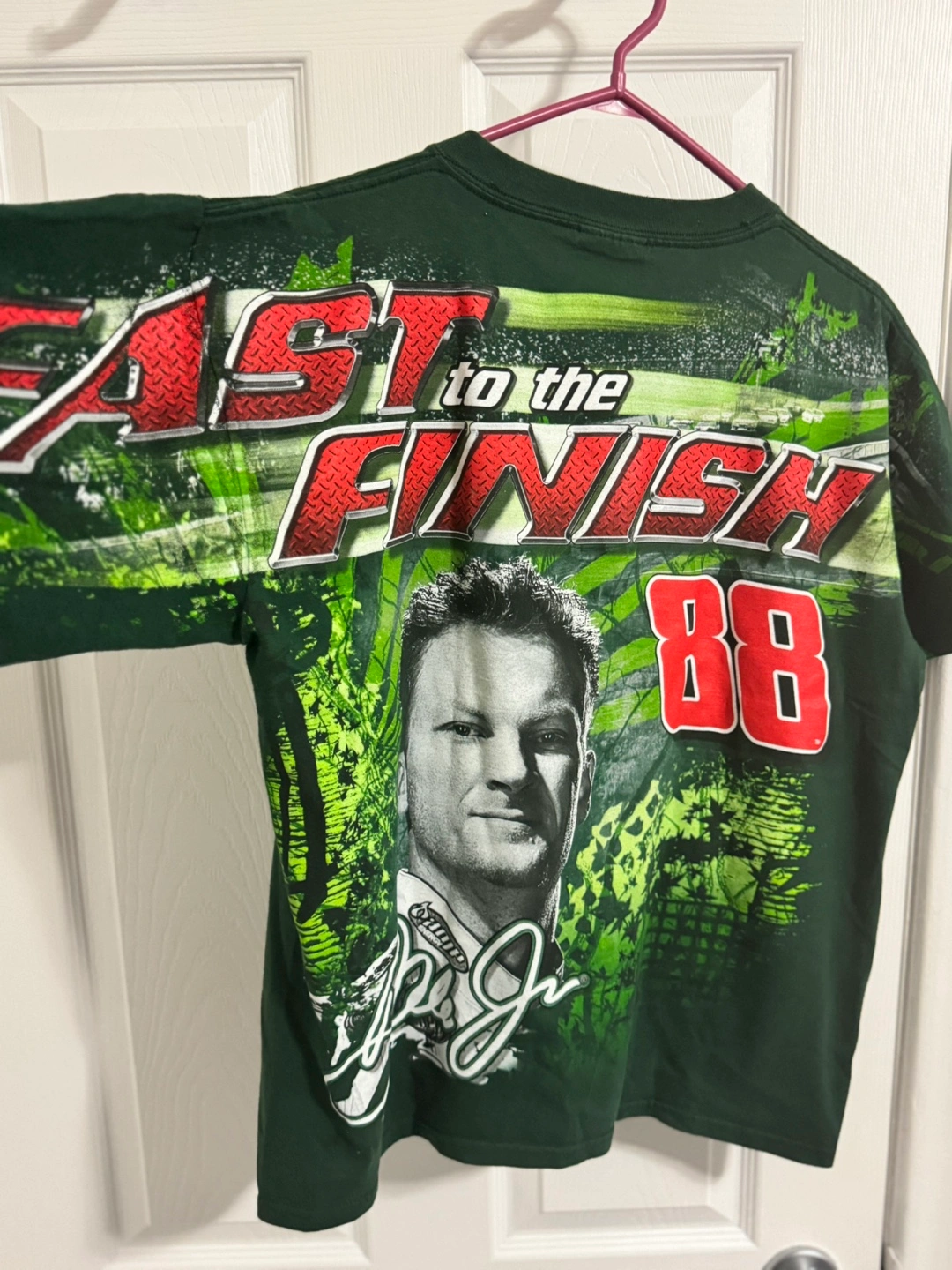 Men's size medium green t-shirt. Features Dale Earnhardt Jr's signature, car #88, and Amp Energy branding. All-over print design. Pre-shrunk 100% cotton.