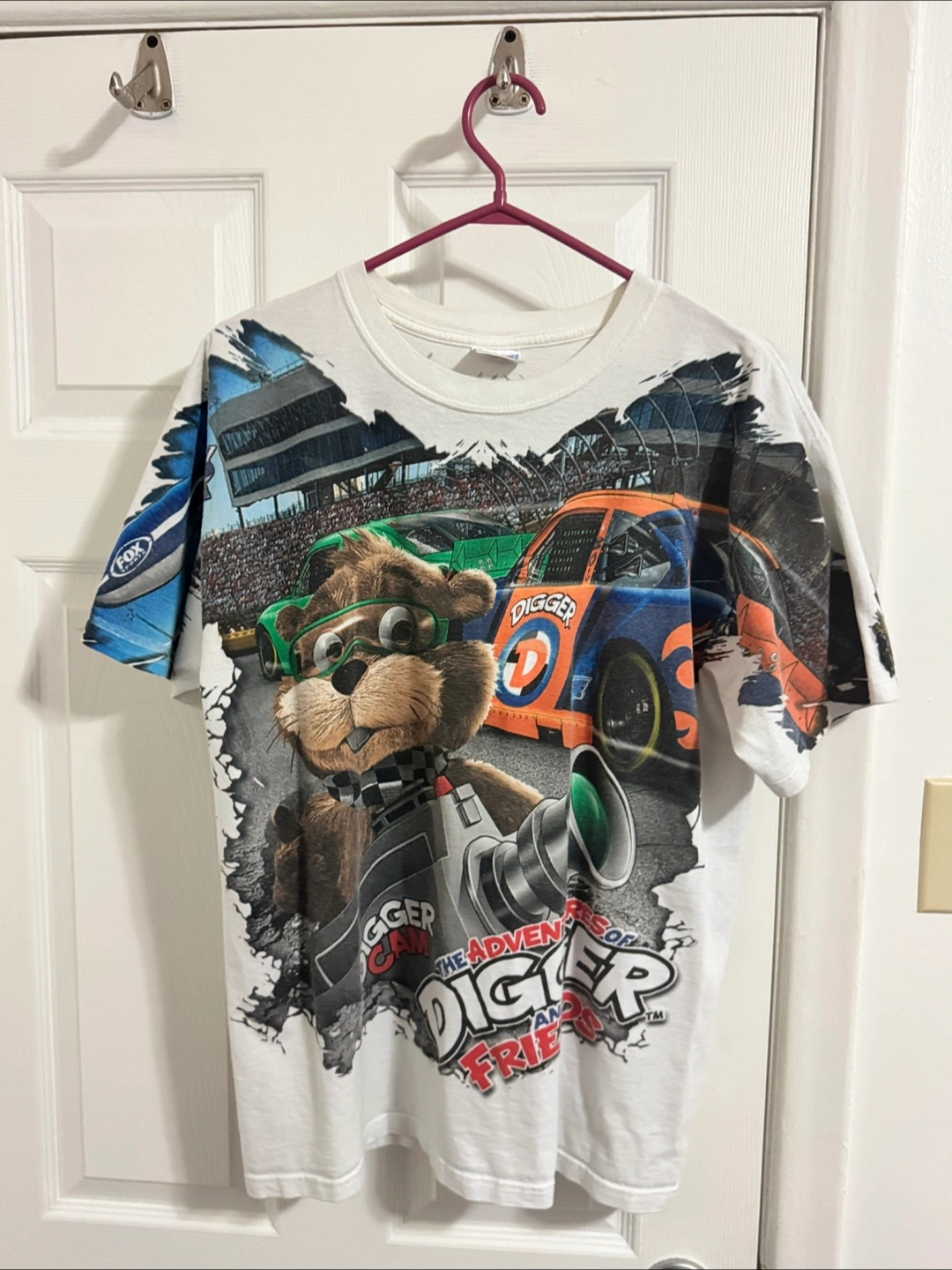 Adult-sized white t-shirt. Features all-over print of Digger the cartoon beaver and race cars. NASCAR Chase Authentics branding. Pre-shrunk 100% cotton. Made in Honduras.