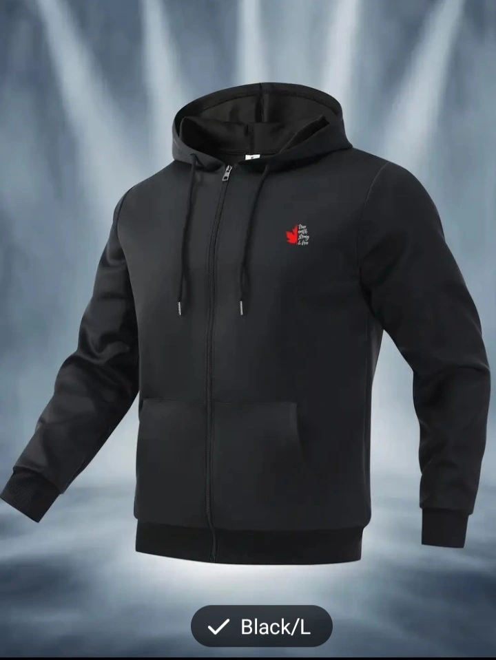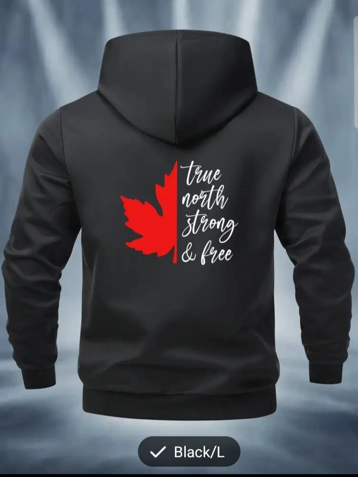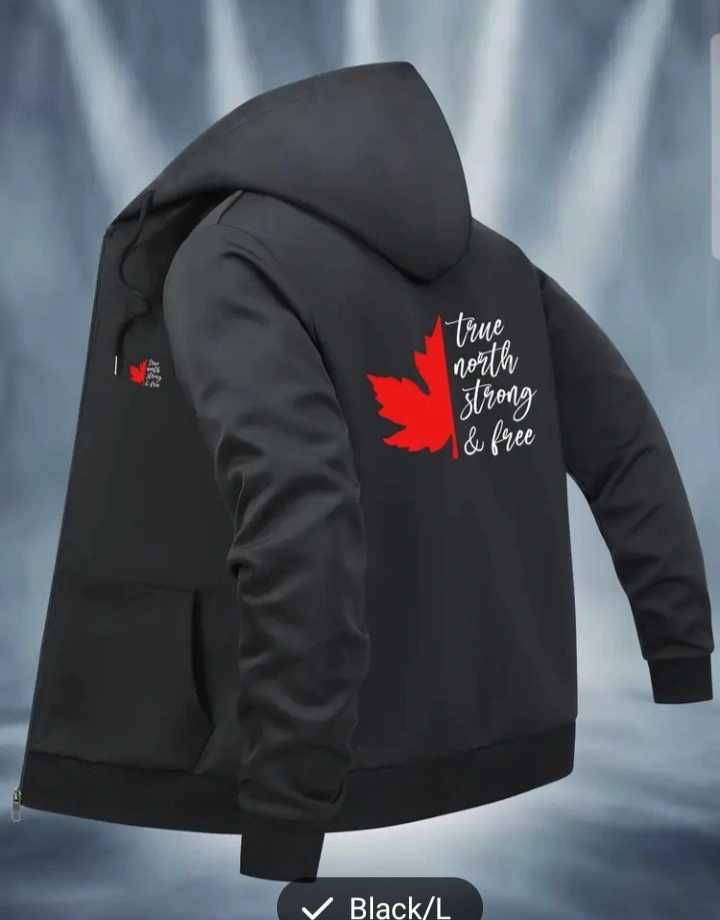 Black zip-up hoodie jacket, size large. Features a red maple leaf and the text "True North Strong & Free" on the back. Small maple leaf logo on the front. light and comfortable.