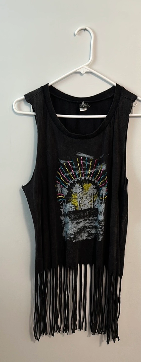 Black sleeveless cropped tank top. Features a beach scene graphic with colourful beaded accents. Fringed hem. Lightweight and comfortable. Great for summer.