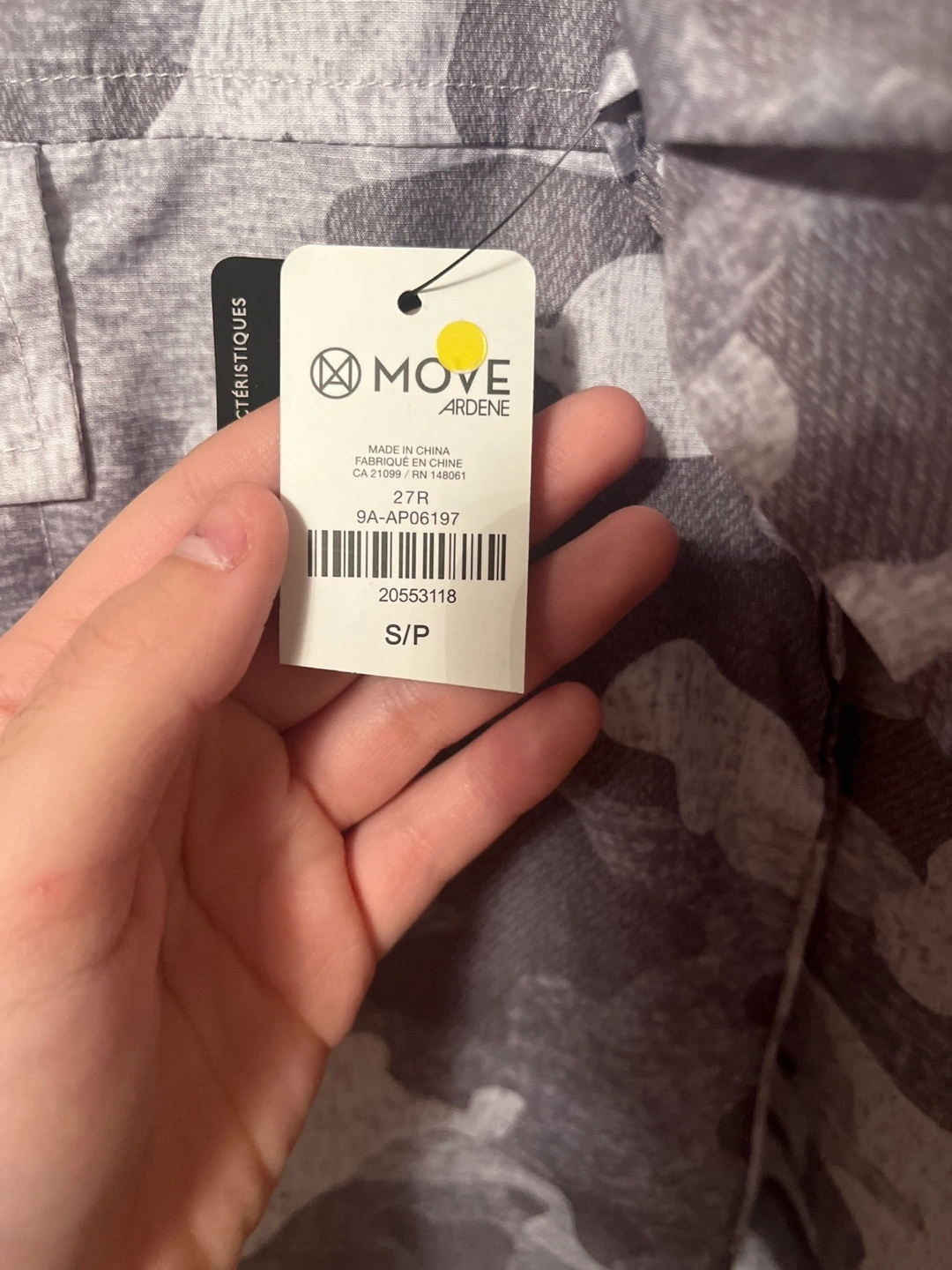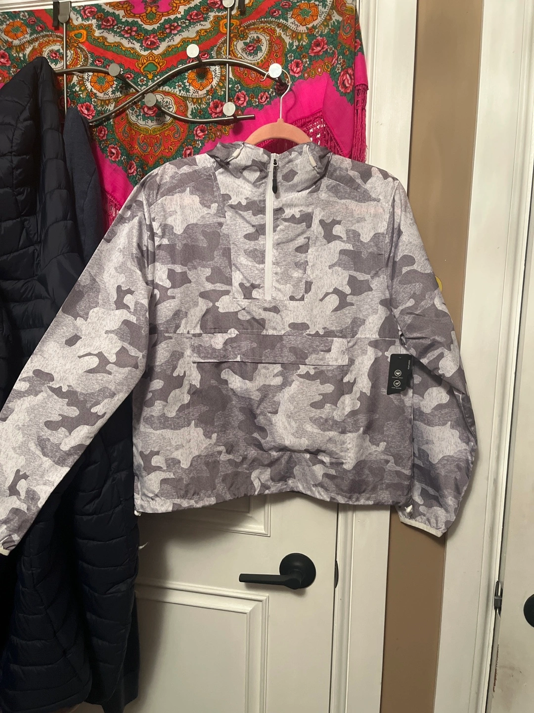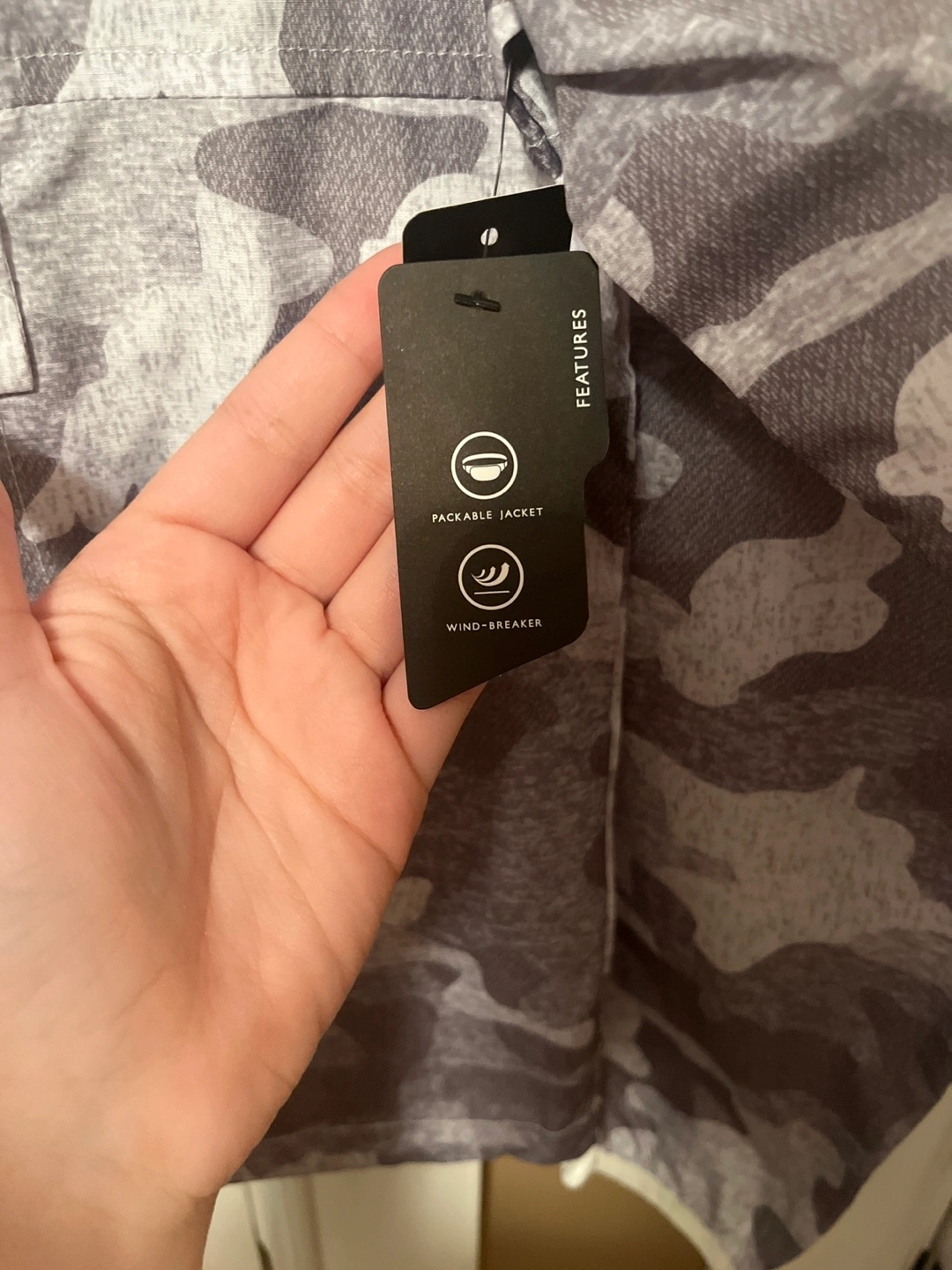Grey camo print windbreaker. Packable design. Features a hood and zipper closure. Size small. Still has tags never used