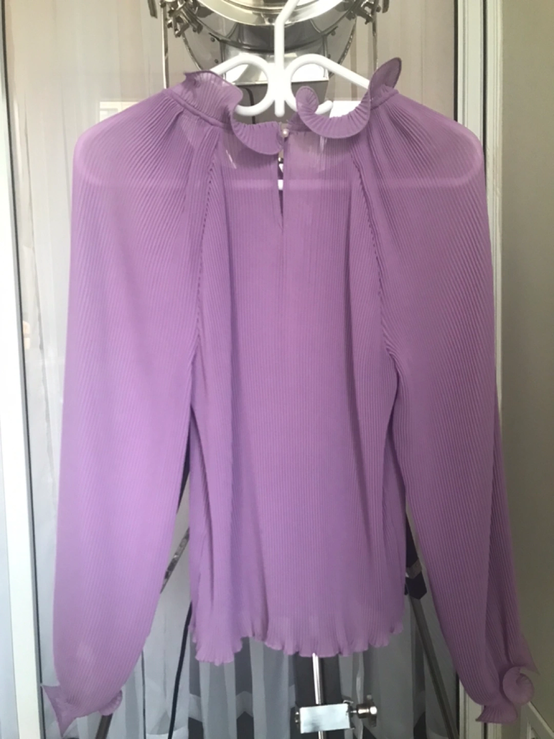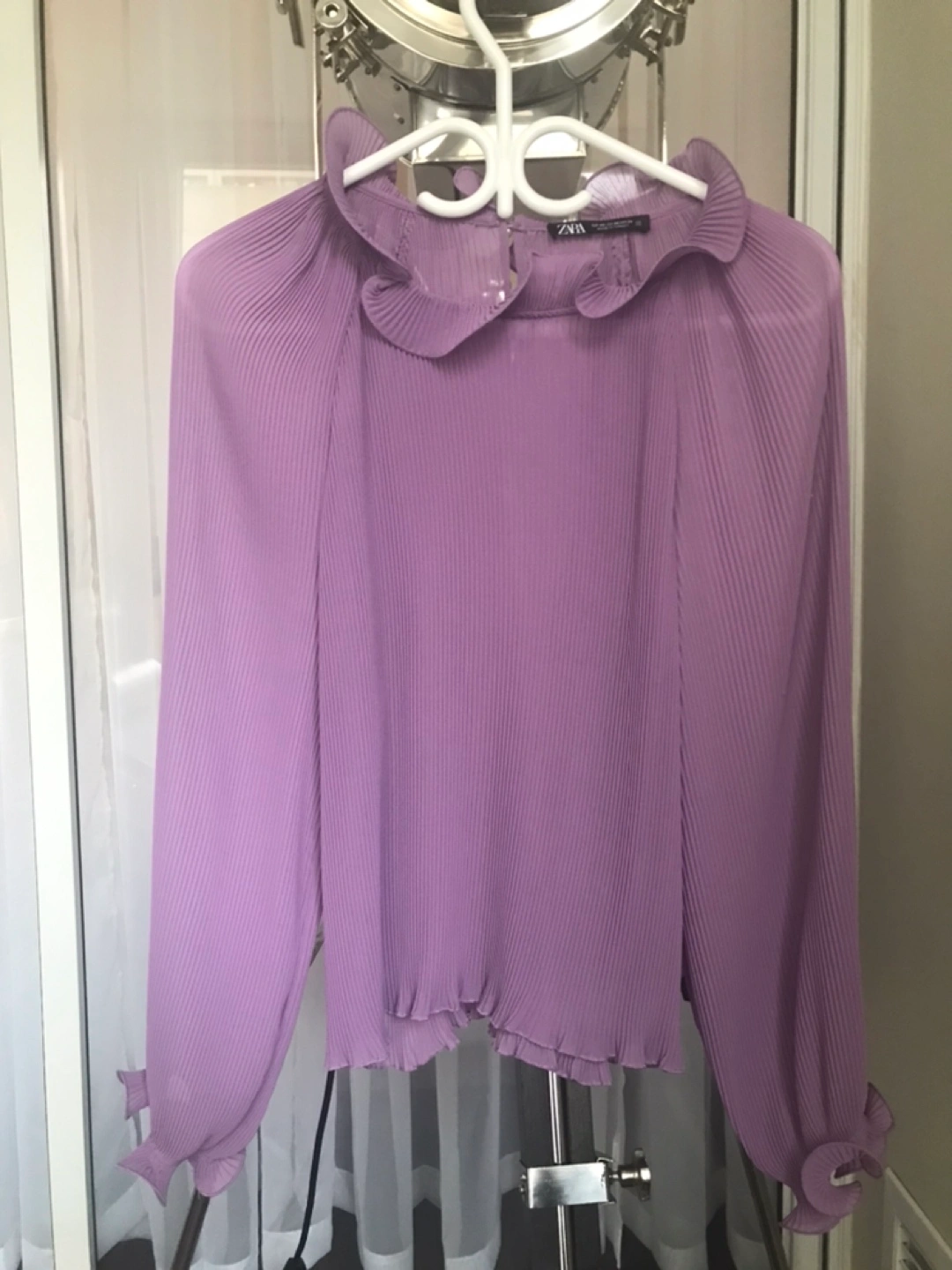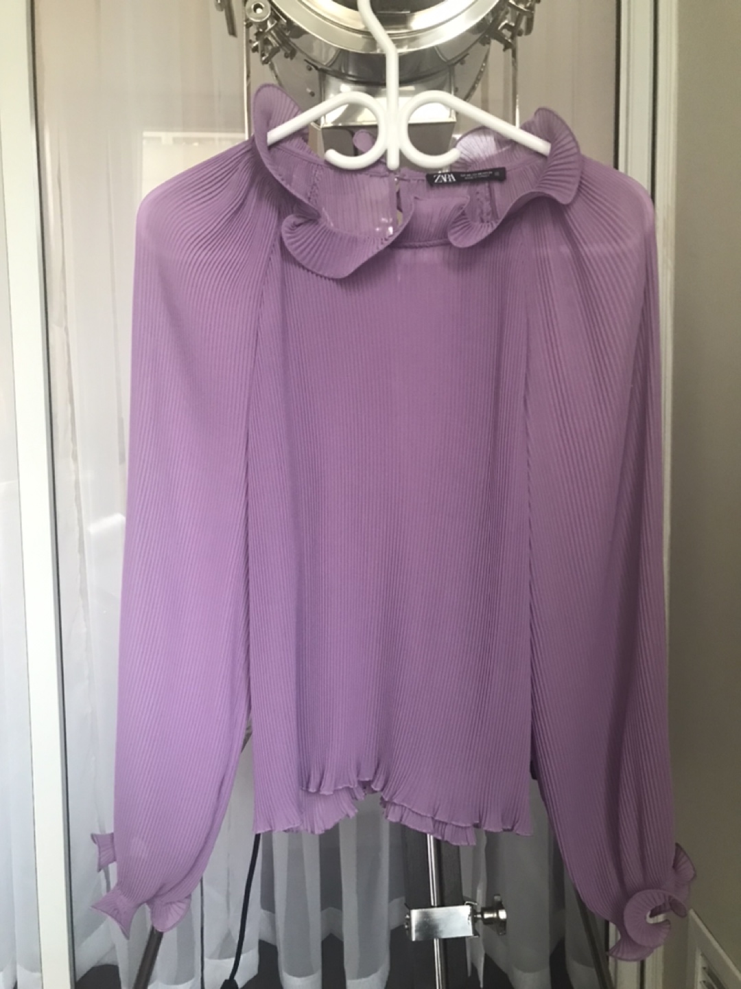 Zara Women’s sheer accordion pleats blouse, ruffles on collar and sleeves, pearl button closure at the back, lavender/mauve, size XS-S, never worn