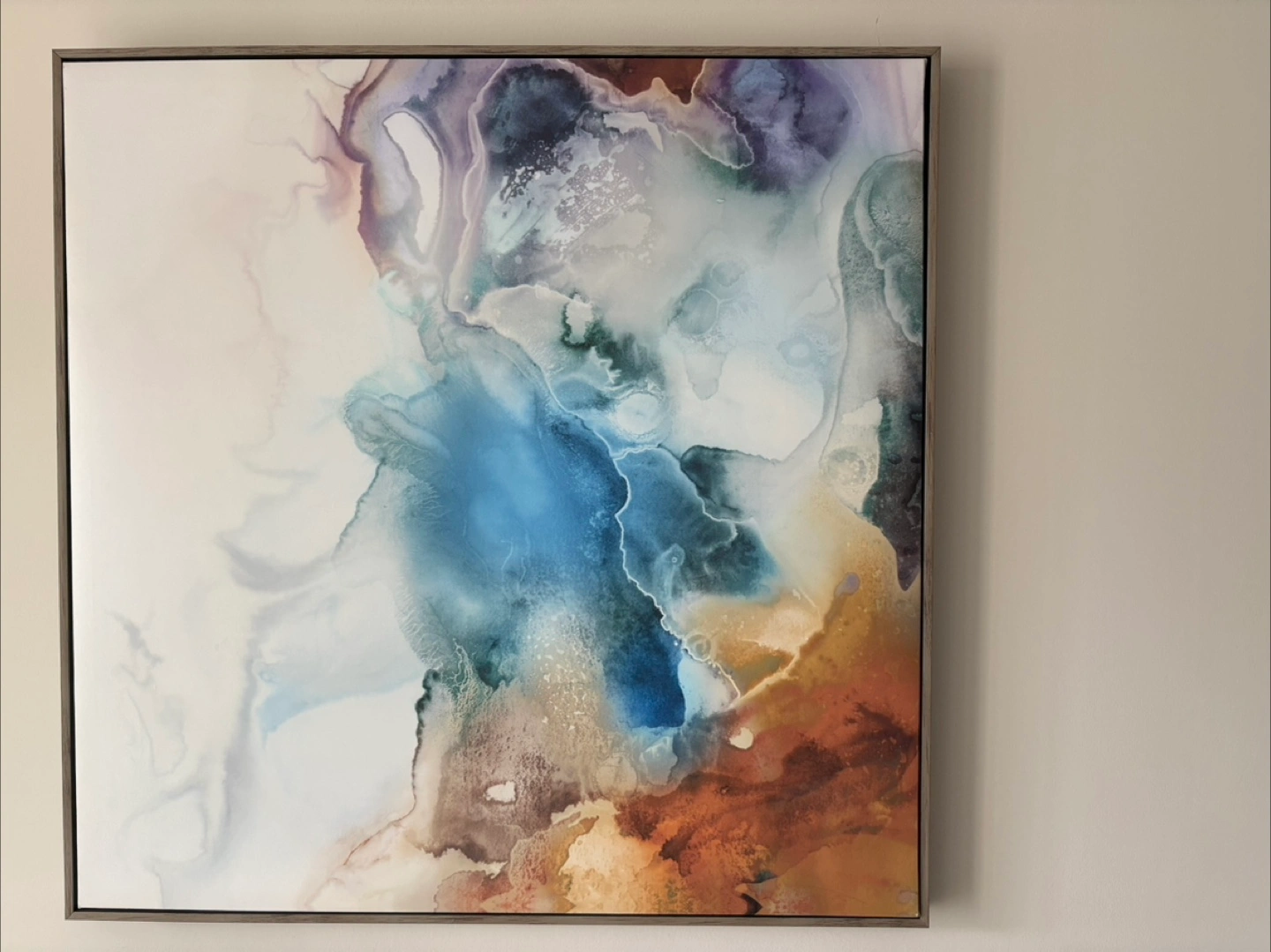 Large framed canvas print. Beautiful abstract artwork. Blues, browns, and creams. Modern minimalist style. Perfect for living room or bedroom.