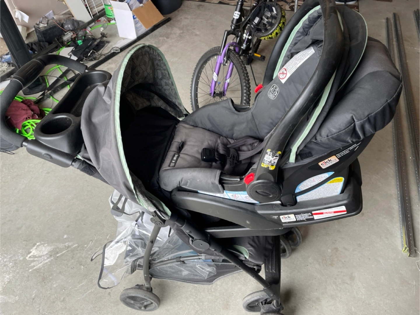 Infant car seat and stroller combo. Black and green colour scheme. Cup holders included. Used, some wear and tear.