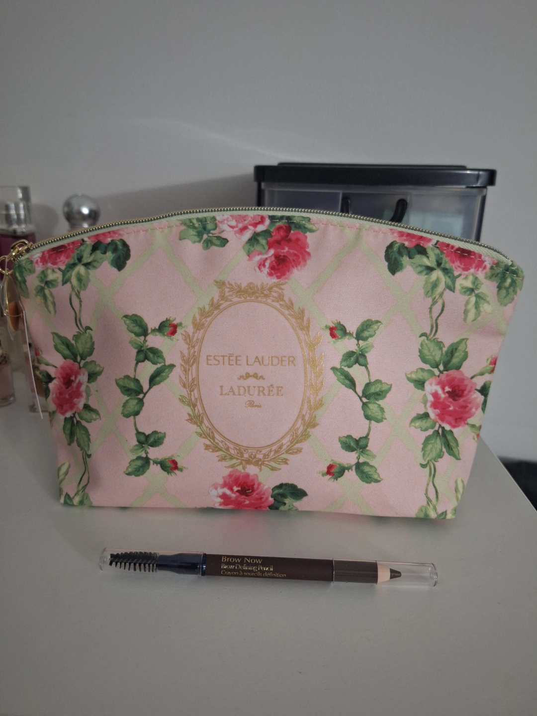 Adorable pink floral makeup bag. Features Estée Lauder and Ladurée branding. Includes a dark brown Estée Lauder Brow Now Defining Pencil.
