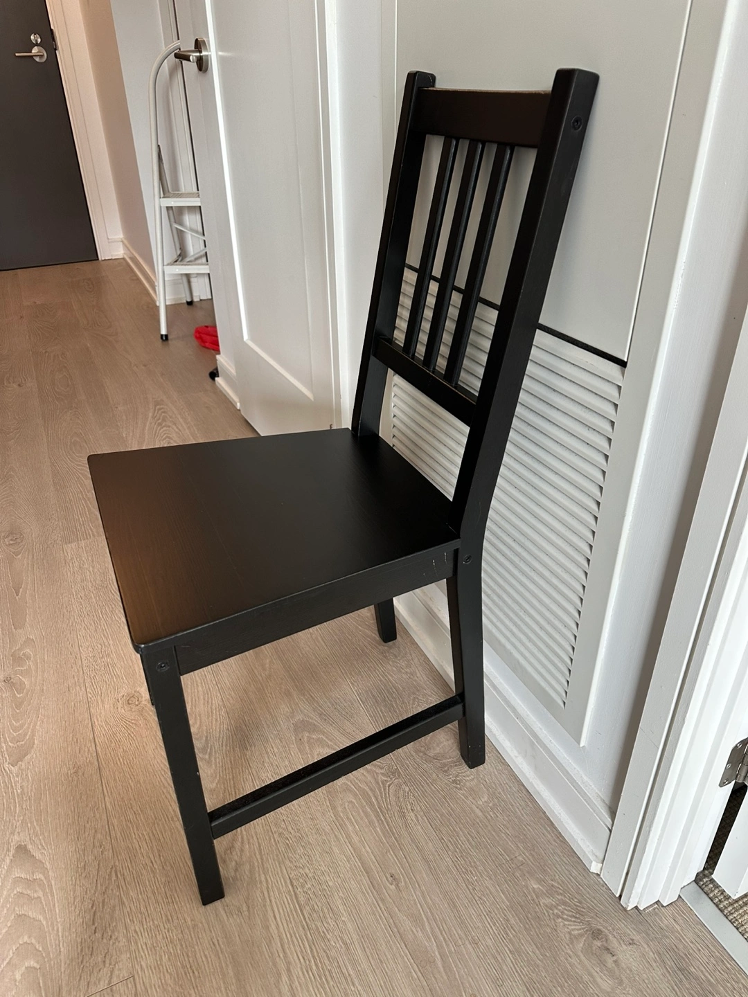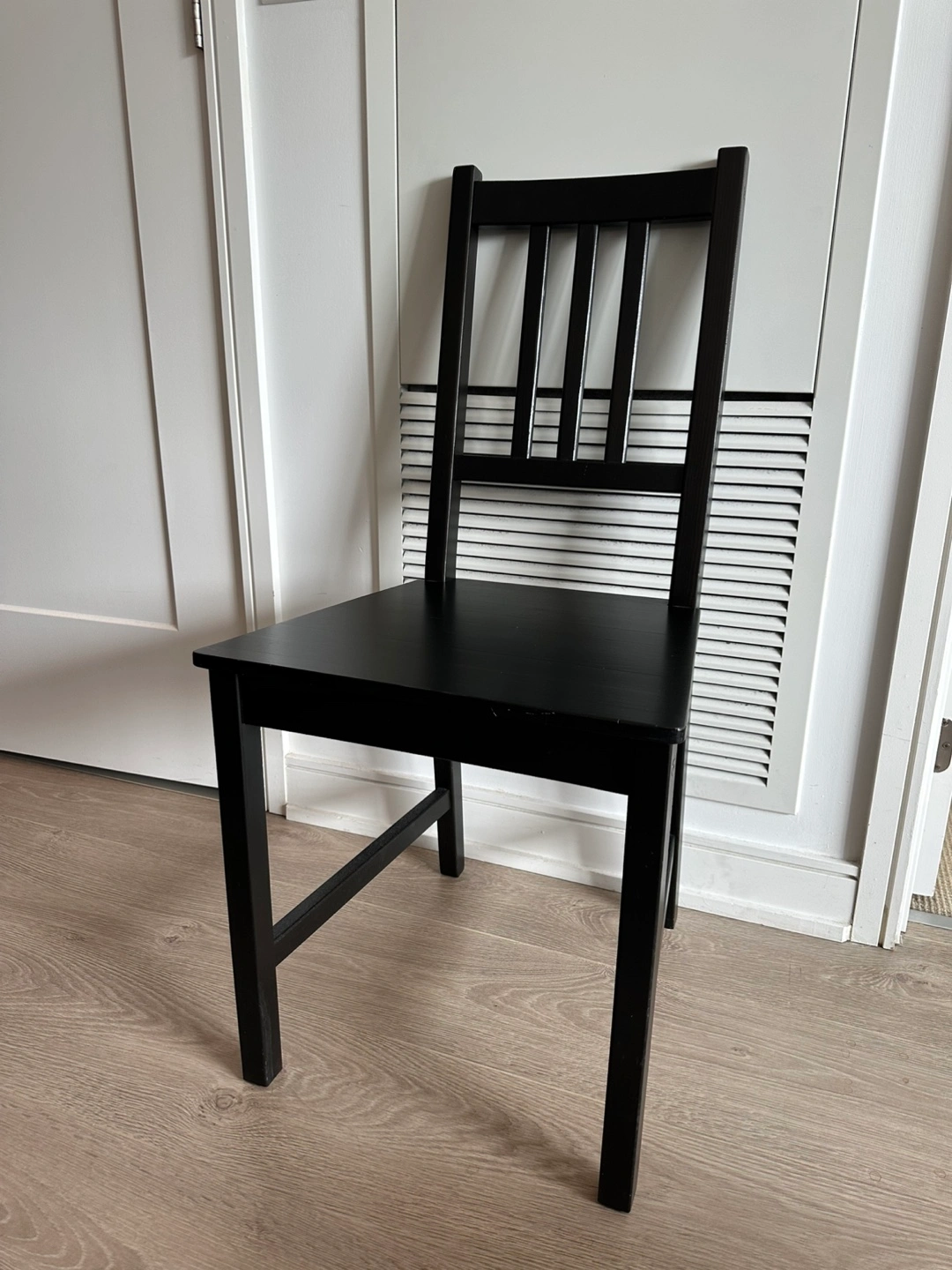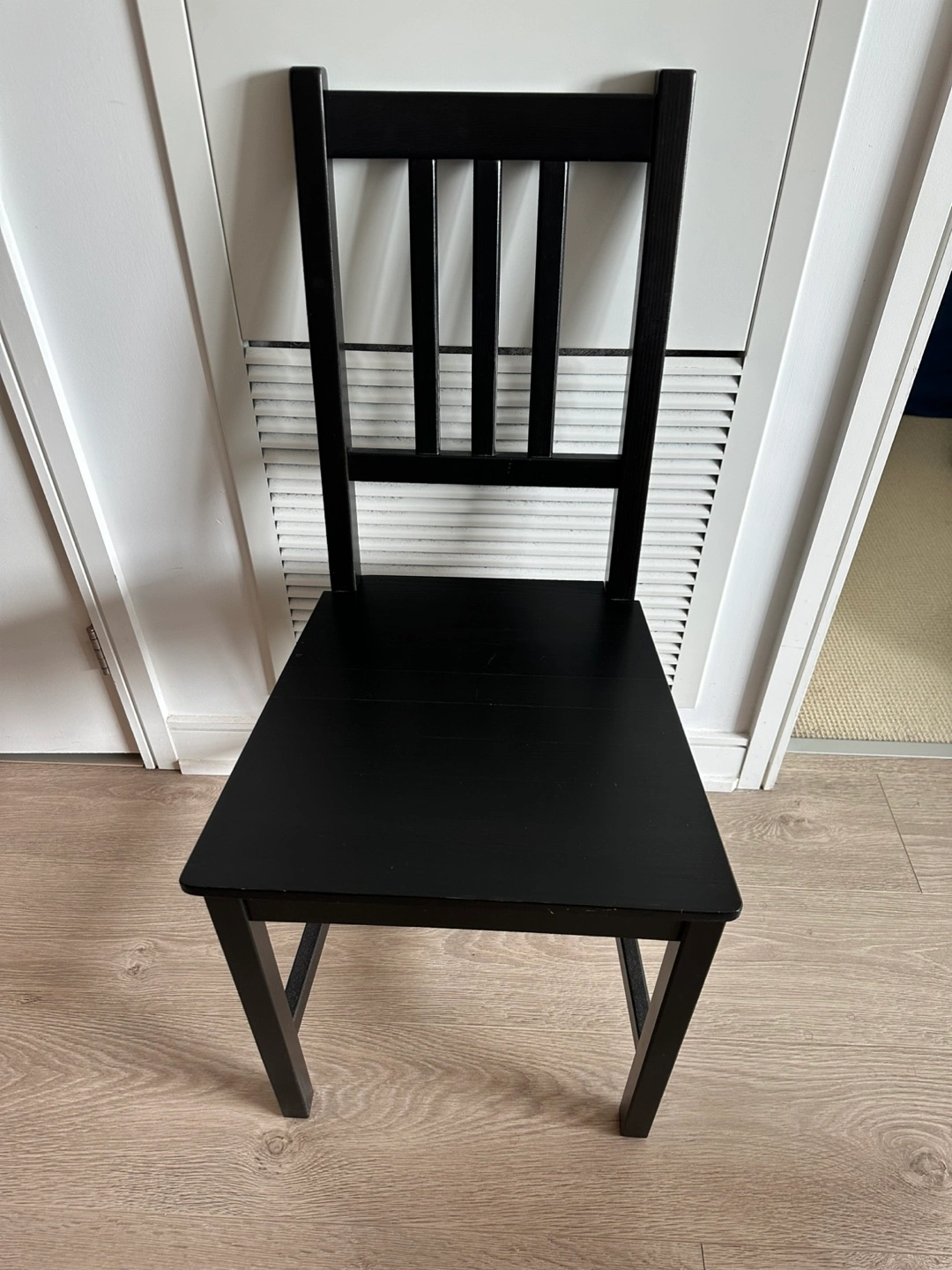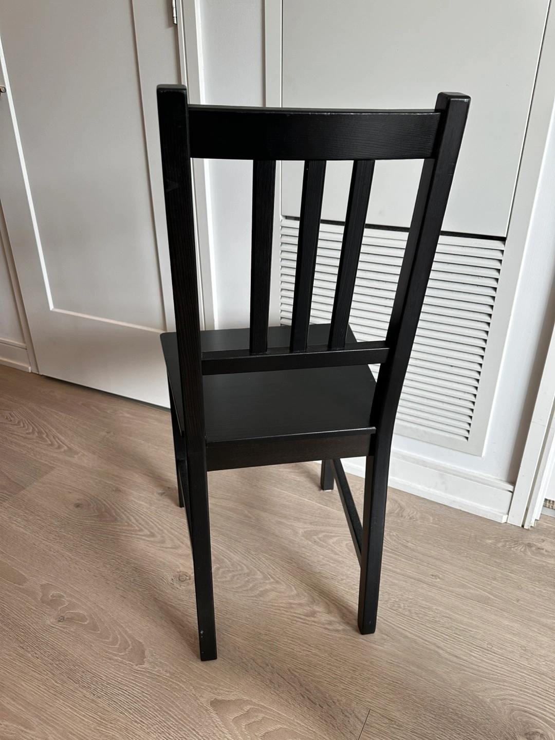 Simple black wooden chair. Suitable for kitchen or dining room. Solid wood construction. Minimalist design.