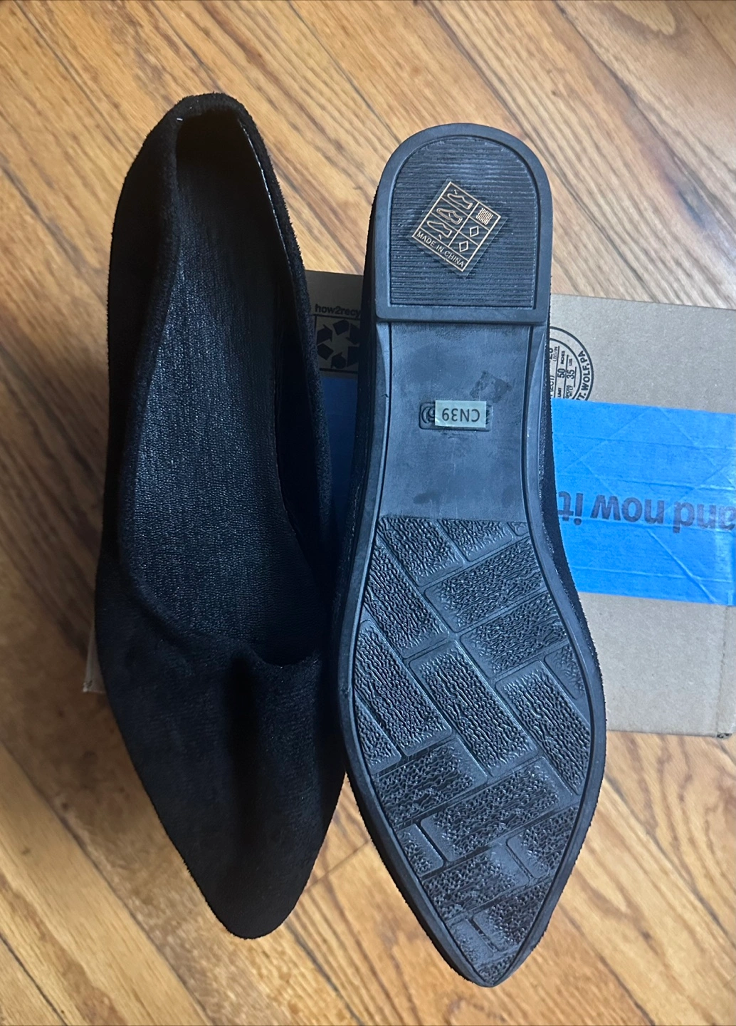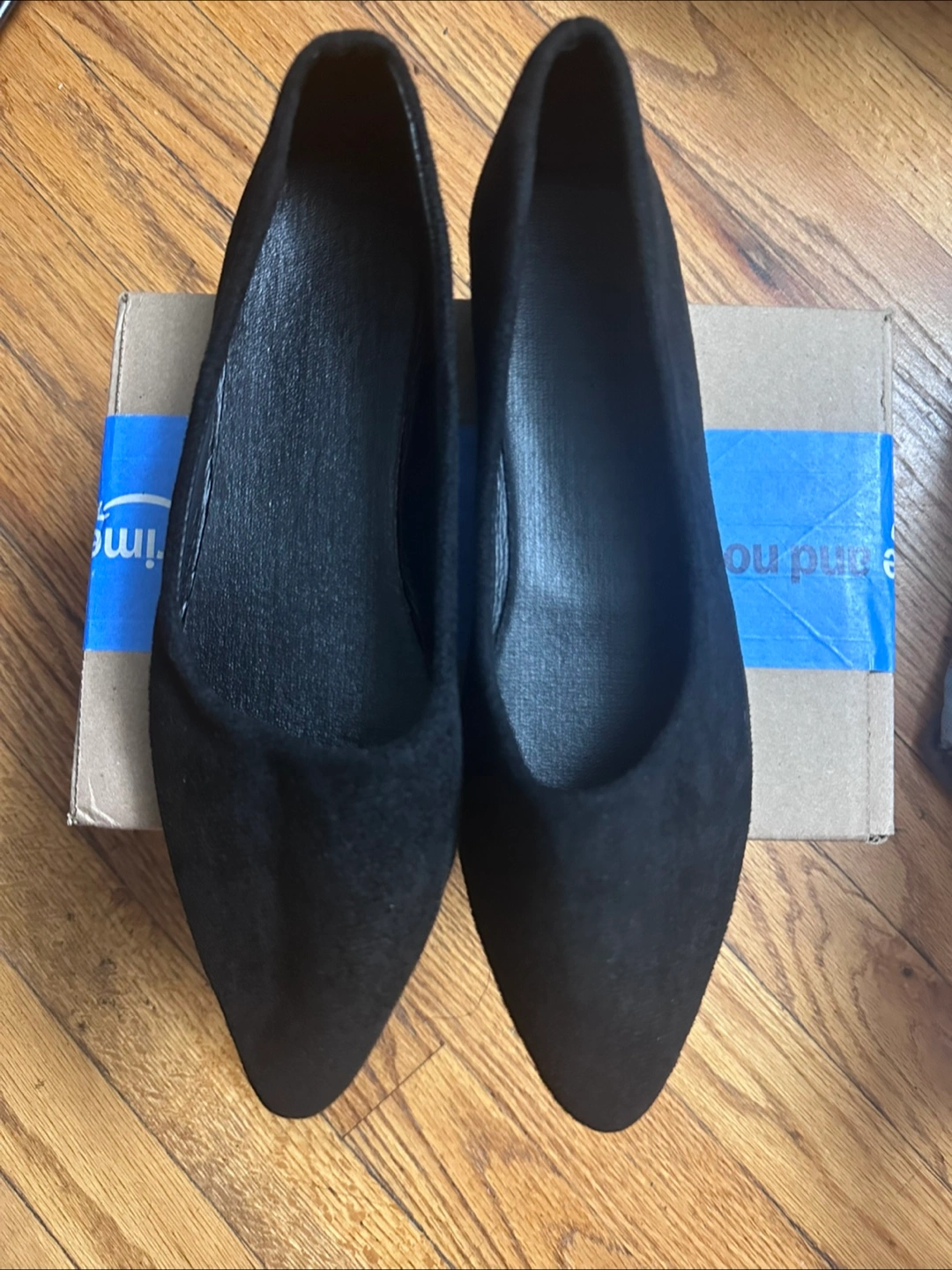 Pair of women's black suede flats. Pointed-toe design.