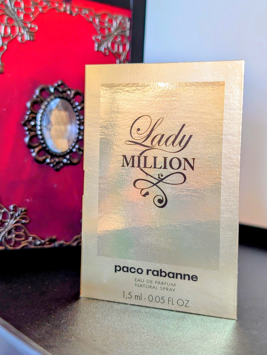 1.5 ml sample of Lady Million perfume. Eau de parfum natural spray. Gold packaging.